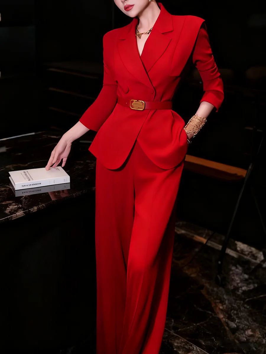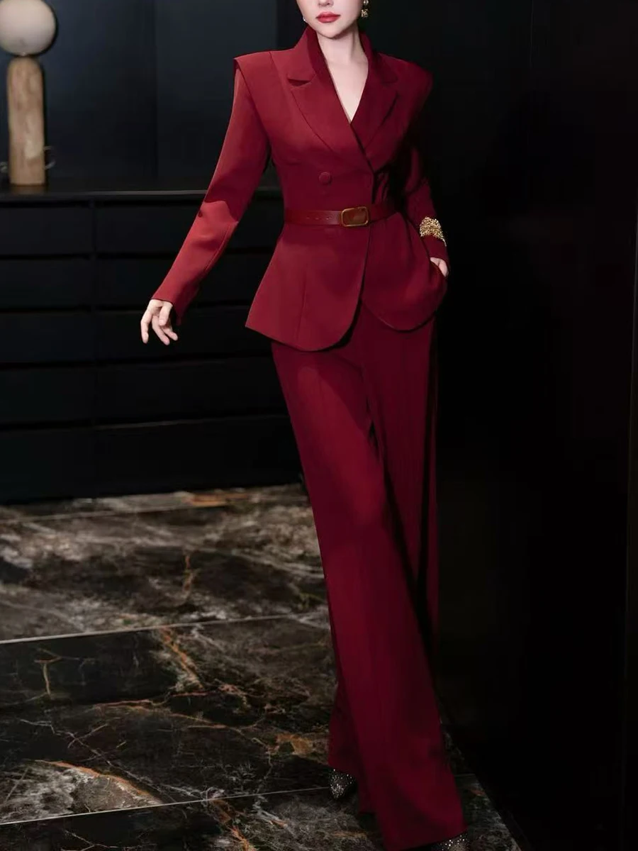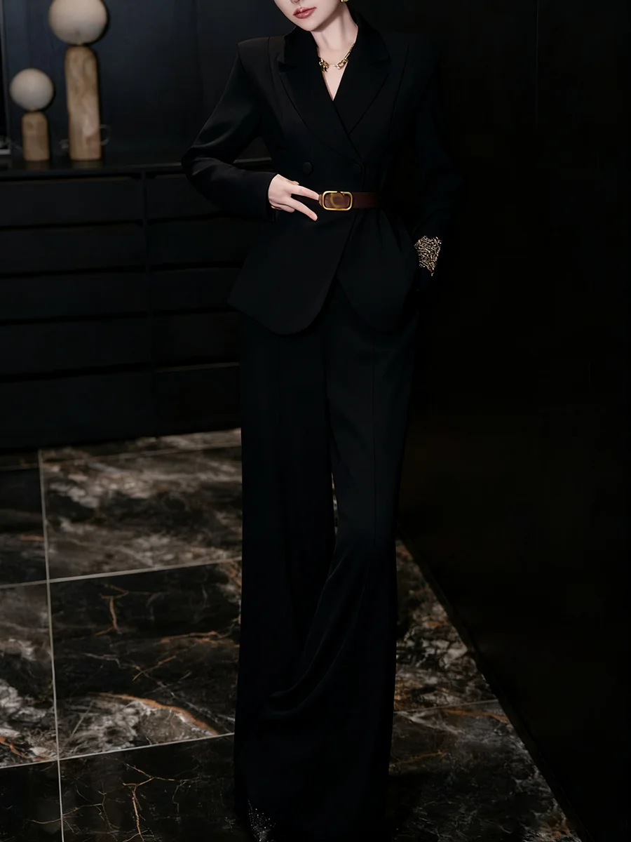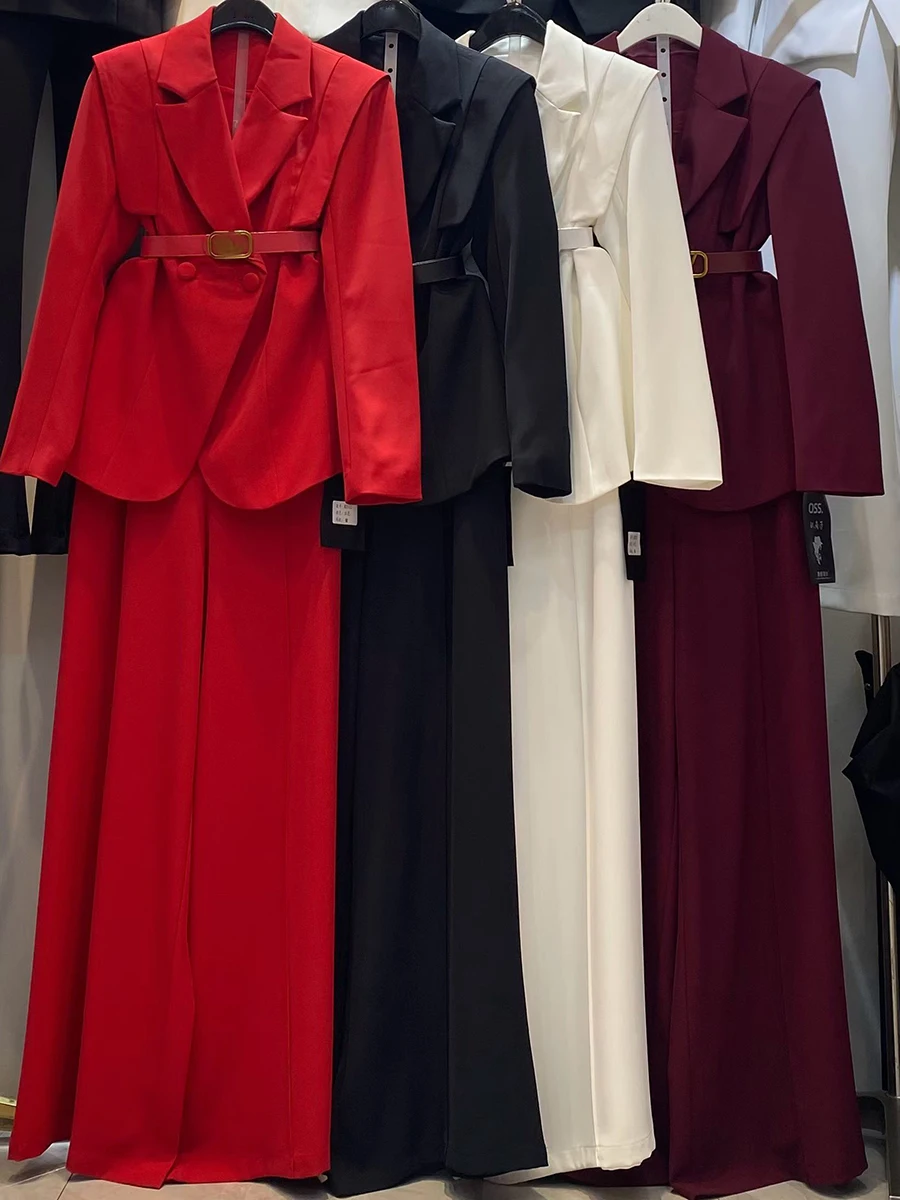TWOTWINSTYLE Solid Two Piece Sets for Women Lapel Long Sleeves Spliced Belt Top Wide Leg Pant Temperament Set Female Clothing