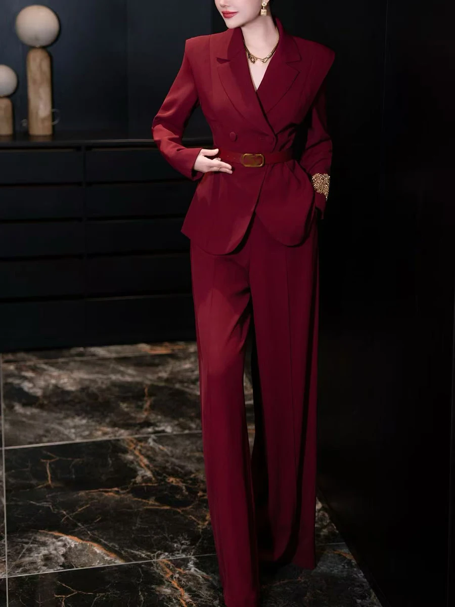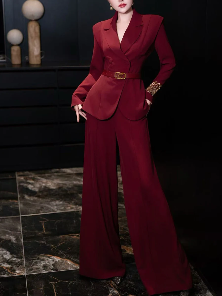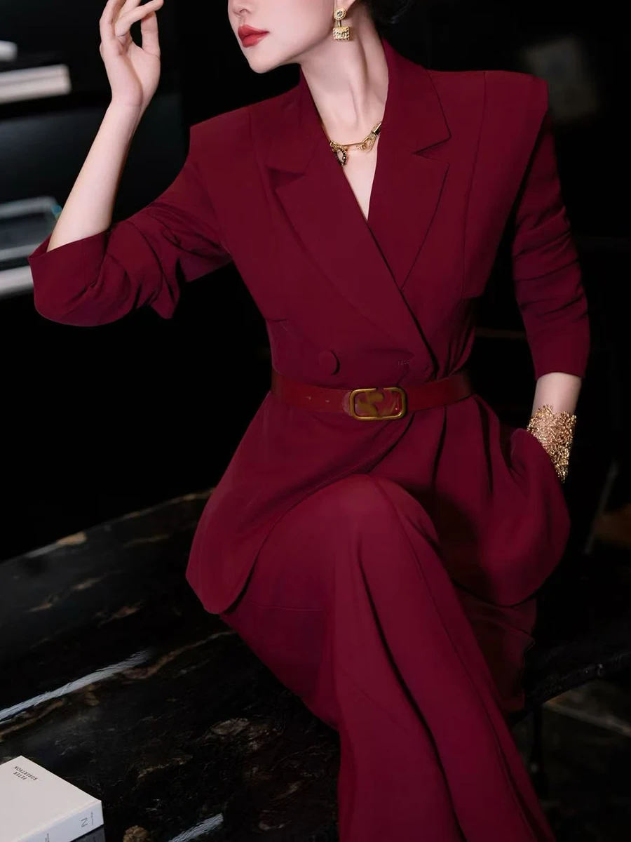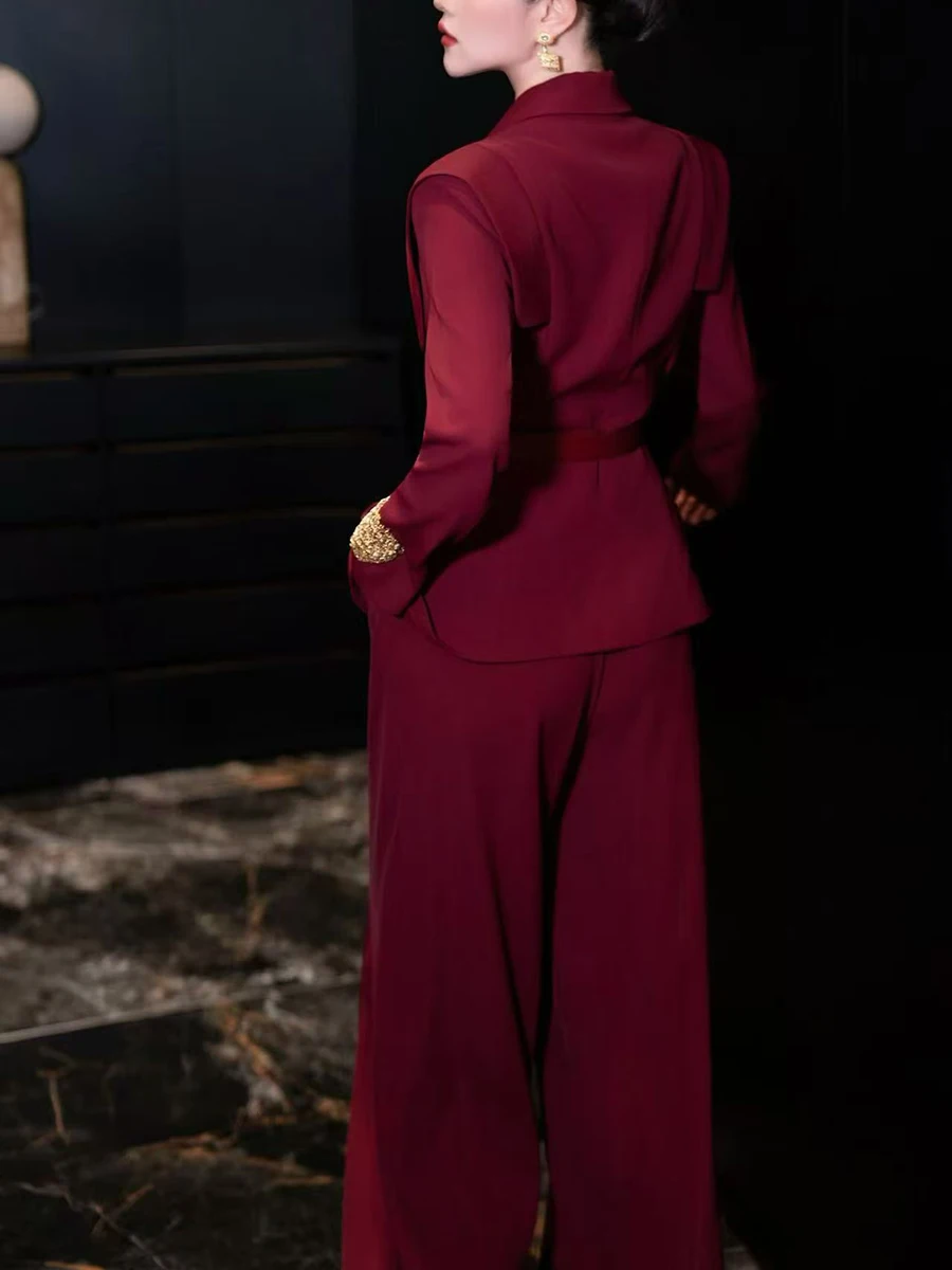 TWOTWINSTYLE Solid Two Piece Sets for Women Lapel Long Sleeves Spliced Belt Top Wide Leg Pant Temperament Set Female Clothing