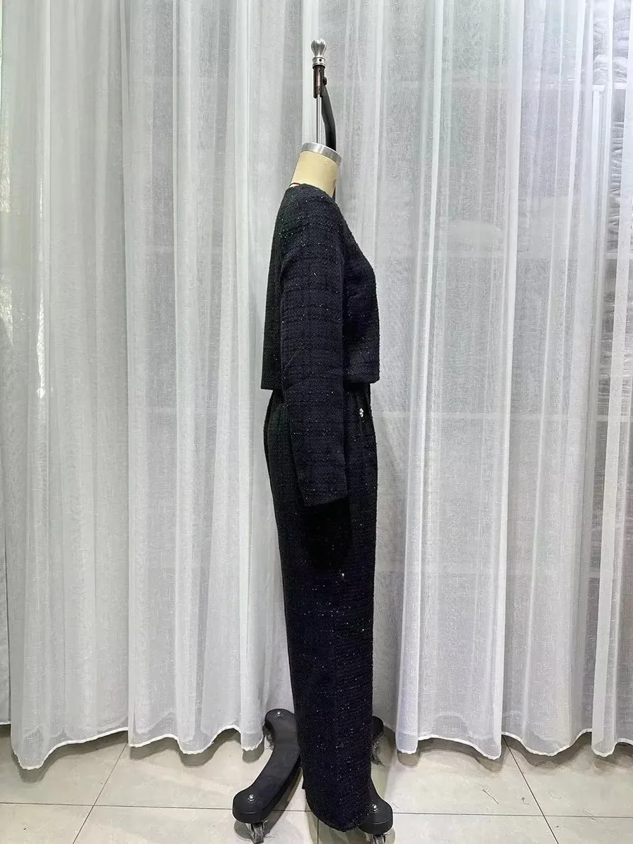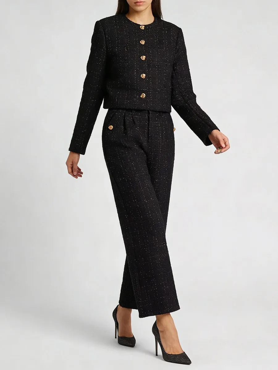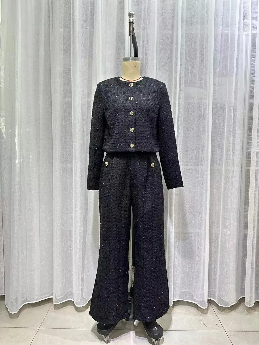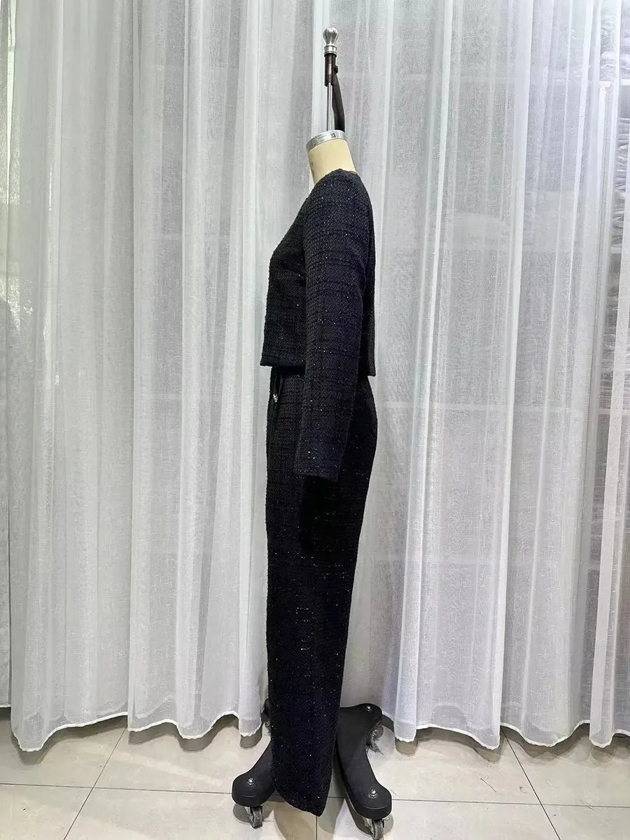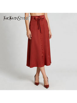 TWOTWINSTYLE Spliced Bright Silk Two Piece Set for Women O Neck Long Sleeves Patchwork Buttons Top High Waist Pant Sets Female
