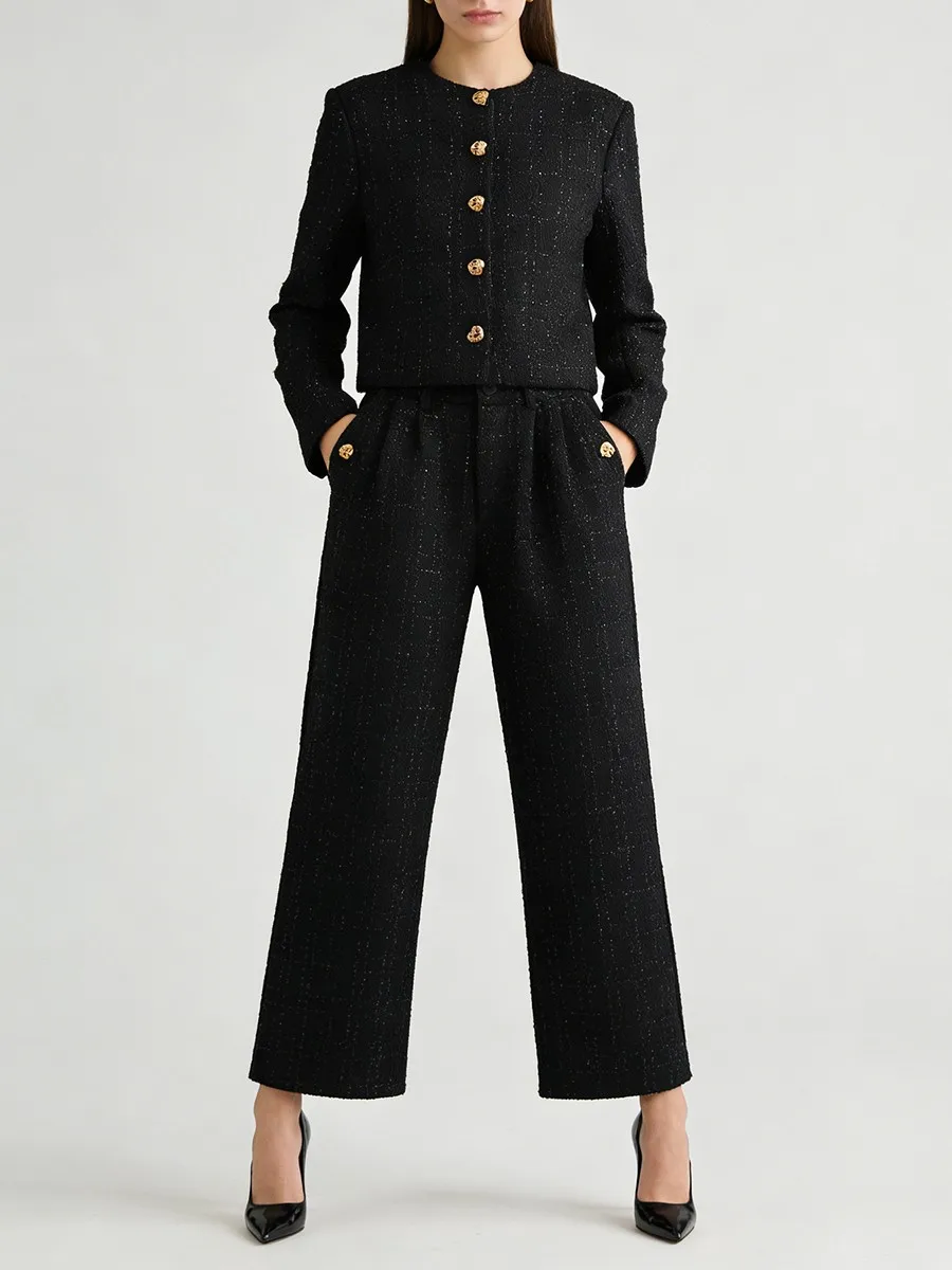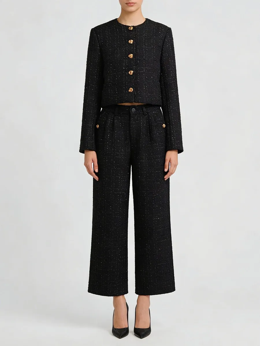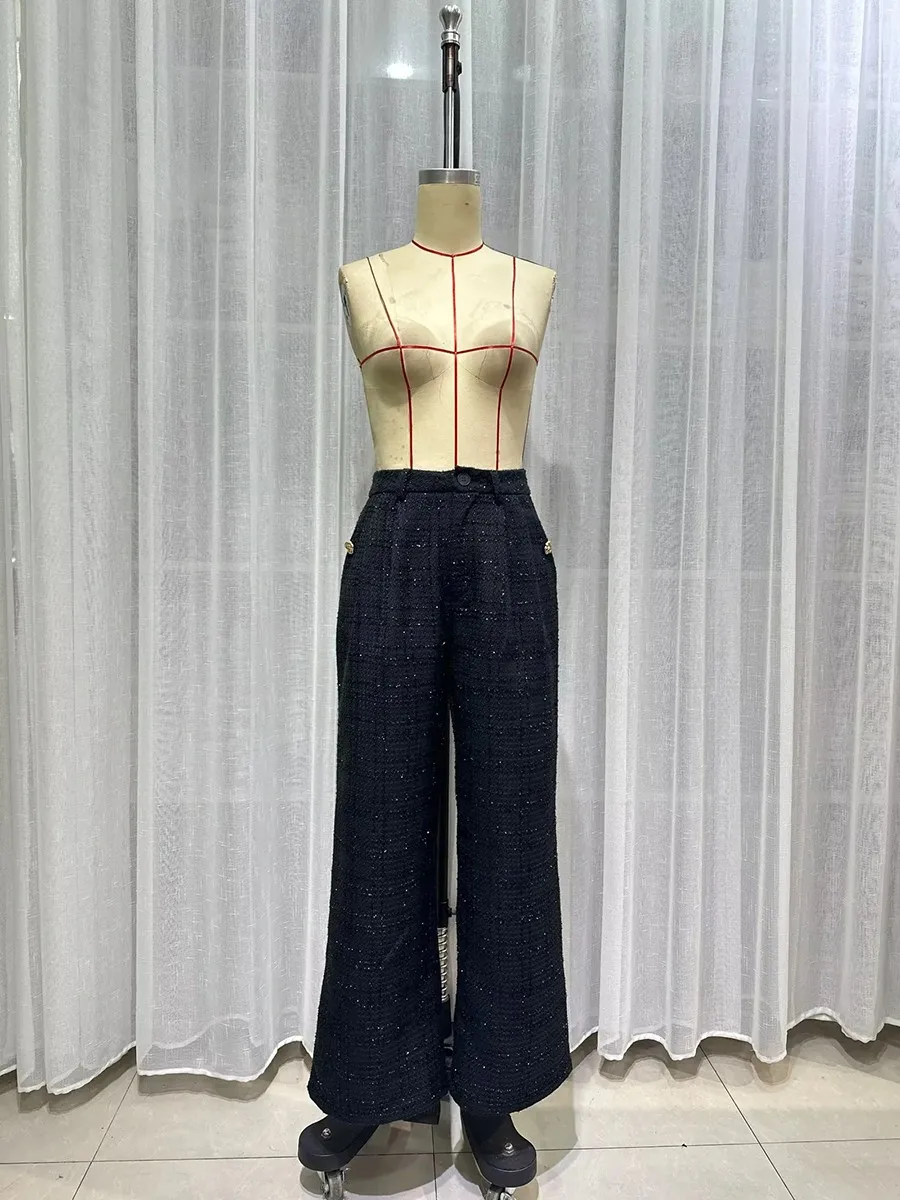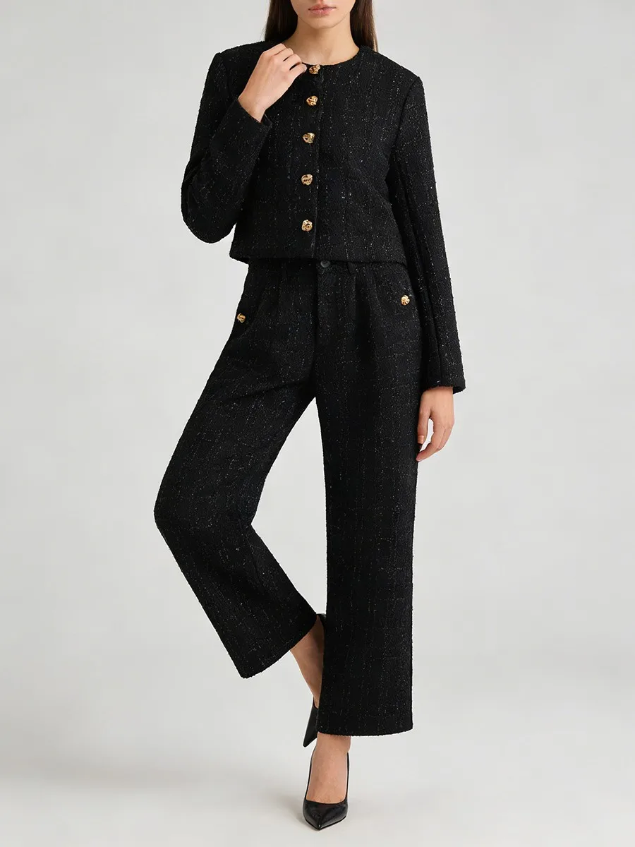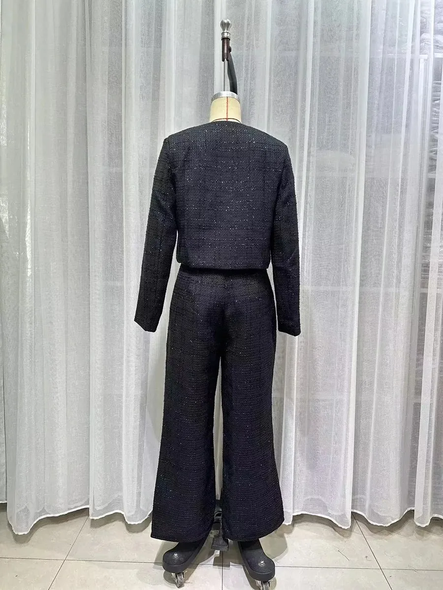 TWOTWINSTYLE Spliced Bright Silk Two Piece Set for Women O Neck Long Sleeves Patchwork Buttons Top High Waist Pant Sets Female