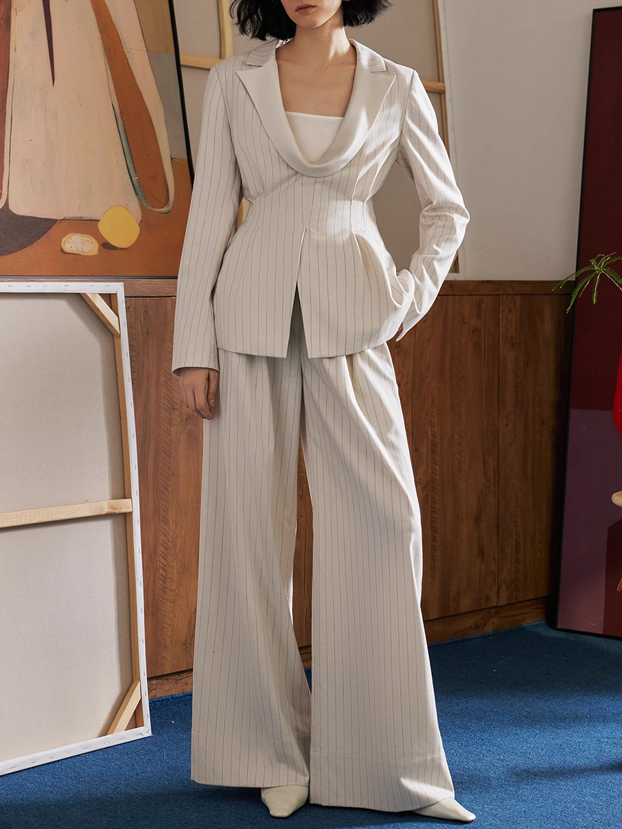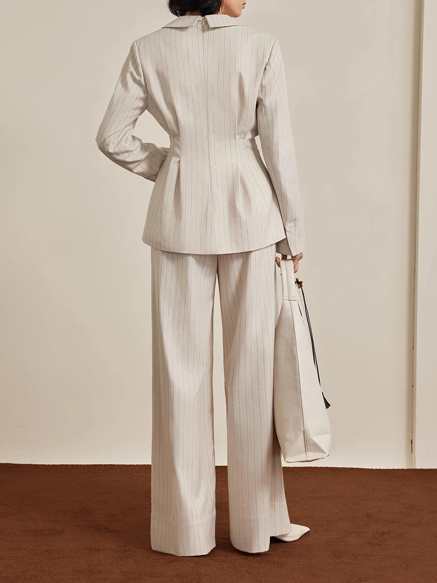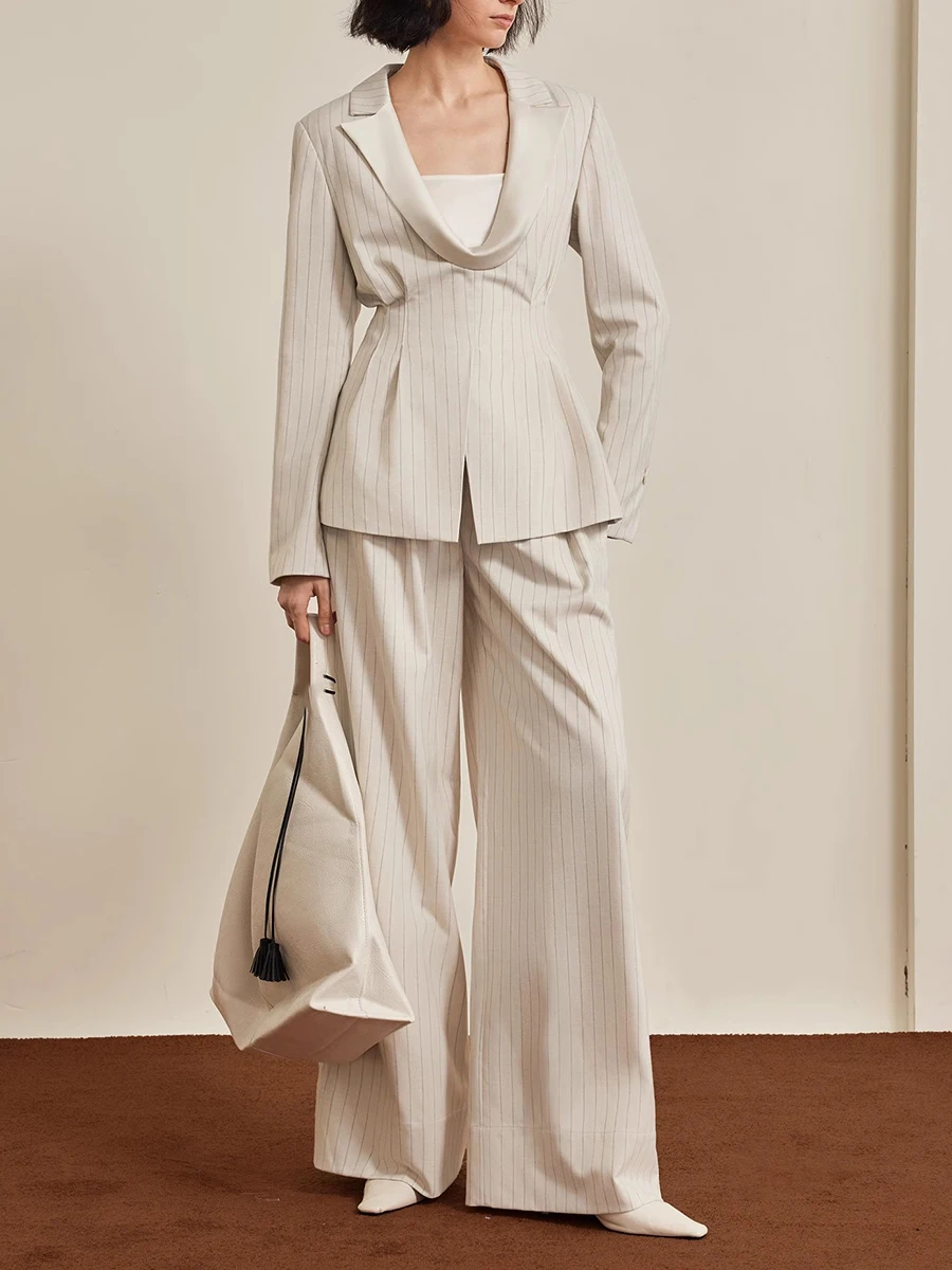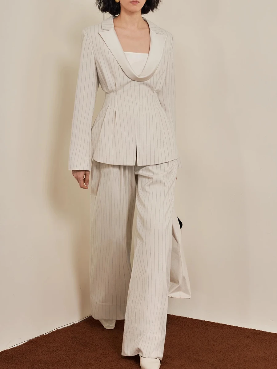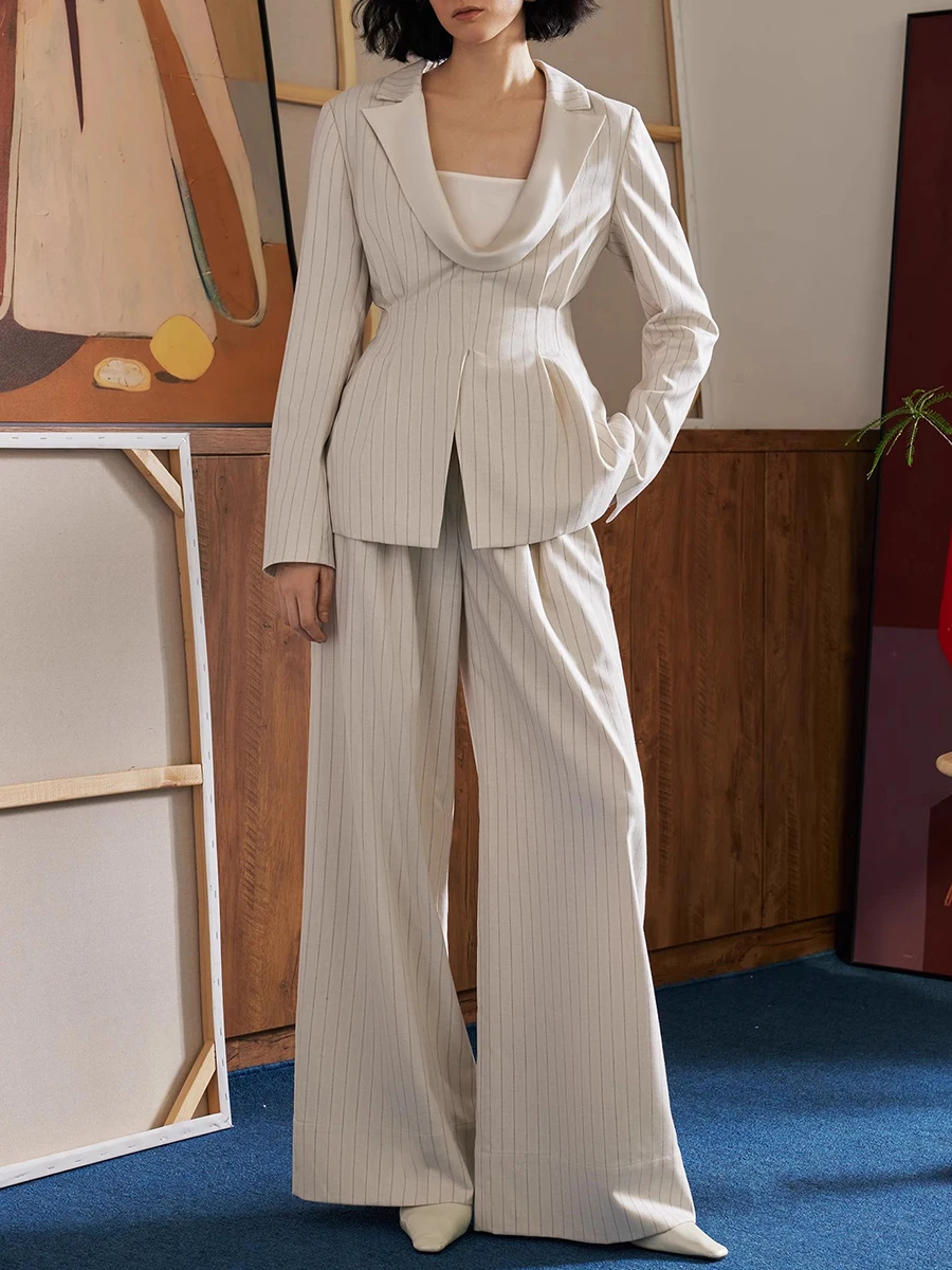 TWOTWINSTYLE Striped Two Piece Sets for Women Lapel Long Sleeves Tunic Patchwork Zipper Top High Waist Wide Leg Pant Set Female