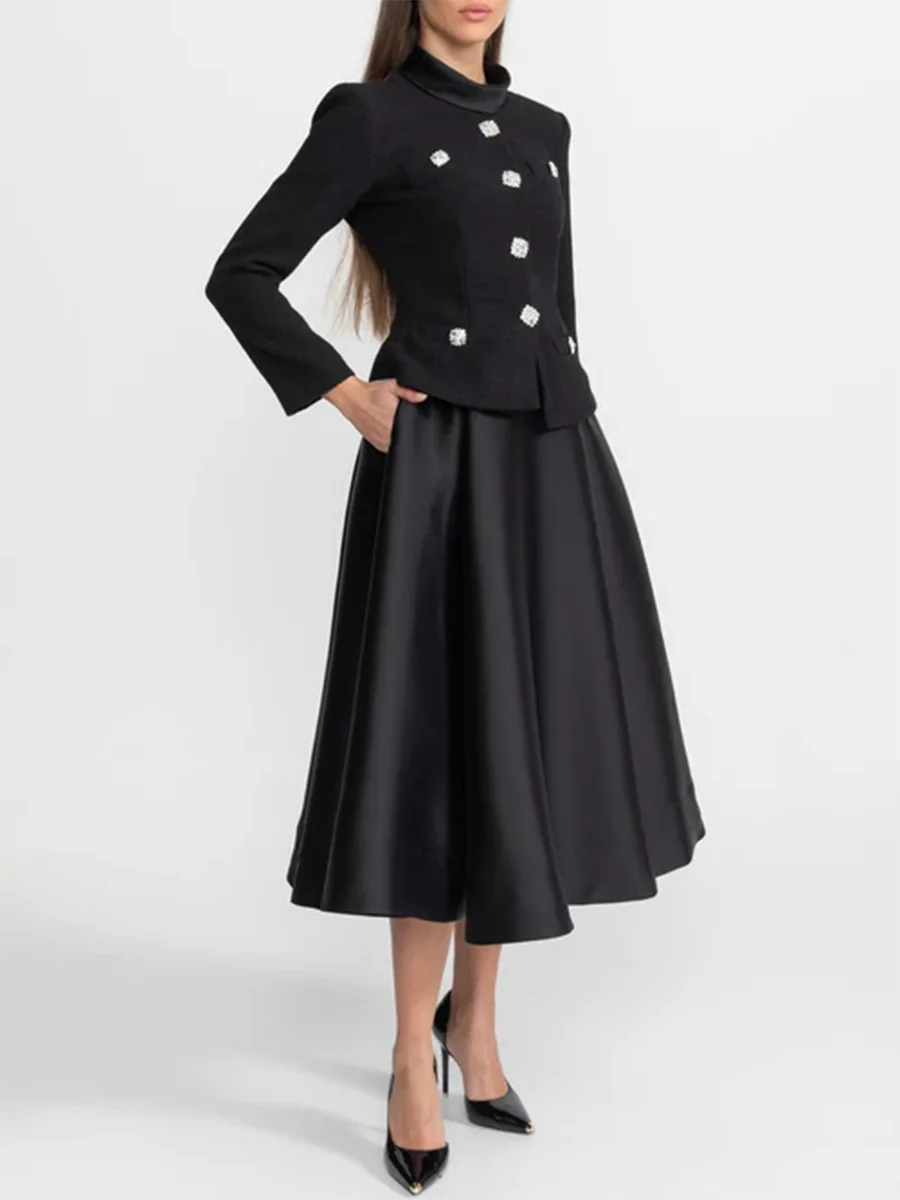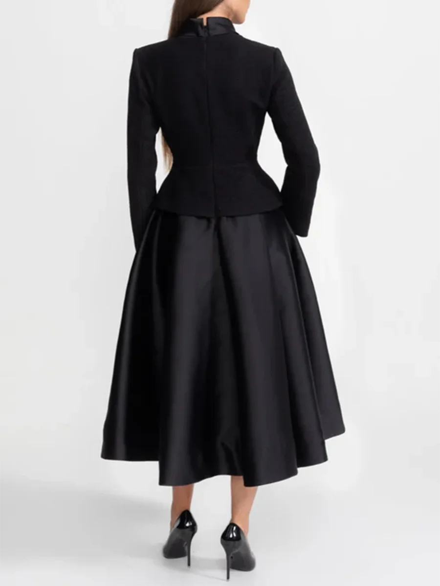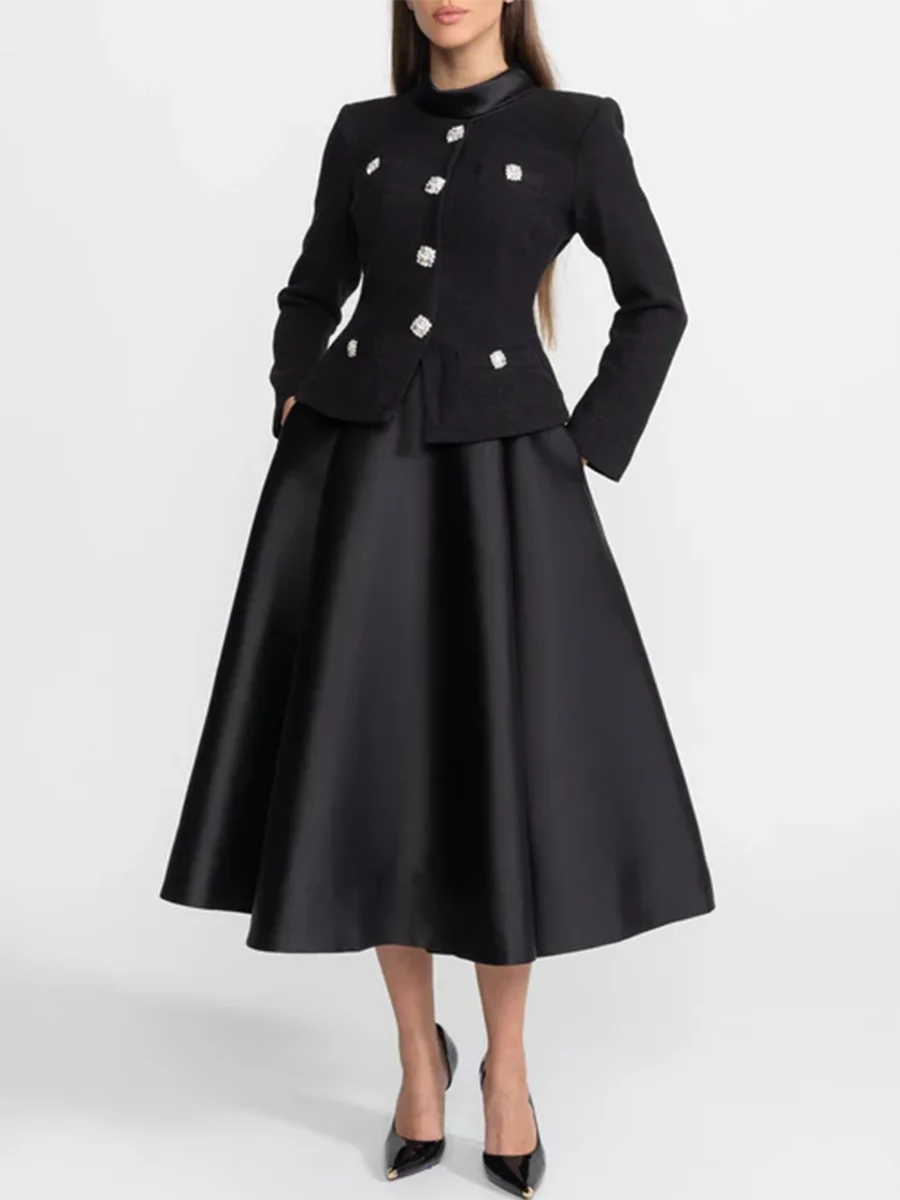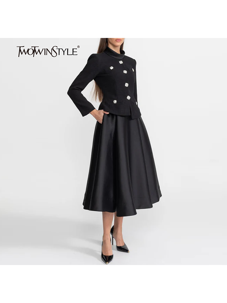 TWOTWINSTYLE Temperament Patchwork Diamond Button Dress for Women Stand Collar Long Sleeve Elegant Black Dress Female Fashion
