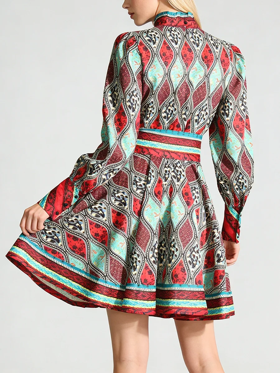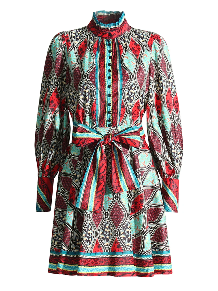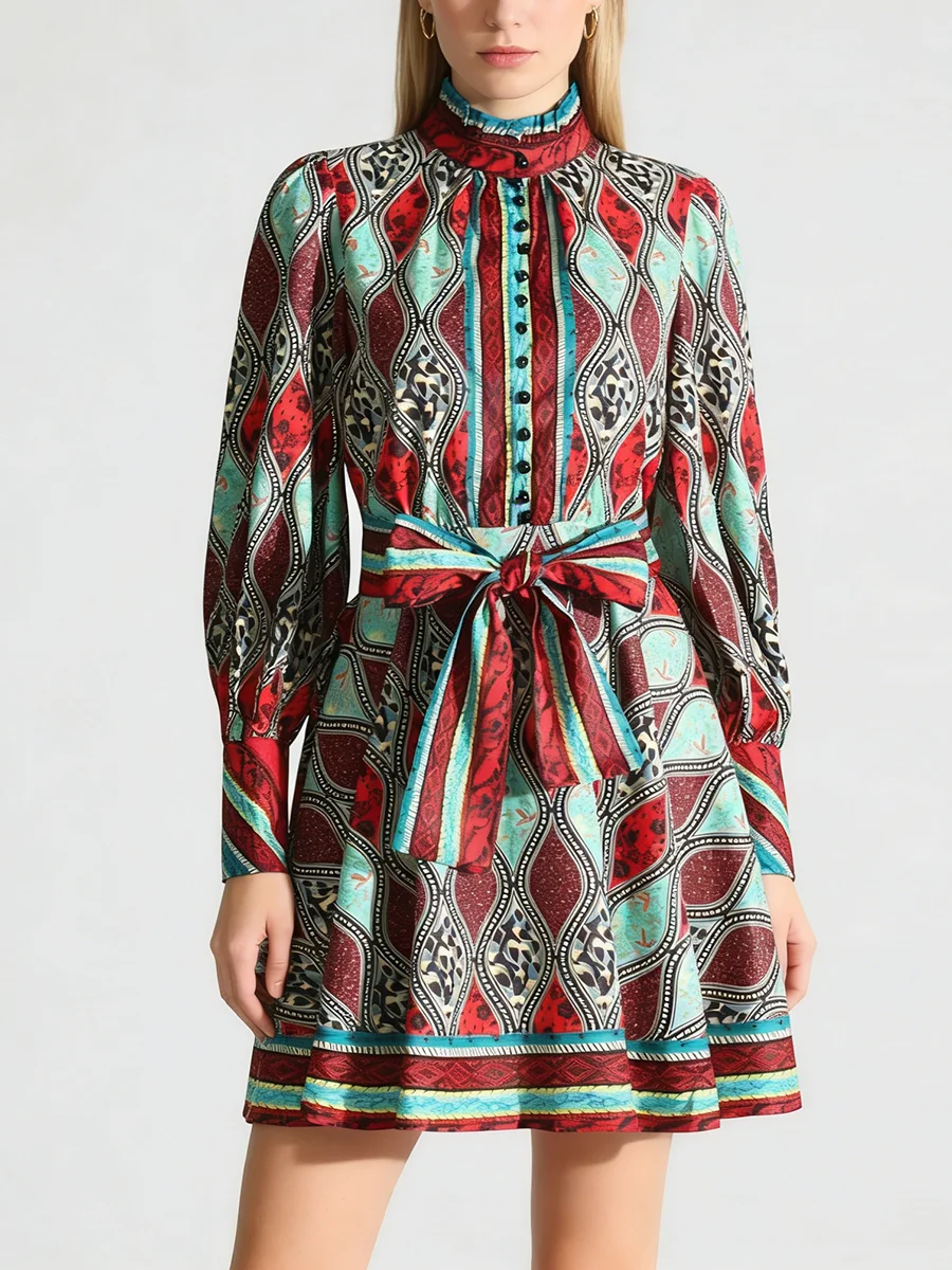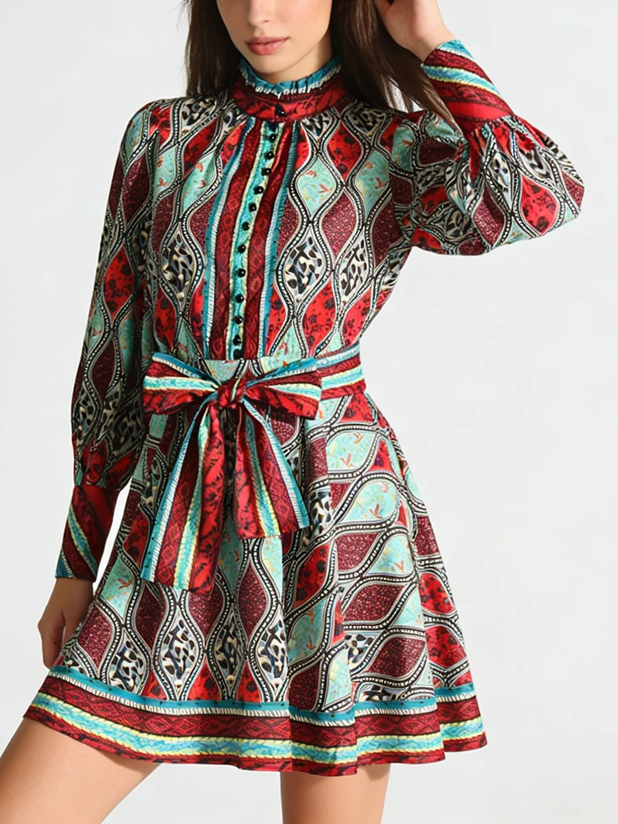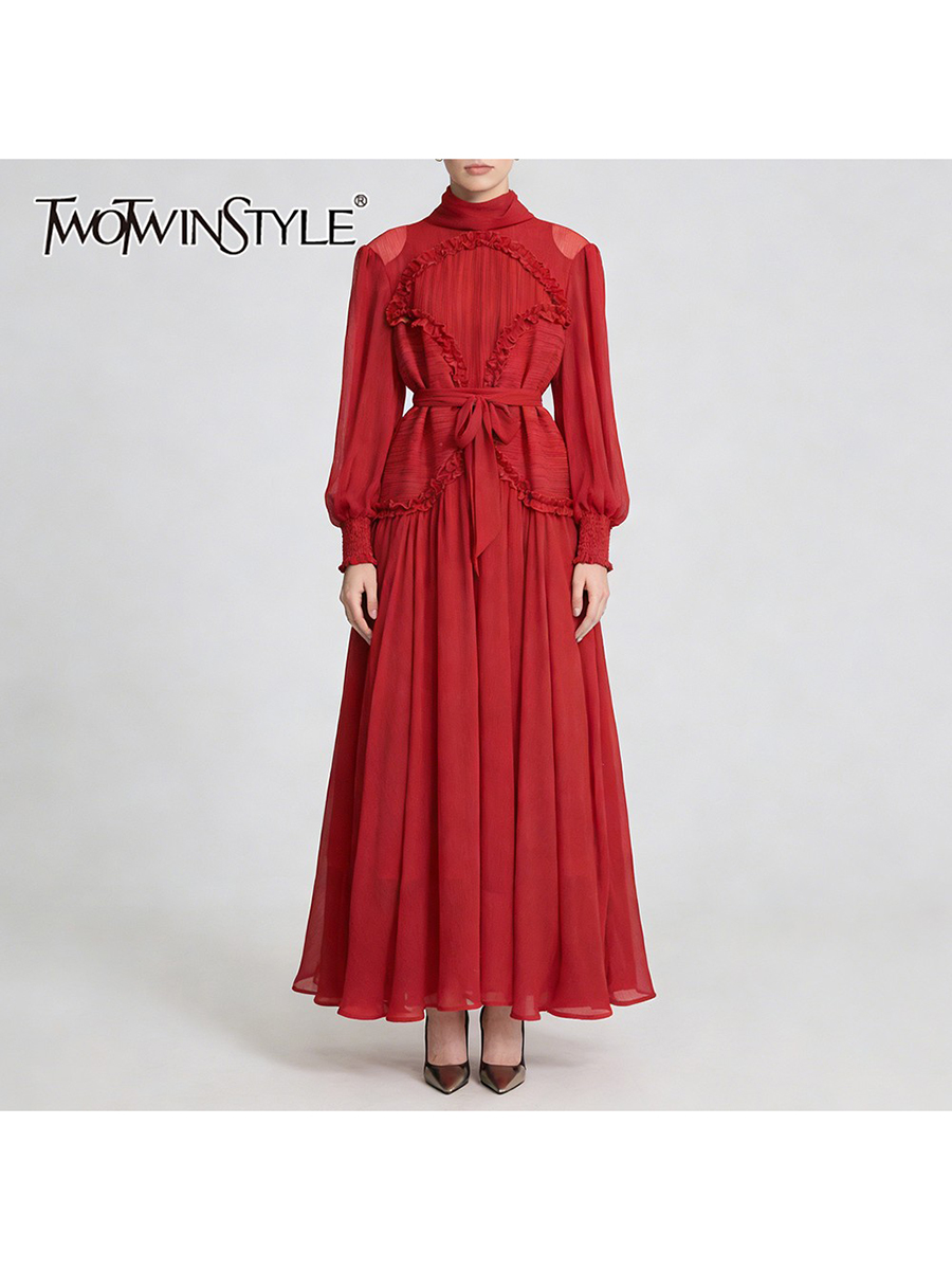 TWOTWINSTYLE Vintage Printing Spliced Bowknot Temperament Dress for Women High Neck Long Sleeve Patchwork Bottons Dresses Female