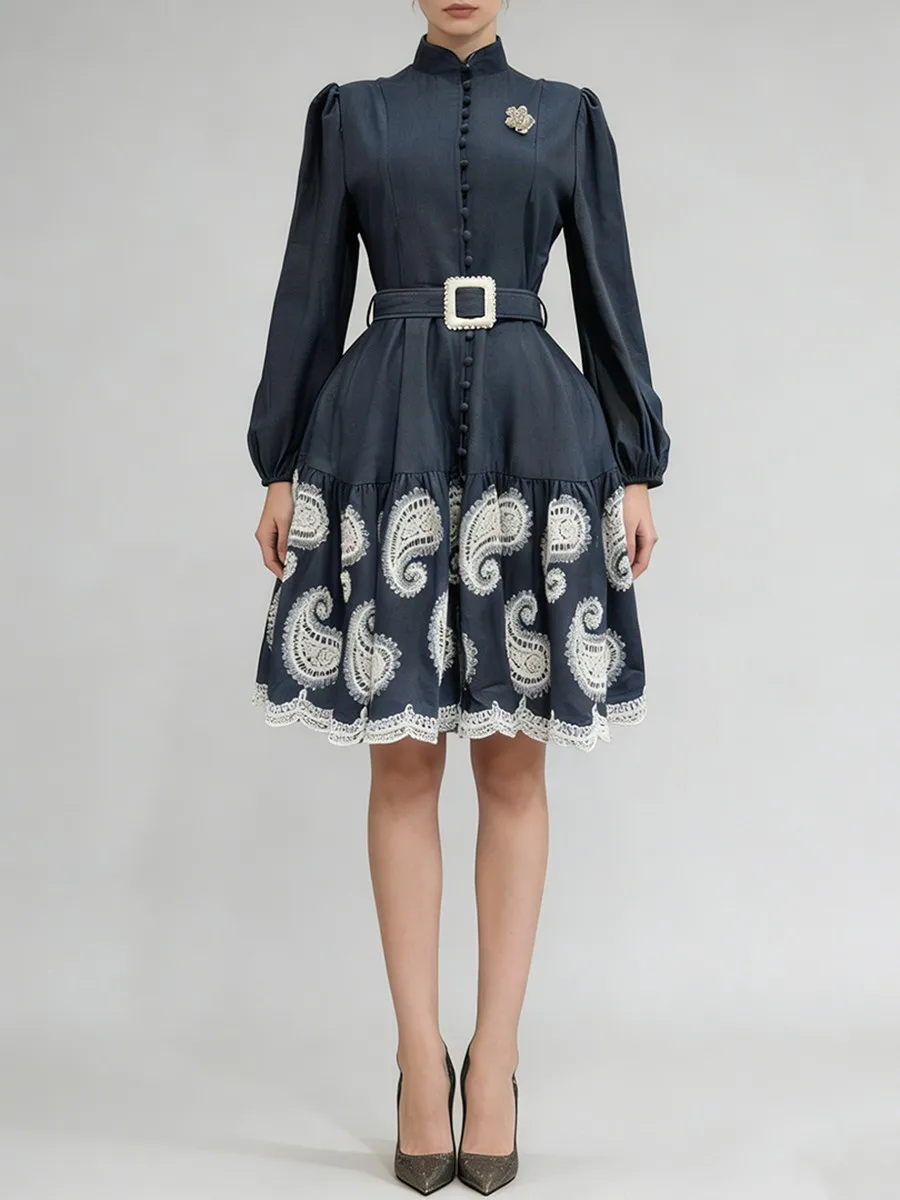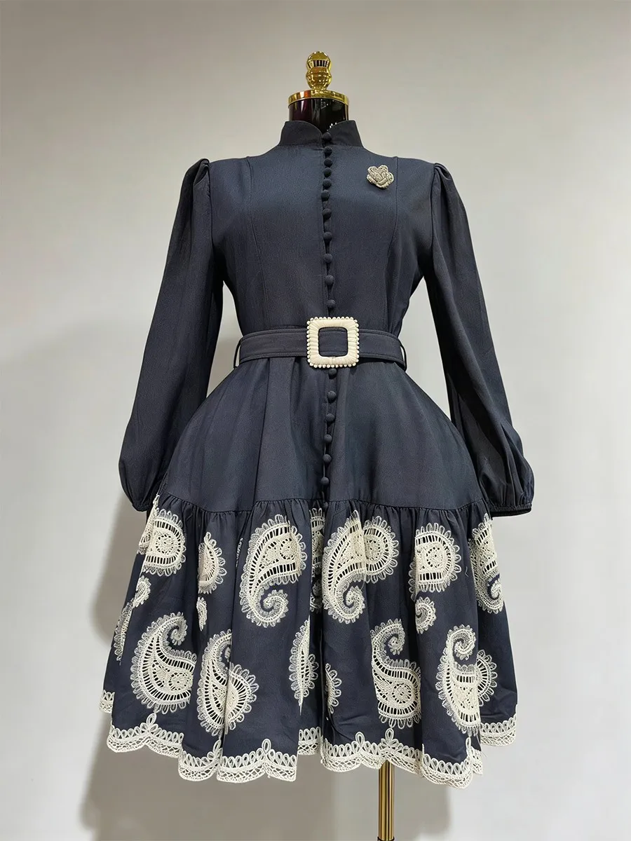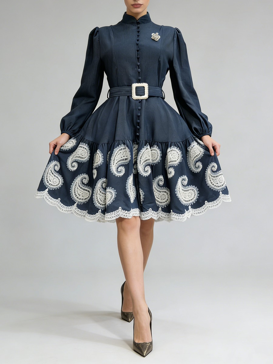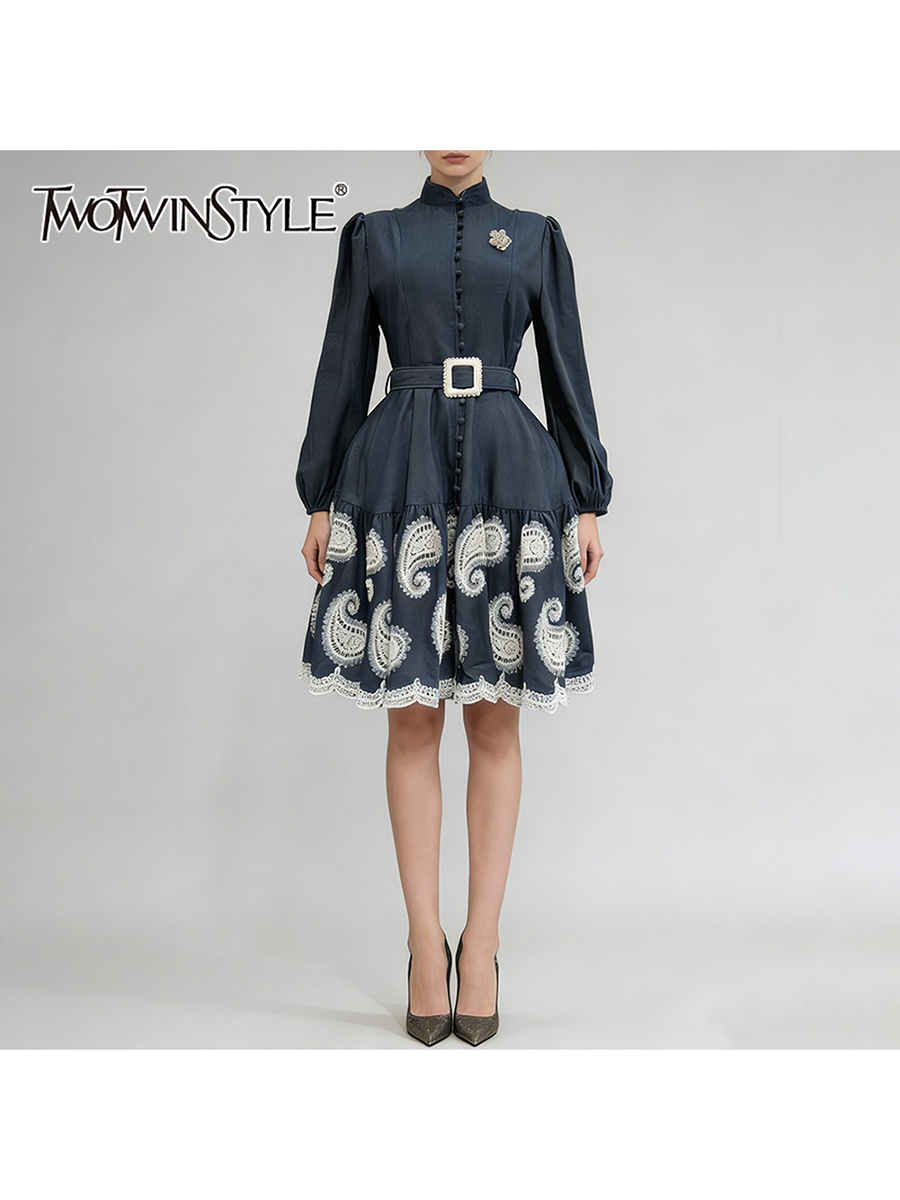TWOTWINSTYLE Vintage Spliced Embroidery Dresses for Women Stand Neck Long Sleeves High Waist Belt Slimming Dress Female Clothing