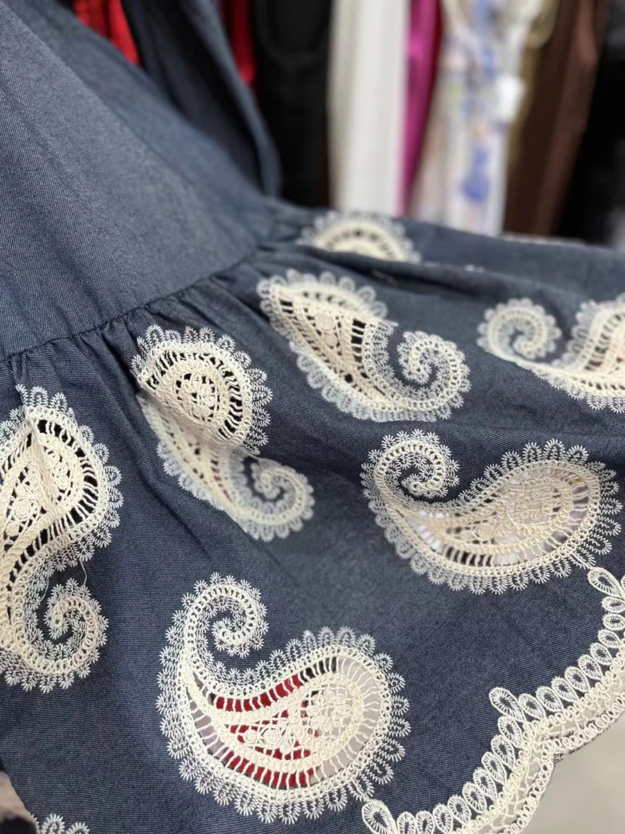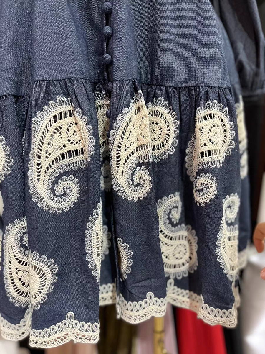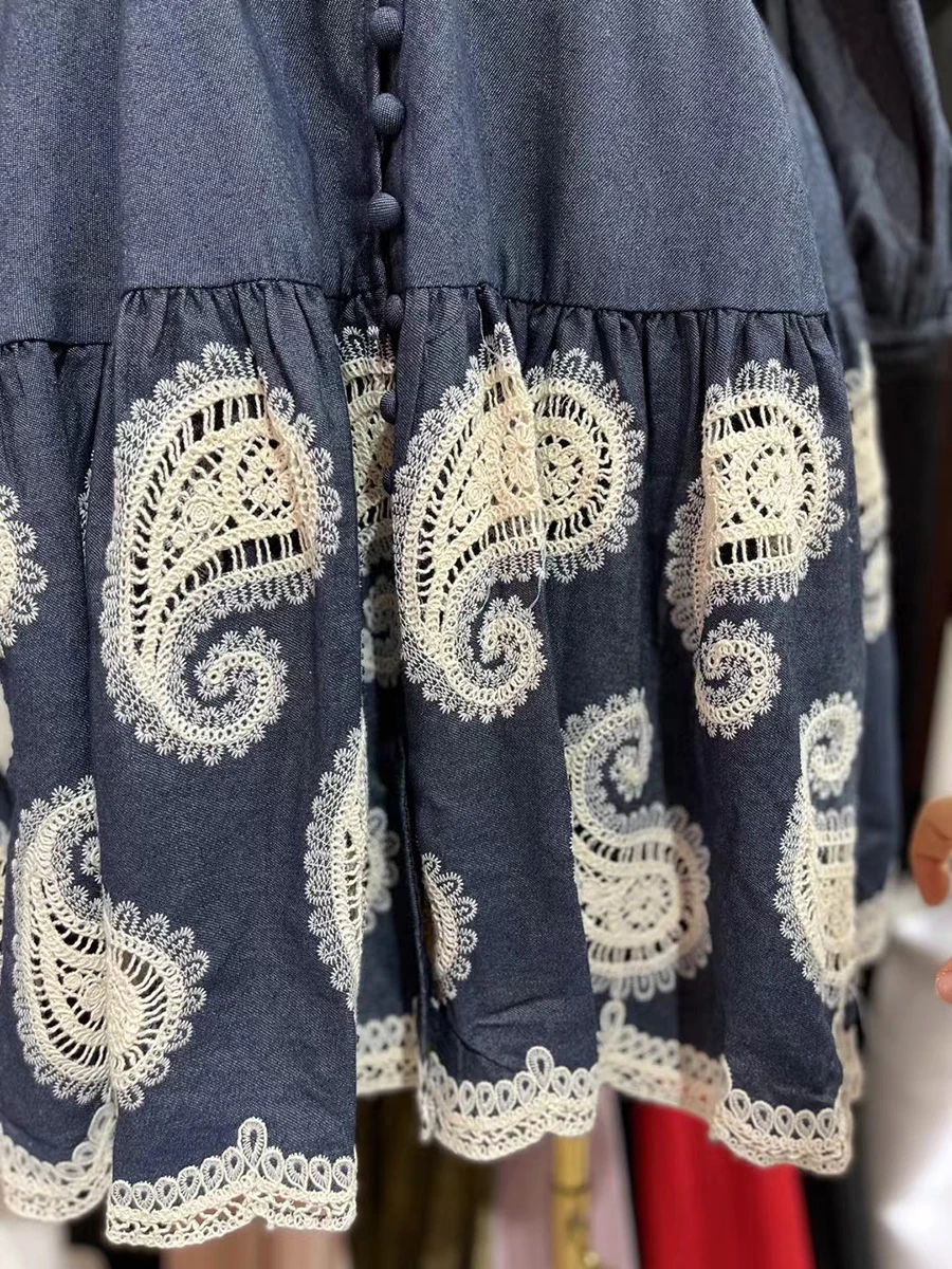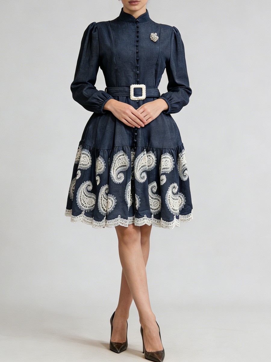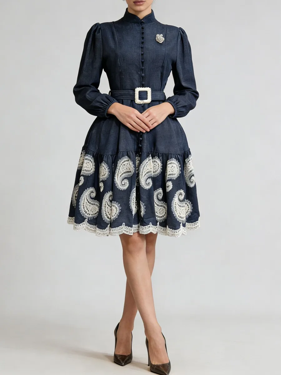 TWOTWINSTYLE Vintage Spliced Embroidery Dresses for Women Stand Neck Long Sleeves High Waist Belt Slimming Dress Female Clothing