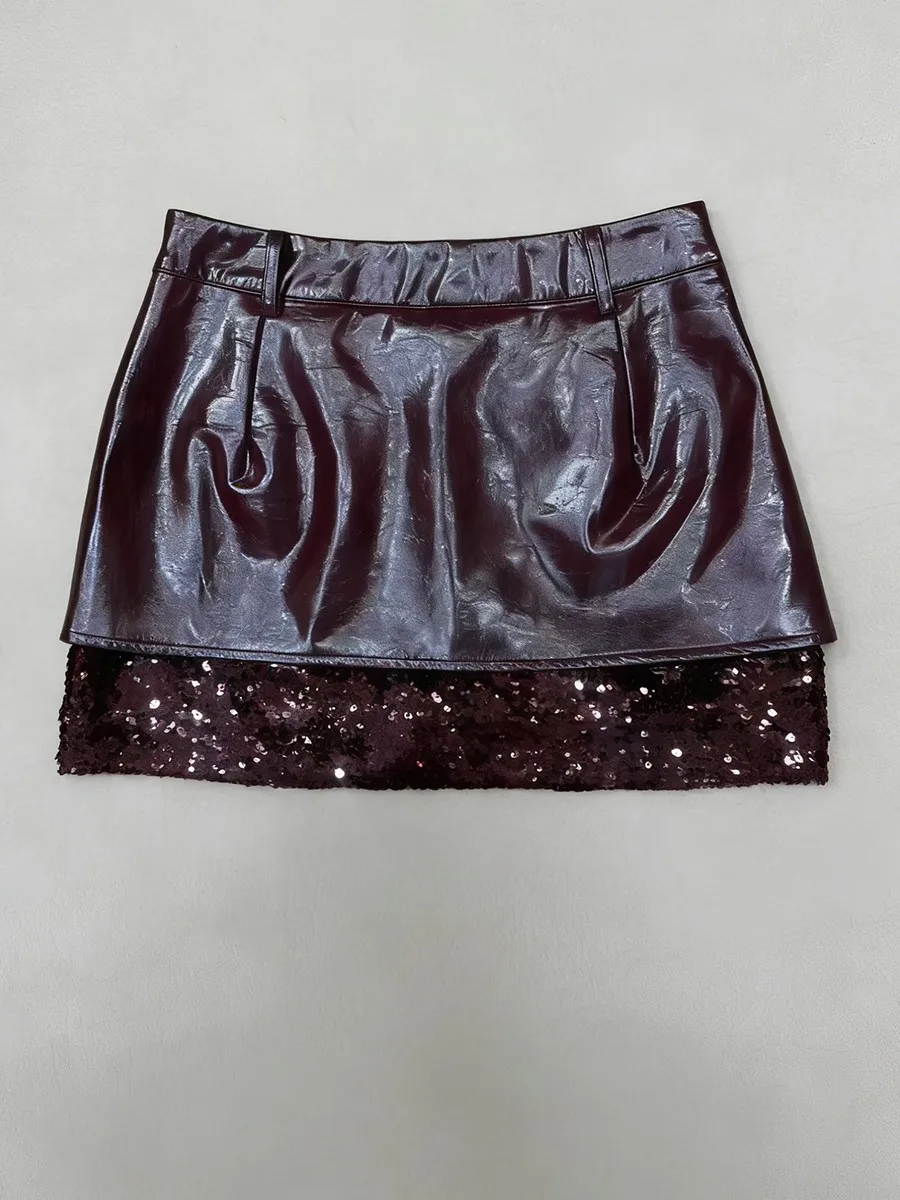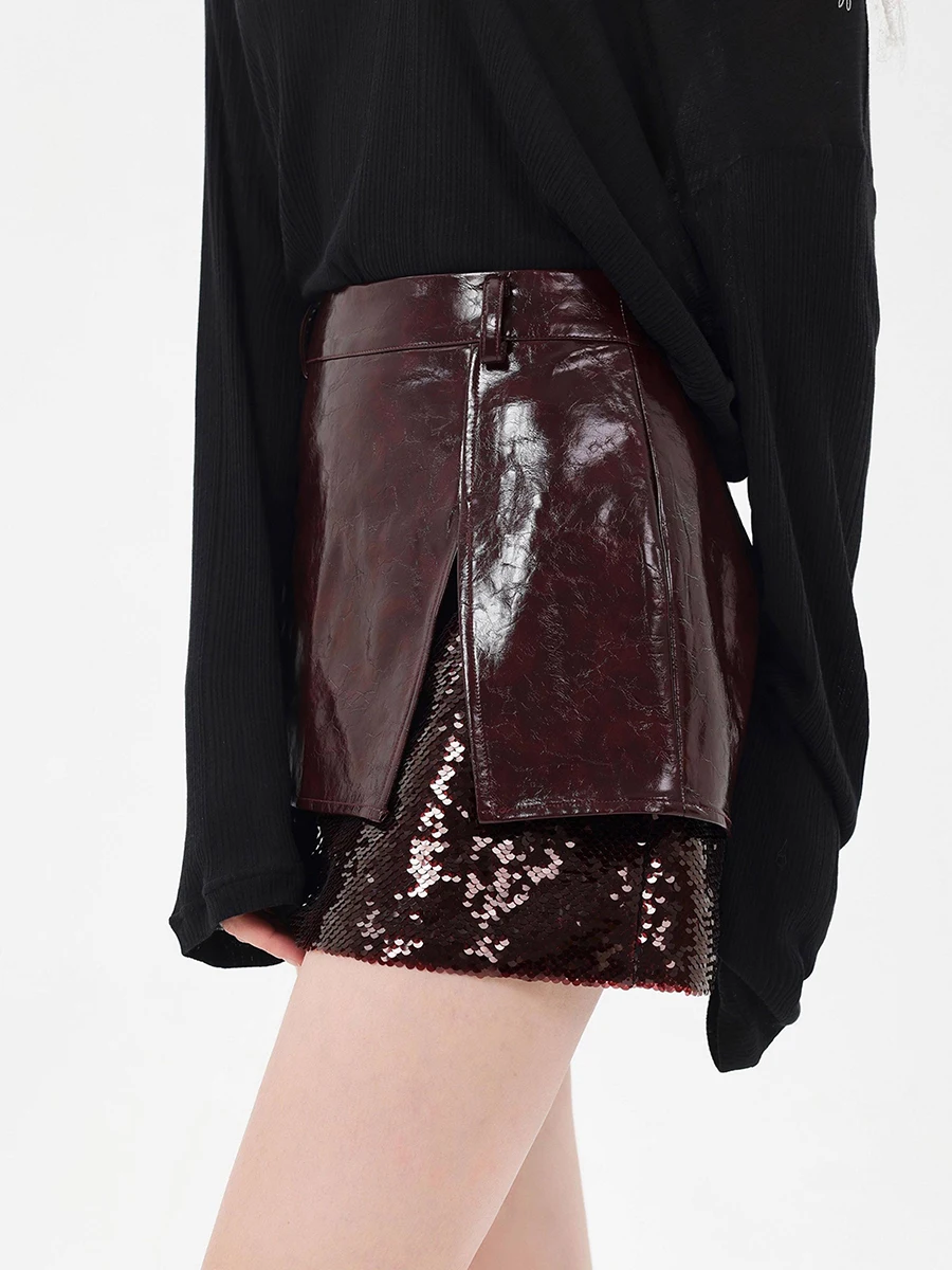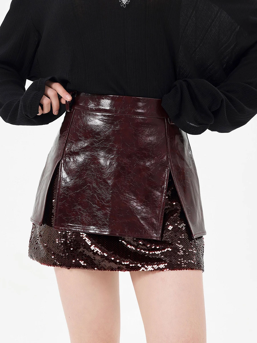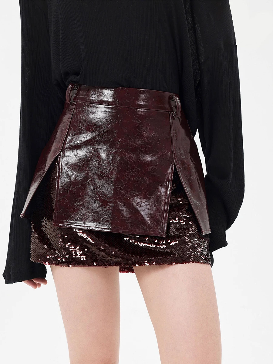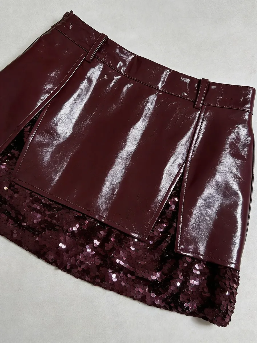 TWOTWINSTYLE Winered Slimming Spliced Sequins Fashion Skirts for Women High Waist Split Design Sense Leather Skirt Female New