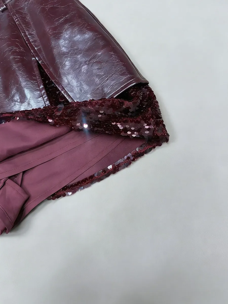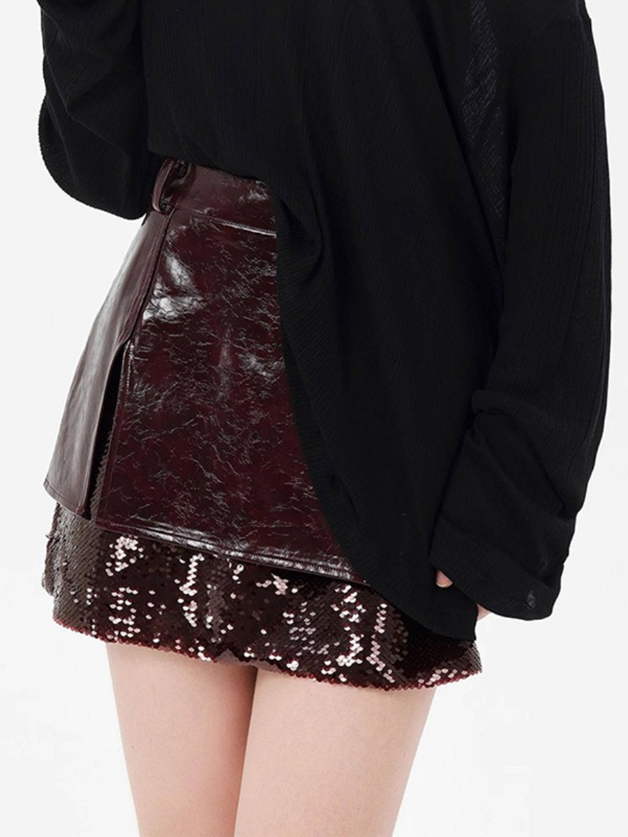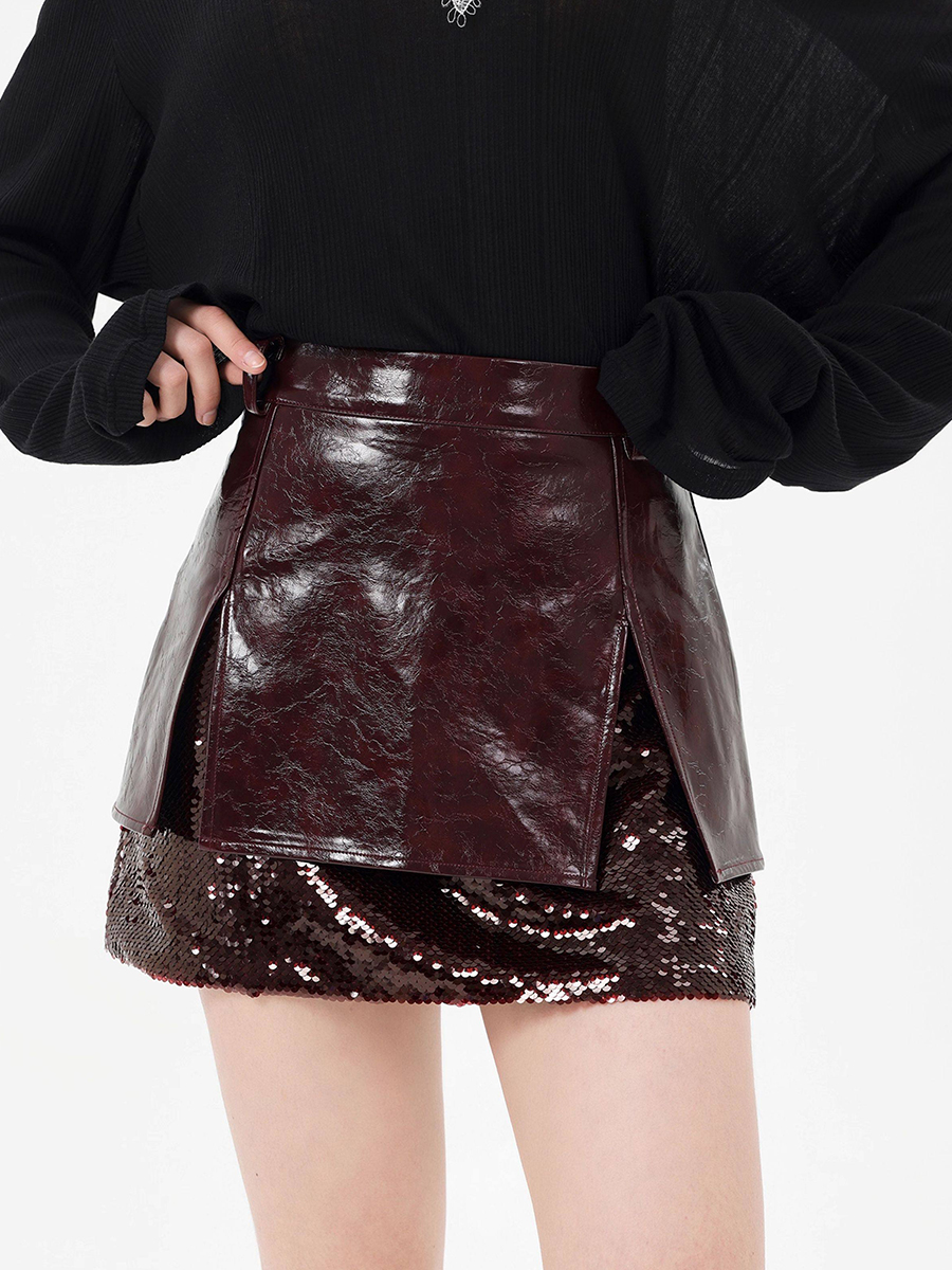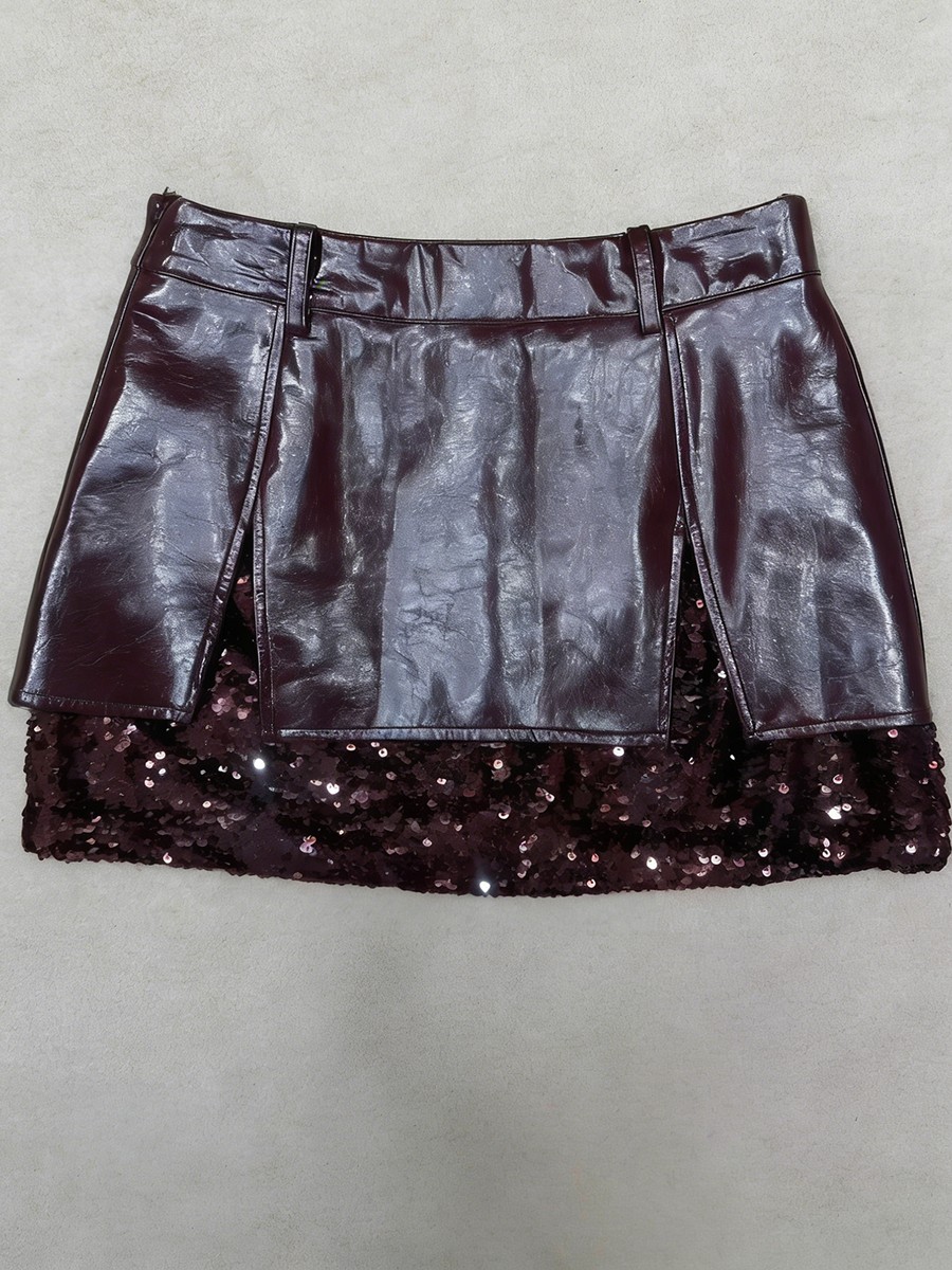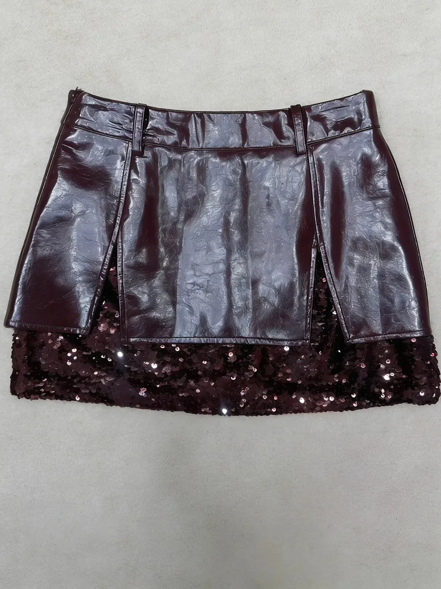 TWOTWINSTYLE Winered Slimming Spliced Sequins Fashion Skirts for Women High Waist Split Design Sense Leather Skirt Female New