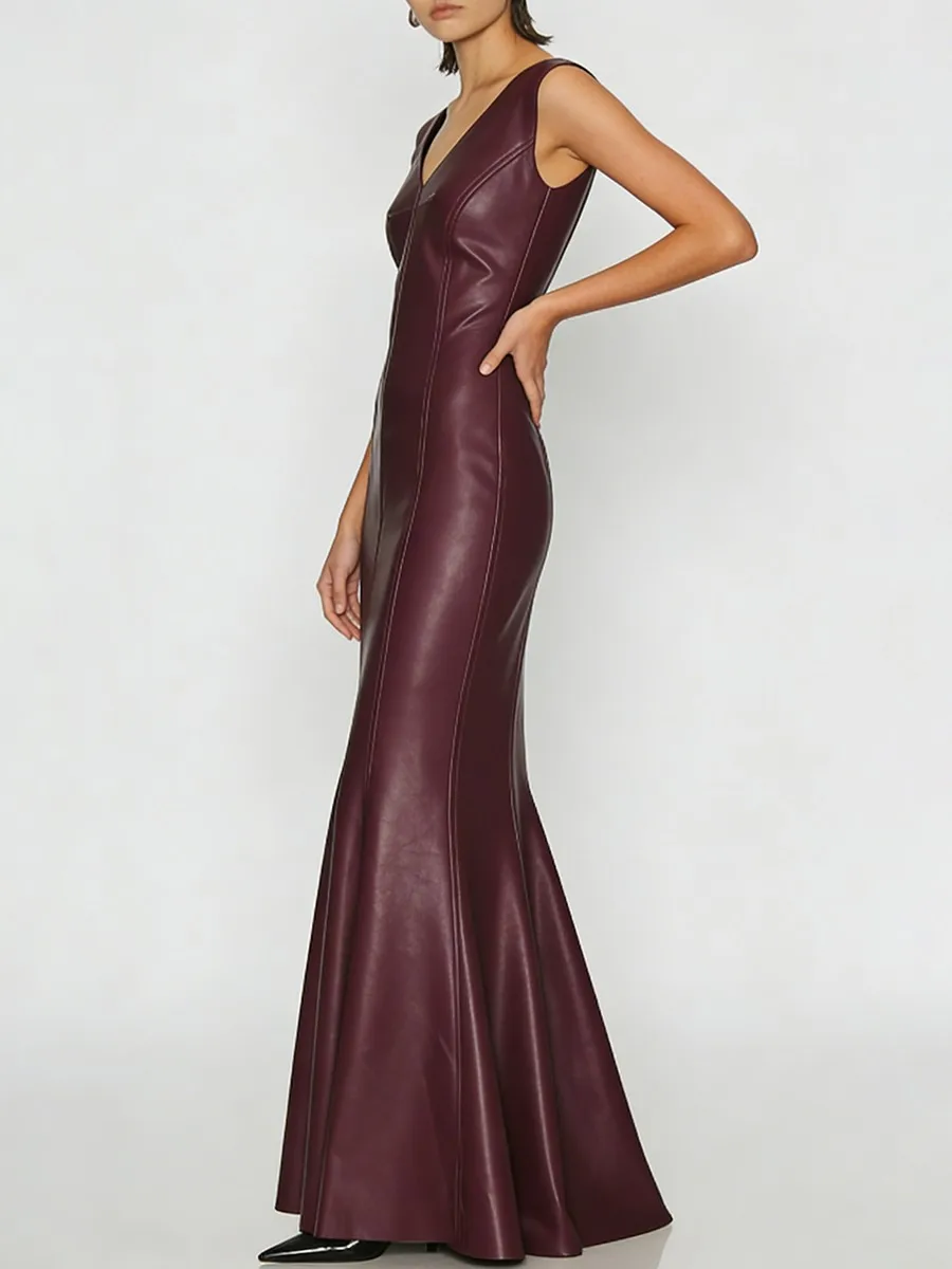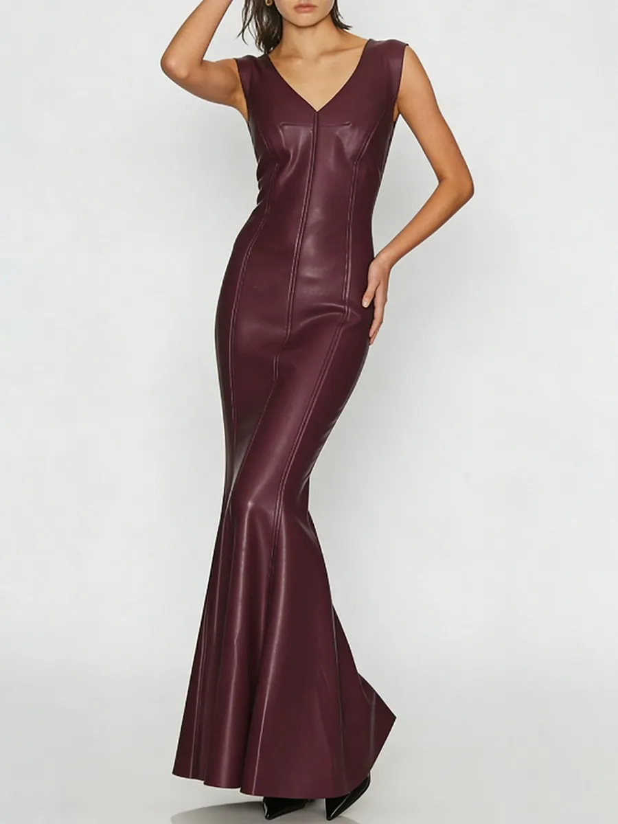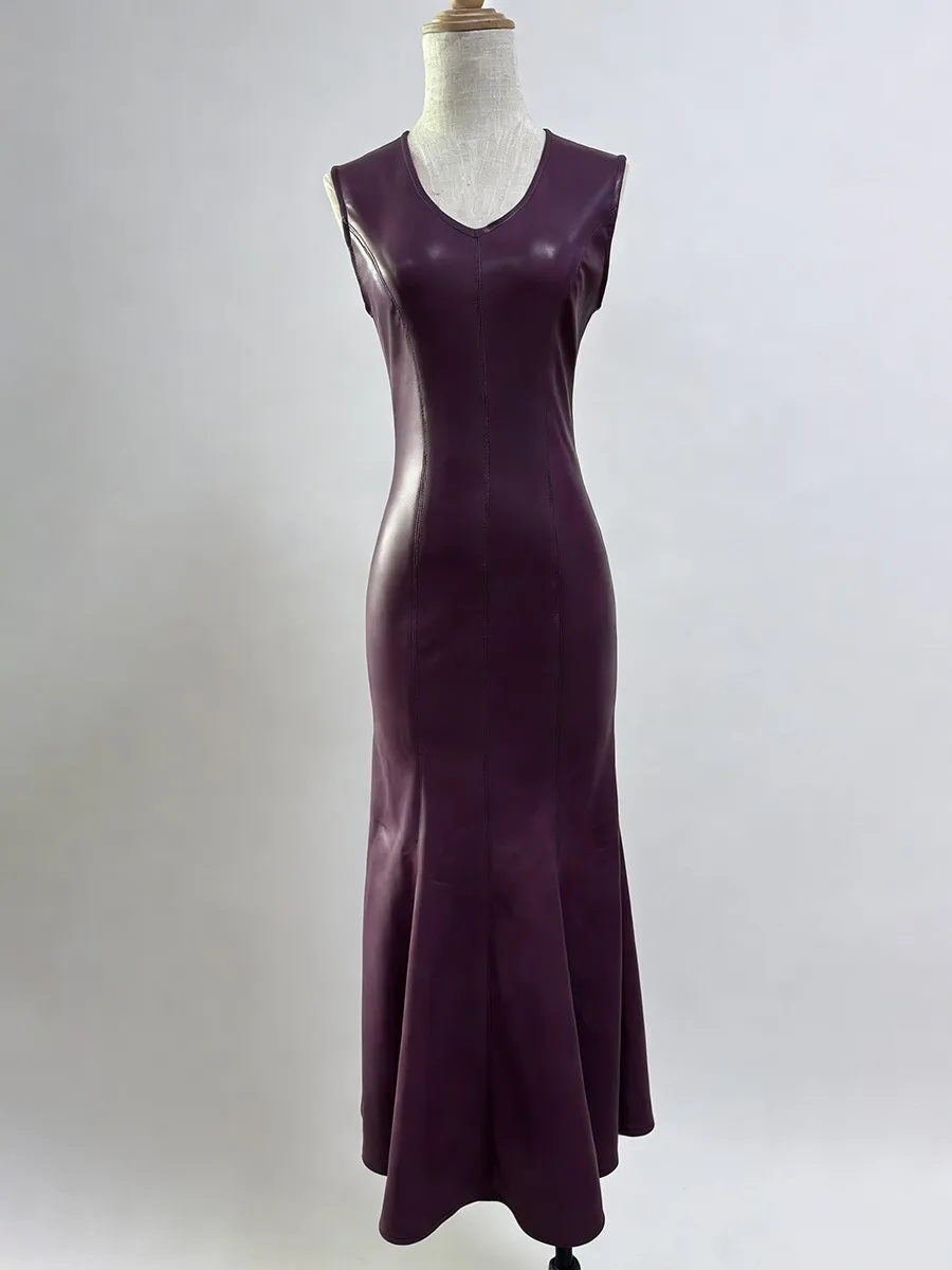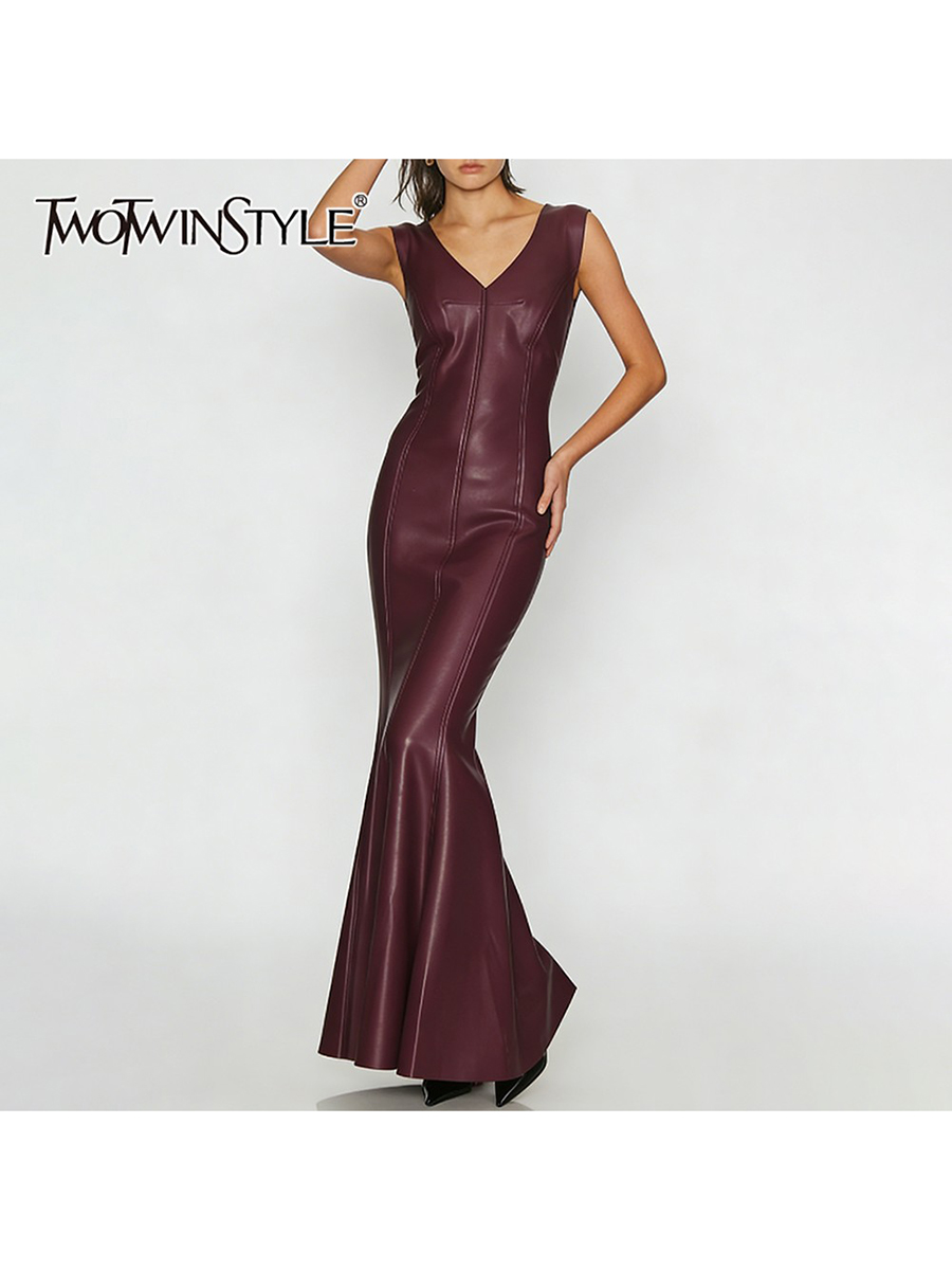 TWOTWINSTYLE Winered Slimming Temperament Mermaid Dresses for Women V Neck Sleeveless Minimalist Leather Dress Female Clothing