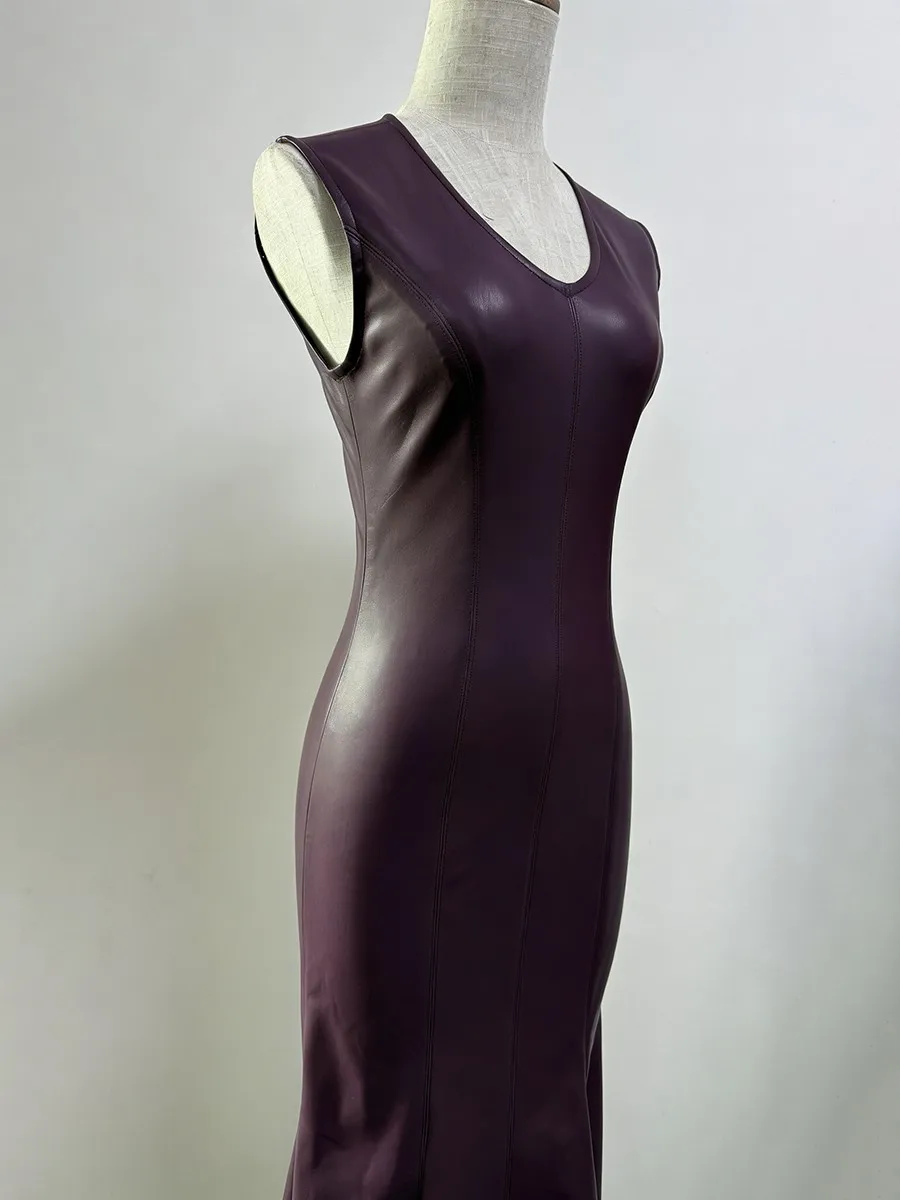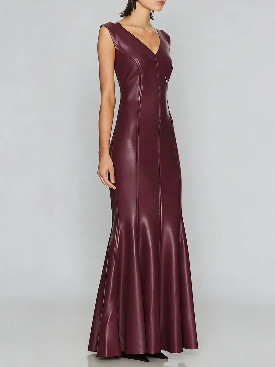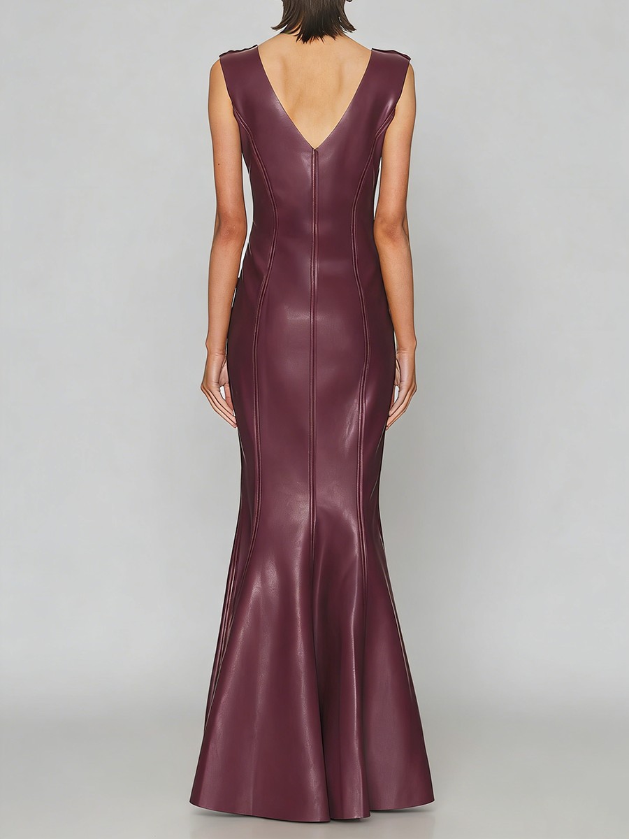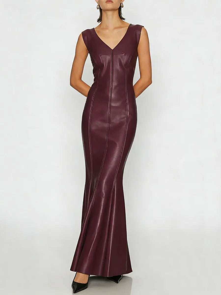 TWOTWINSTYLE Winered Slimming Temperament Mermaid Dresses for Women V Neck Sleeveless Minimalist Leather Dress Female Clothing