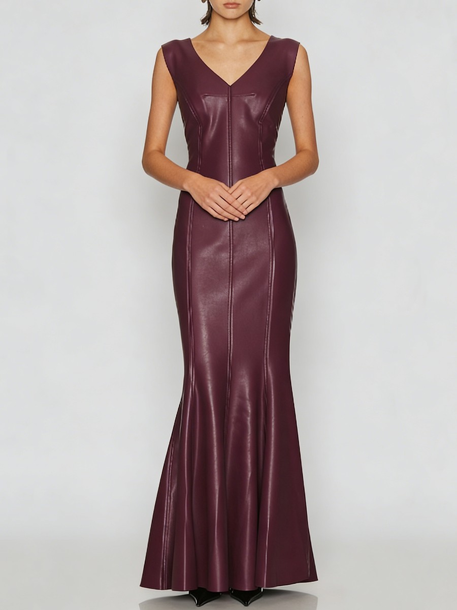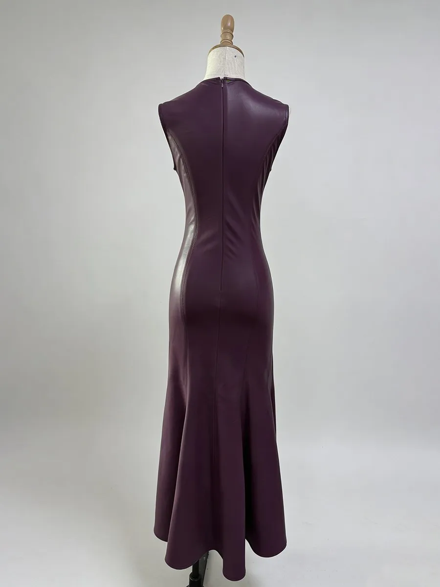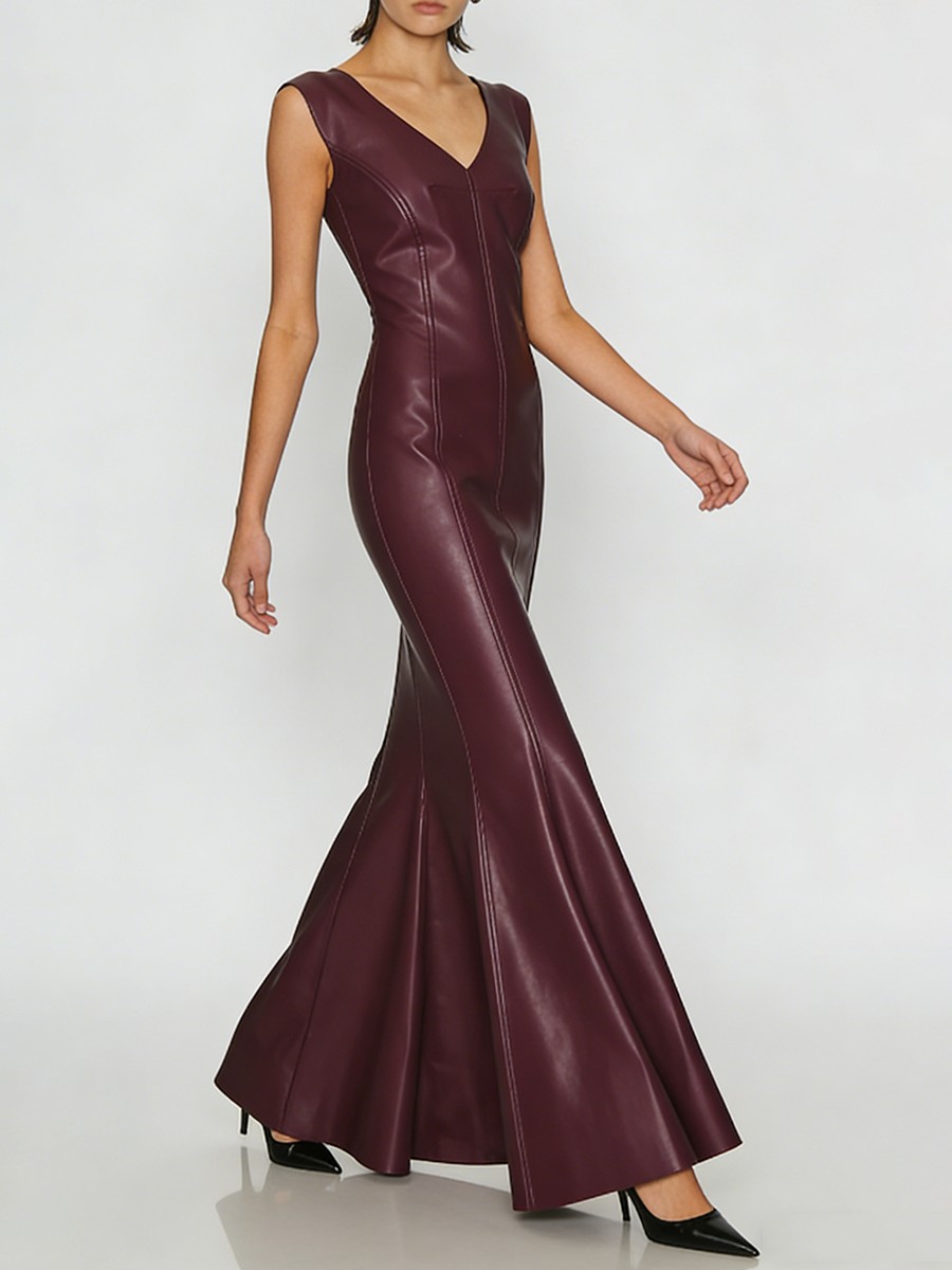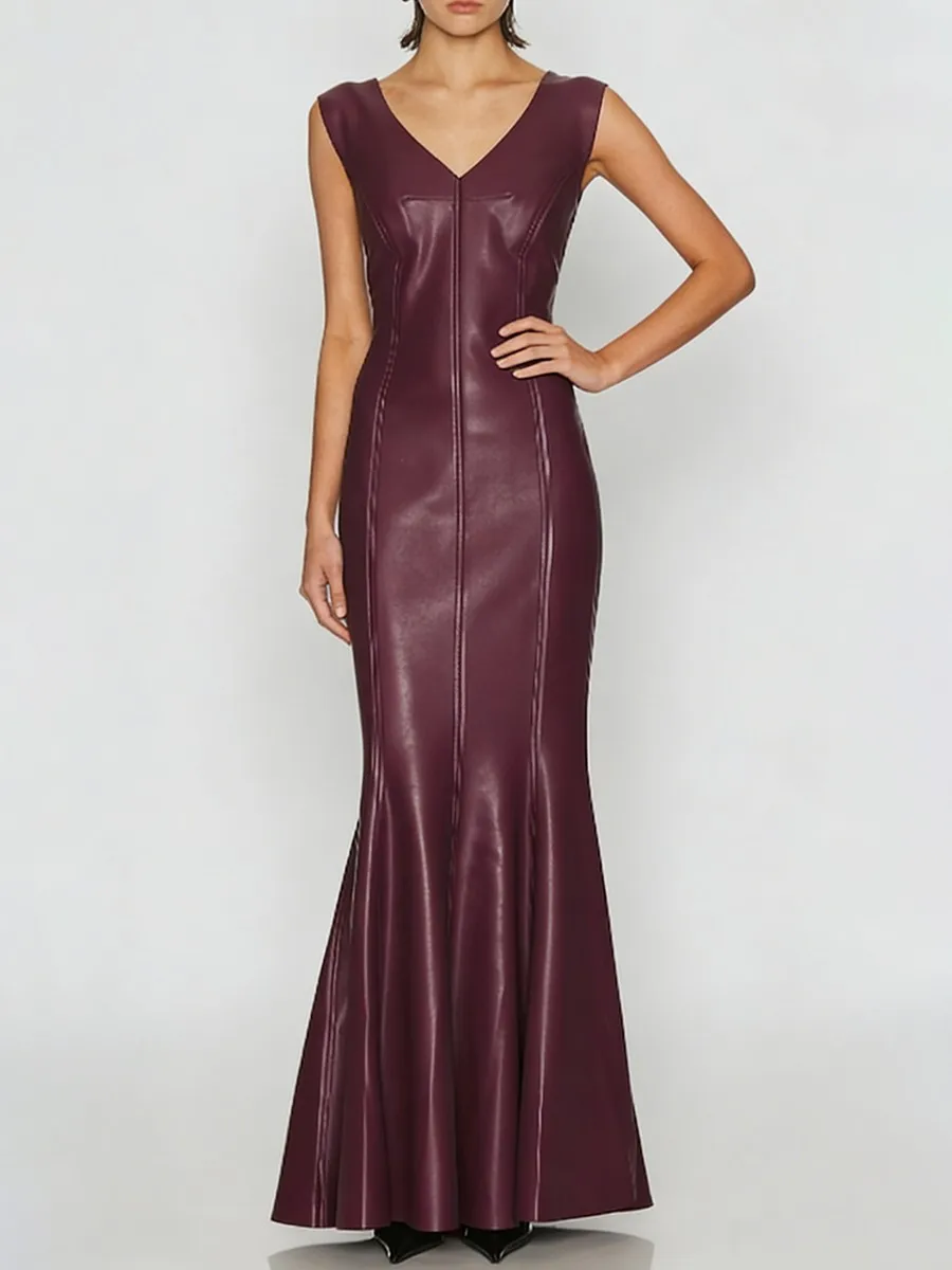 TWOTWINSTYLE Winered Slimming Temperament Mermaid Dresses for Women V Neck Sleeveless Minimalist Leather Dress Female Clothing