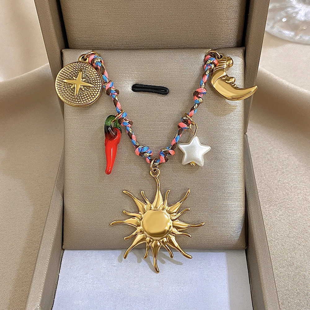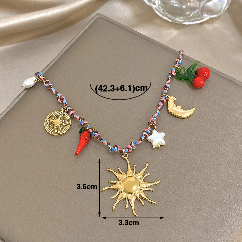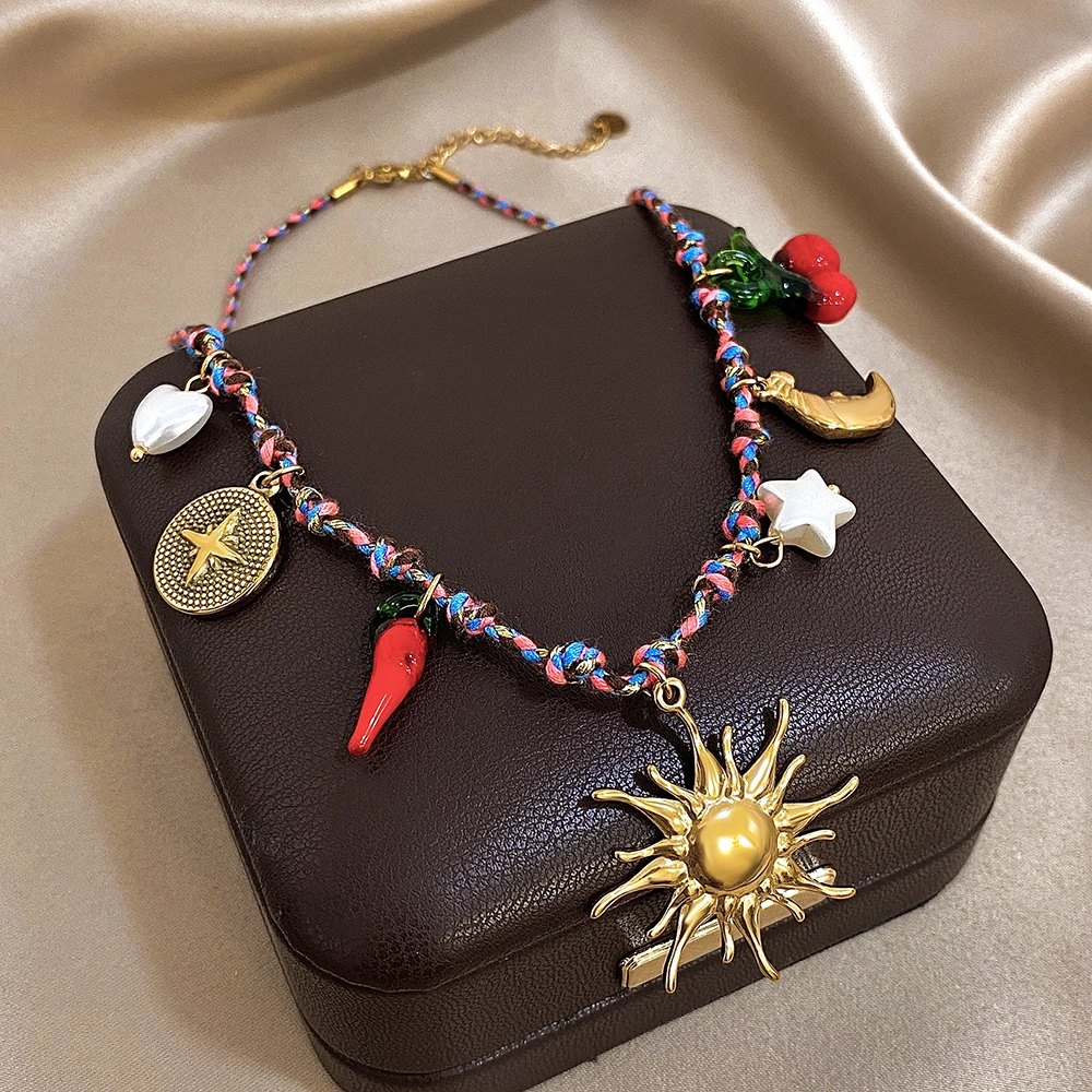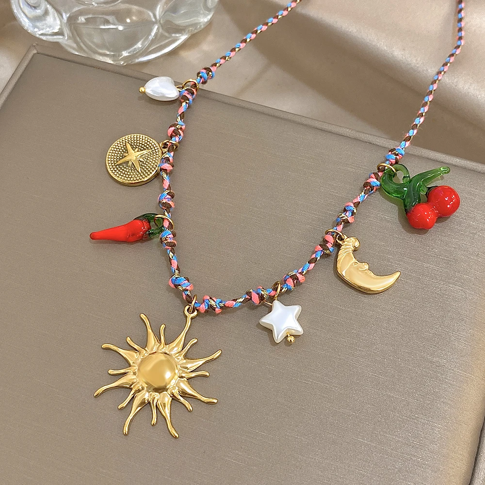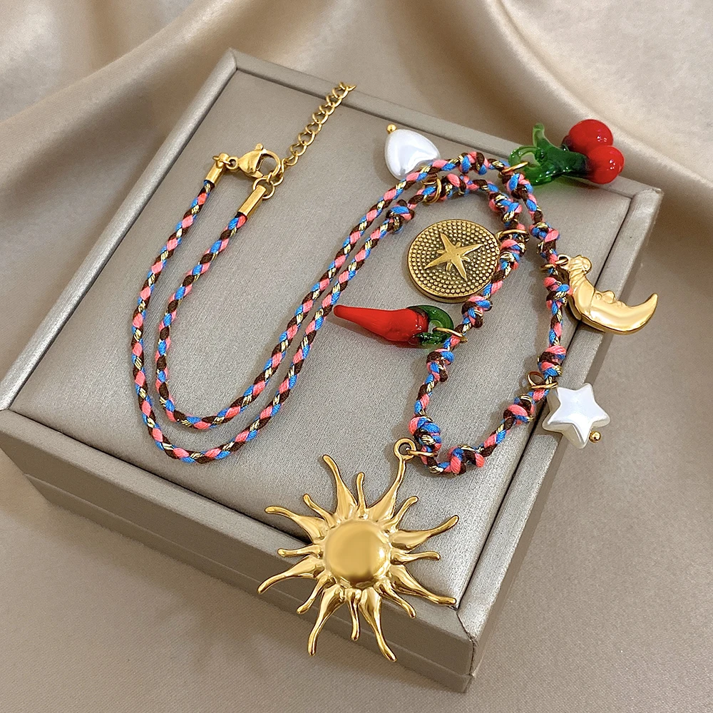 Unique Colorful Rope Braided Necklace for Women Trendy Sun Moon Cherry Charms Choker Necklaces Party Jewelry Gifts