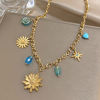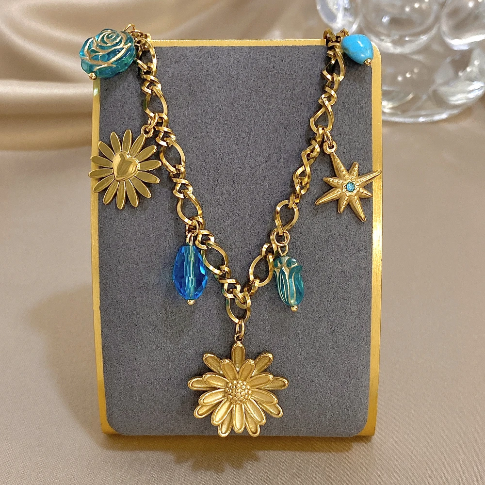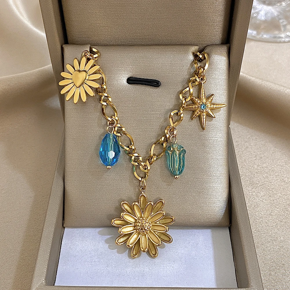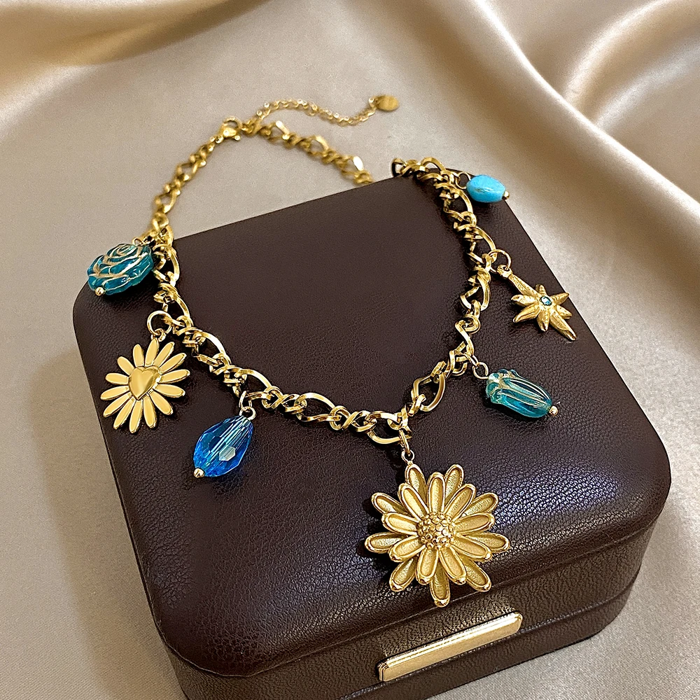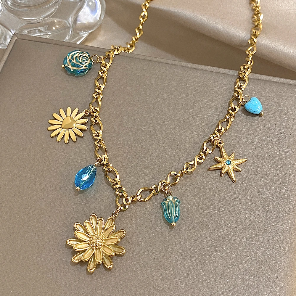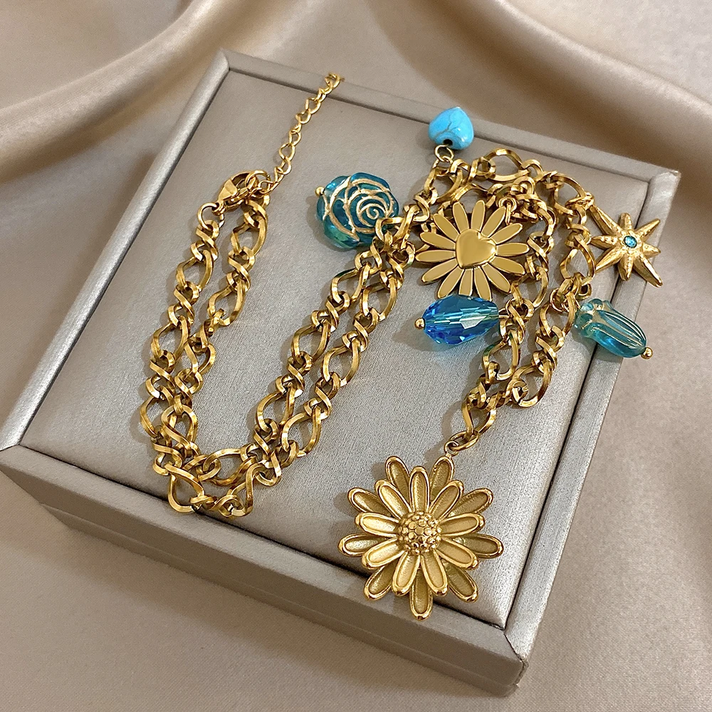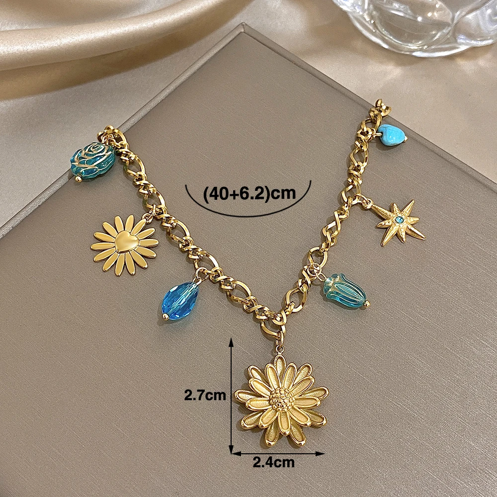 Vintage Gold Plated Stainless Steel Chain Necklace for Women Chic Sun Flower Heart Crystal Charms Necklaces Jewelry Gifts