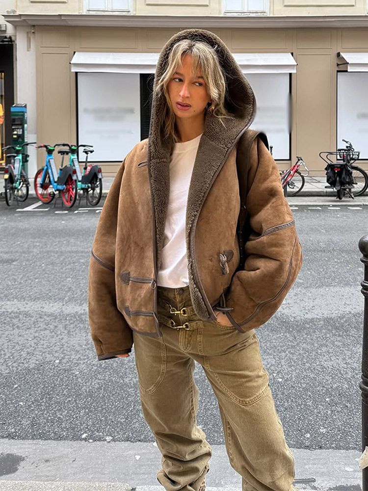 Vintage Lamb Suede Hooded Jacket Women Patchwork Long Sleeves Lapel Canvas Female Coats 2025 Autumn Winter Fashion Lady Outwears