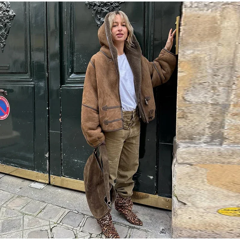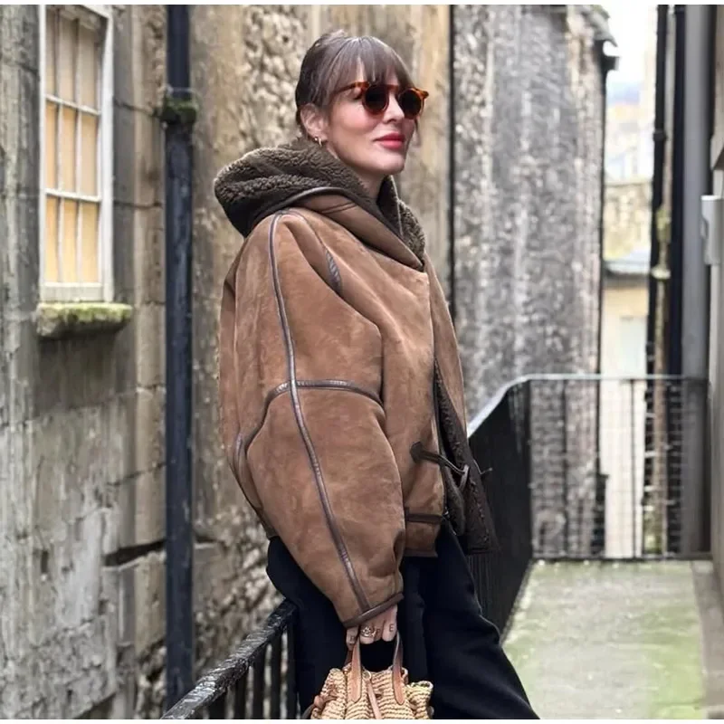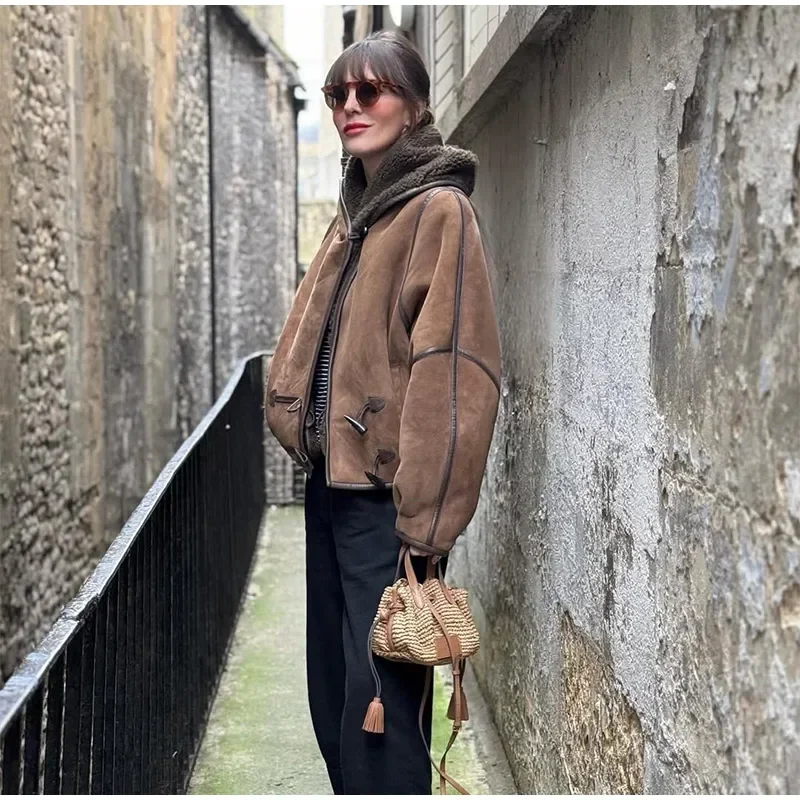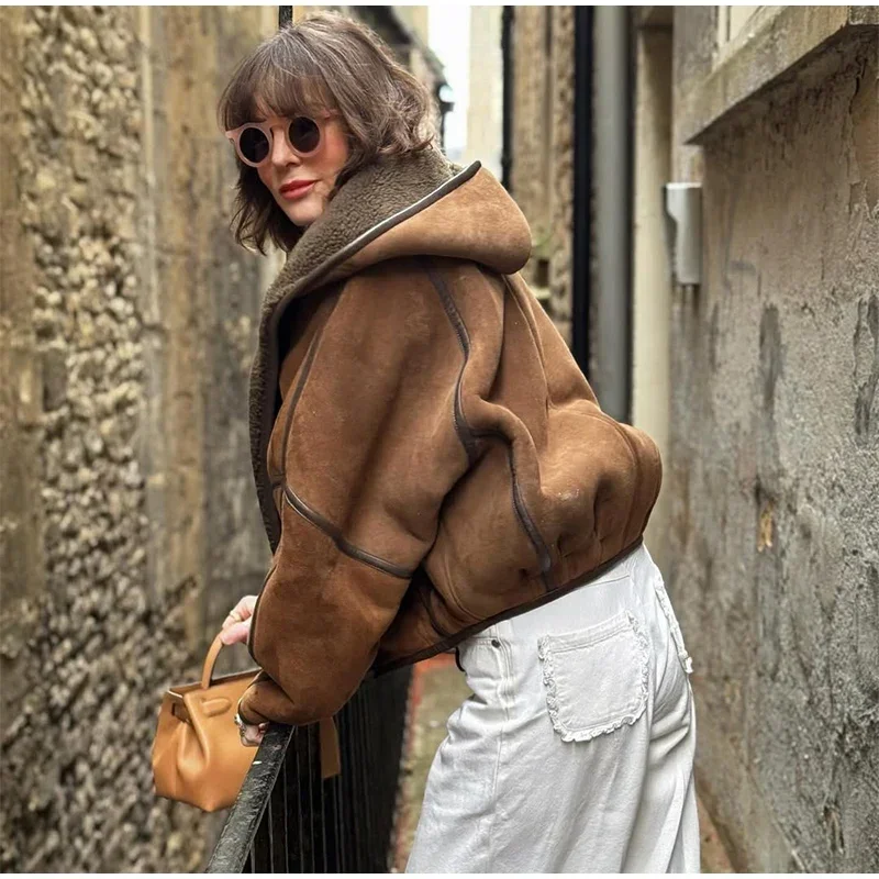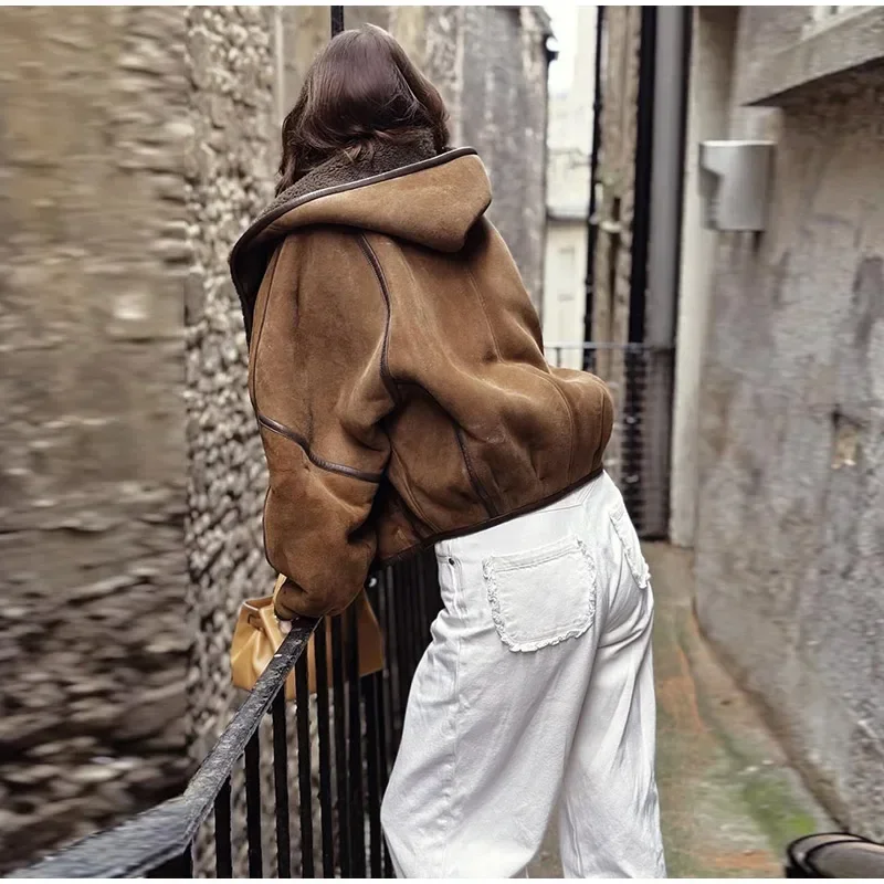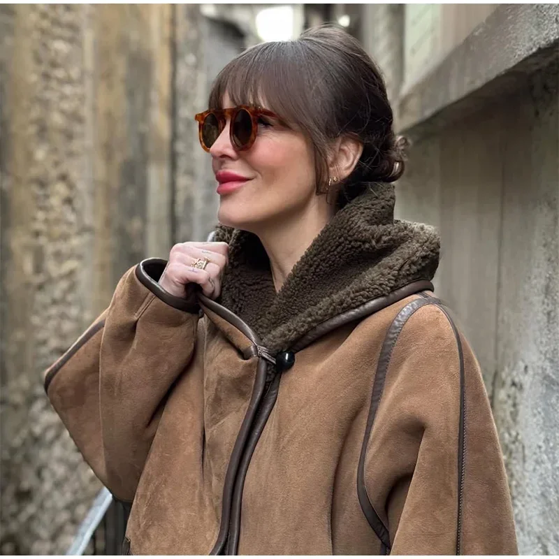 Vintage Lamb Suede Hooded Jacket Women Patchwork Long Sleeves Lapel Canvas Female Coats 2025 Autumn Winter Fashion Lady Outwears