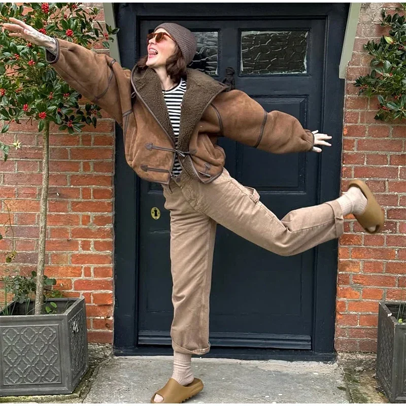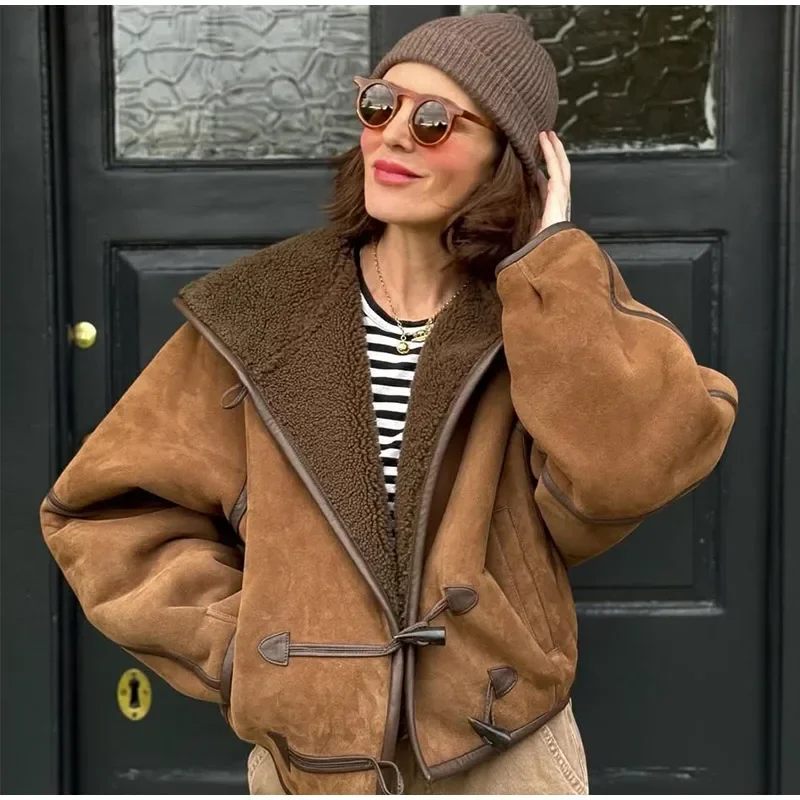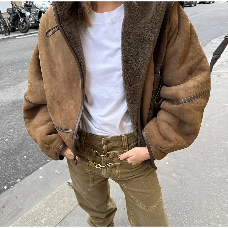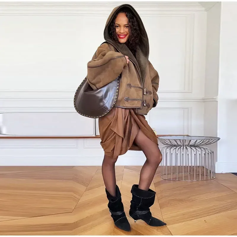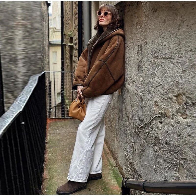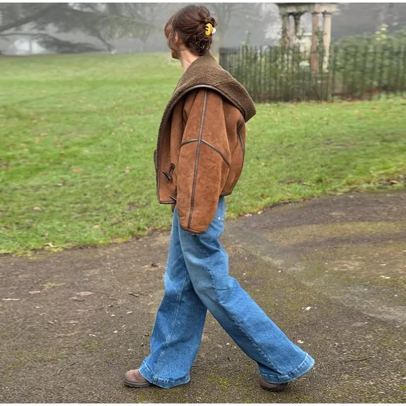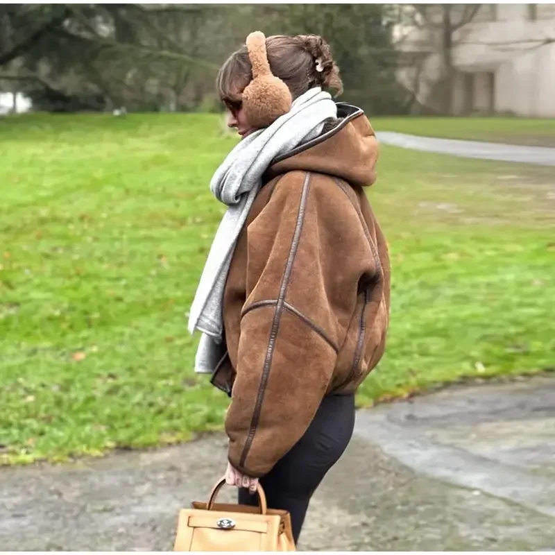 Vintage Lamb Suede Hooded Jacket Women Patchwork Long Sleeves Lapel Canvas Female Coats 2025 Autumn Winter Fashion Lady Outwears