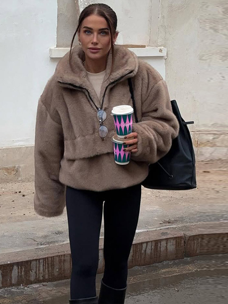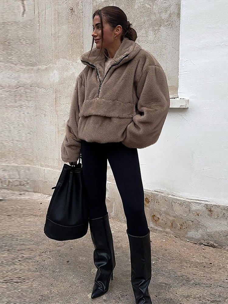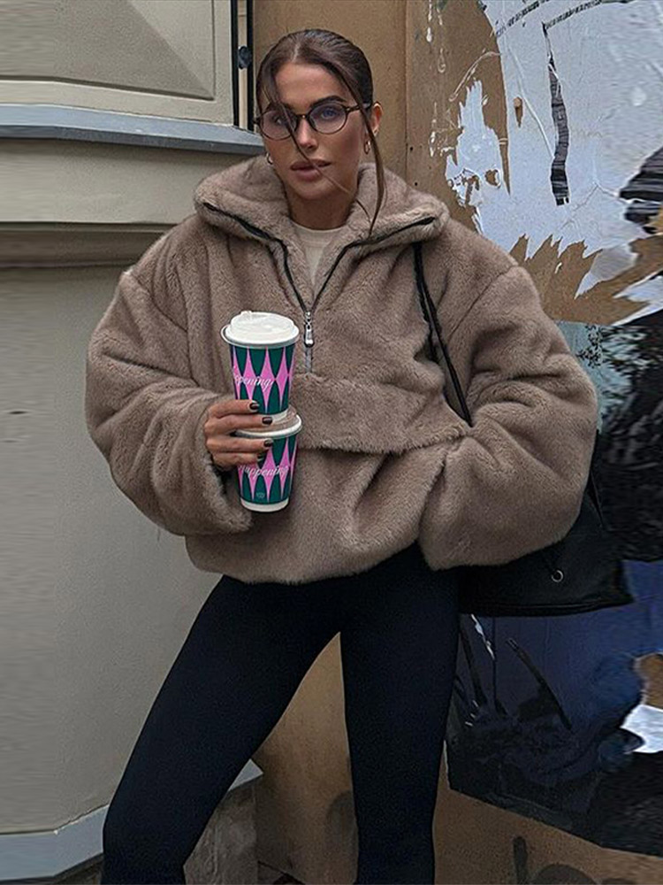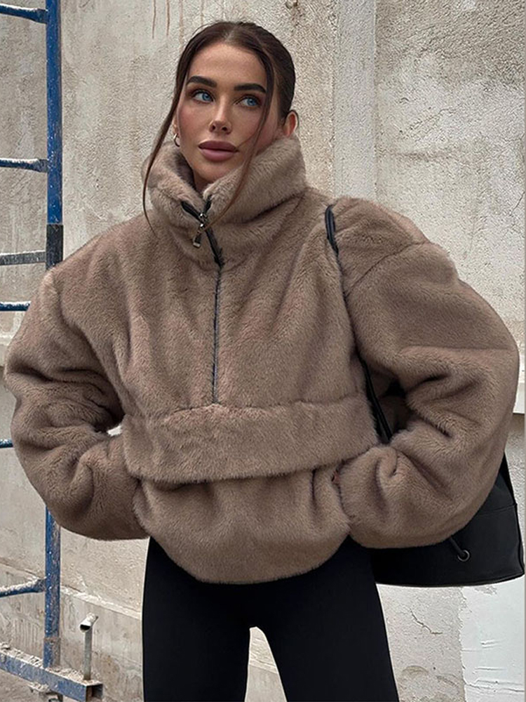 Vintage Solid Faux Fur Coats Women Loose Stand Collar Zipper Long Sleeves Female Jackets 2025 Autumn Winter Lady Sporty Outwears