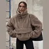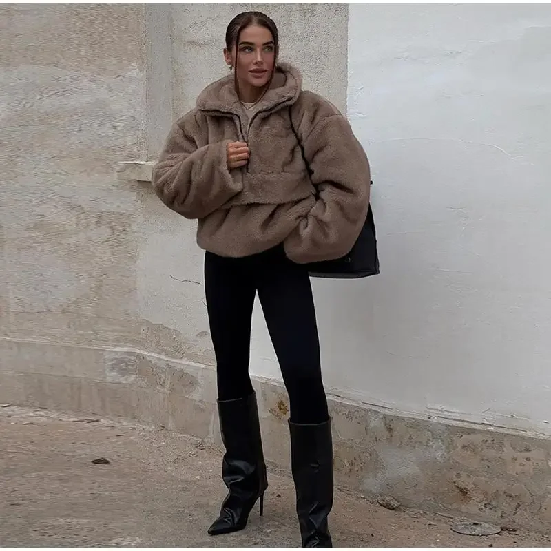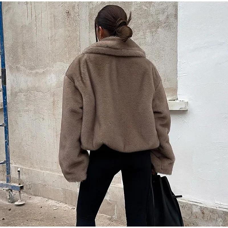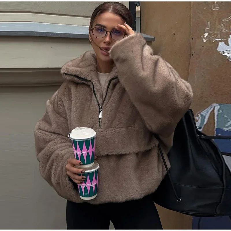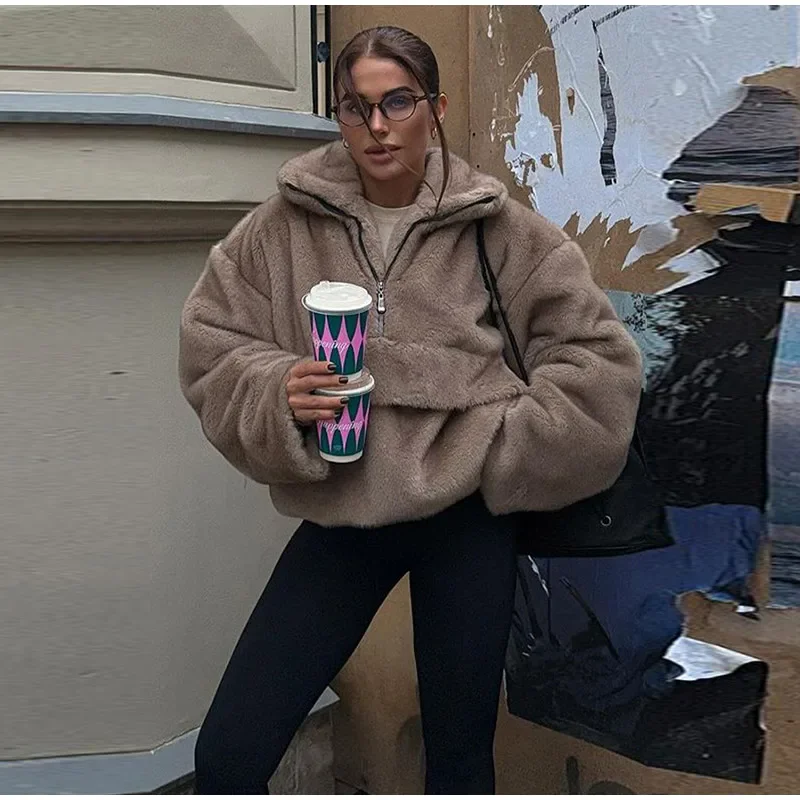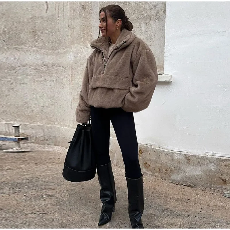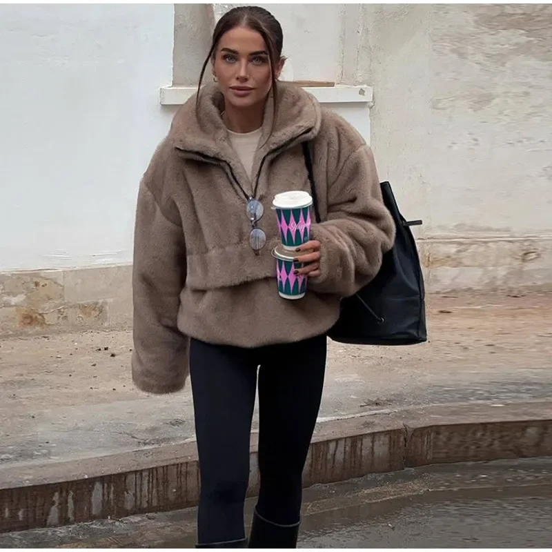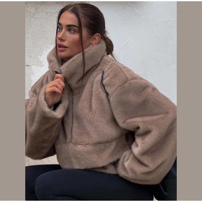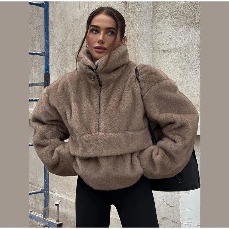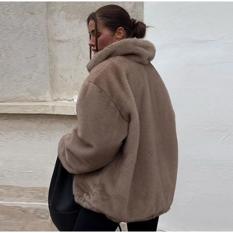 Vintage Solid Faux Fur Coats Women Loose Stand Collar Zipper Long Sleeves Female Jackets 2025 Autumn Winter Lady Sporty Outwears