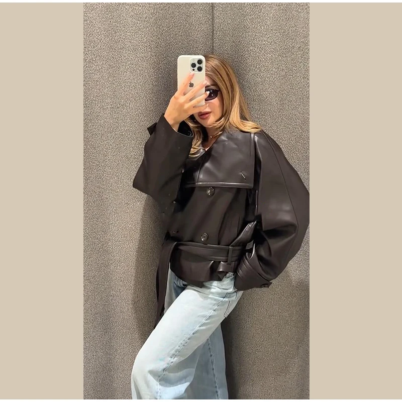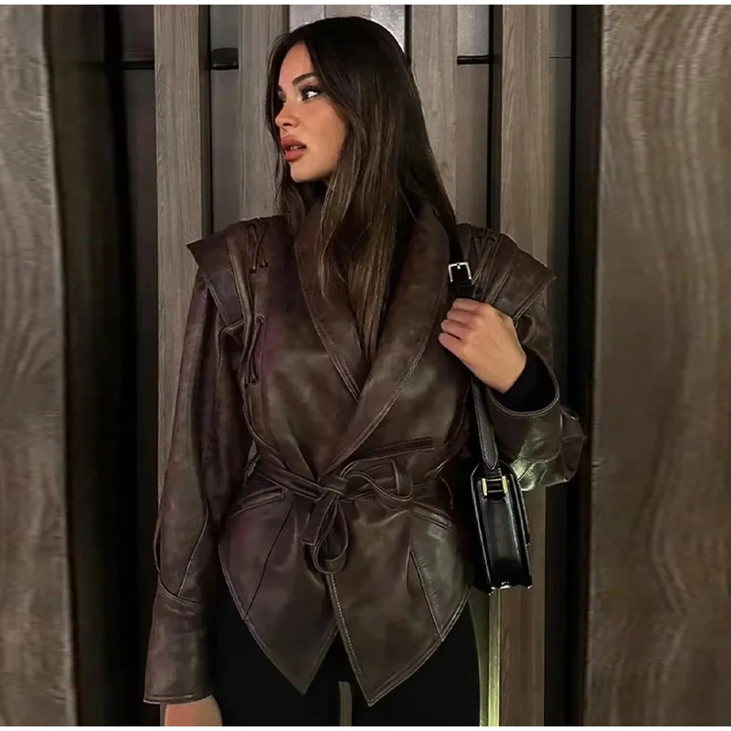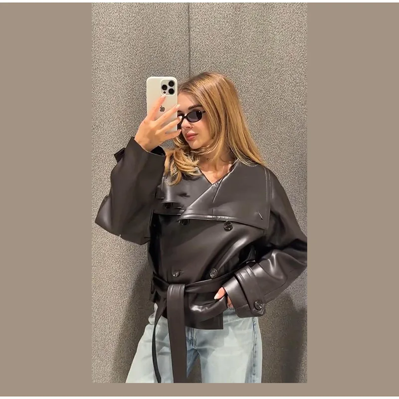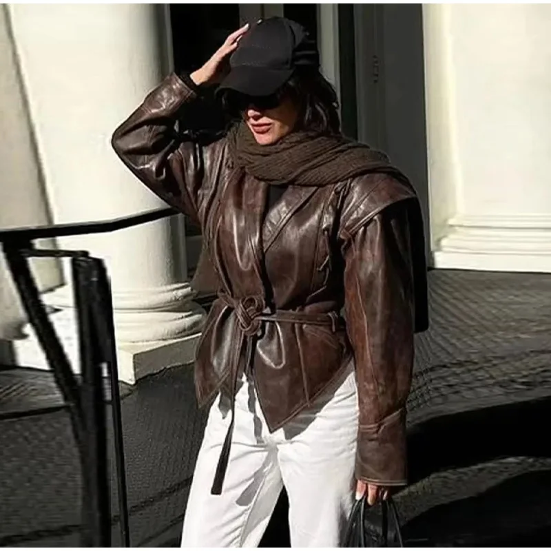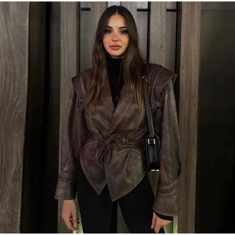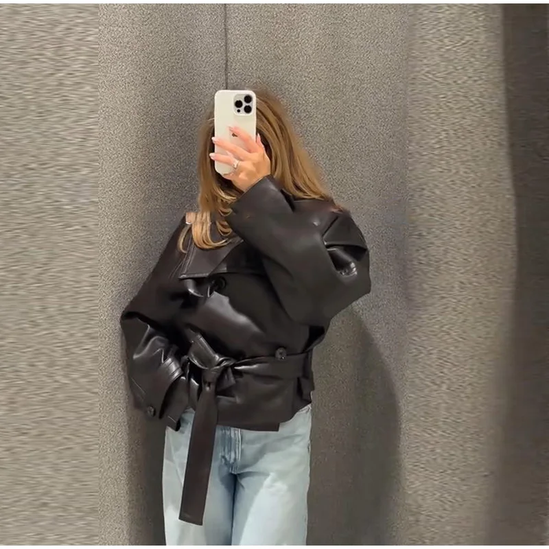 Vintage Street Pu Faux Leather Jacket for Women With Belt V Neck Button Long Sleeve Motorcycle Coat 2025 Autumn Ladies Outerwear