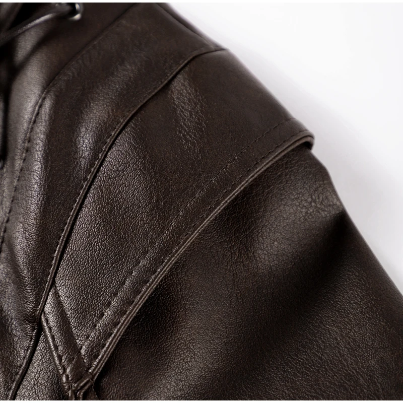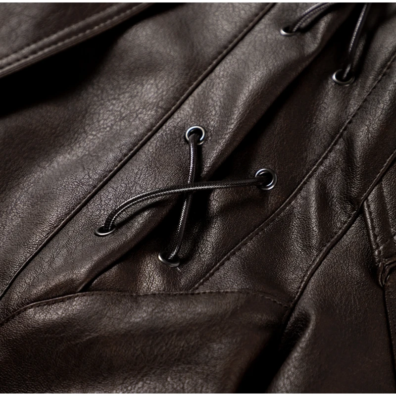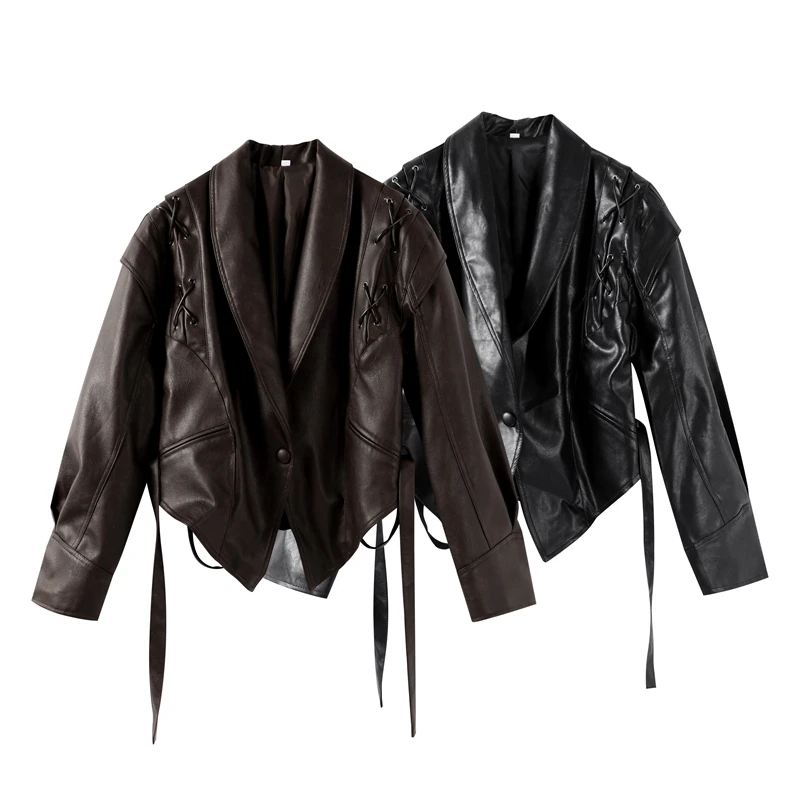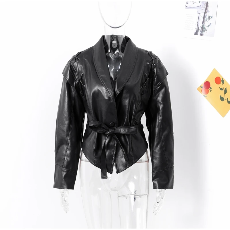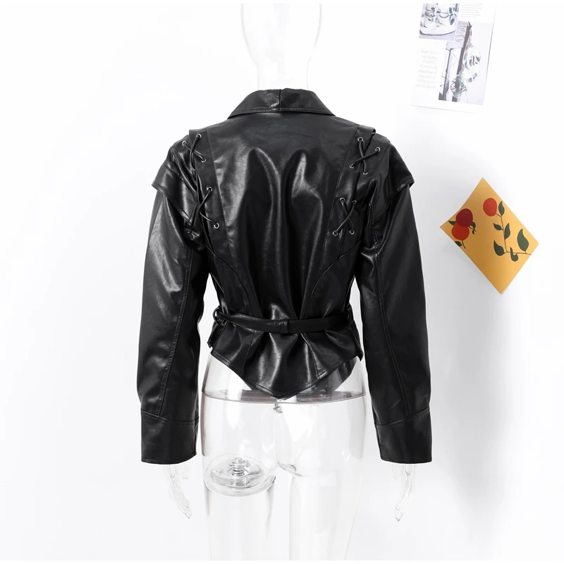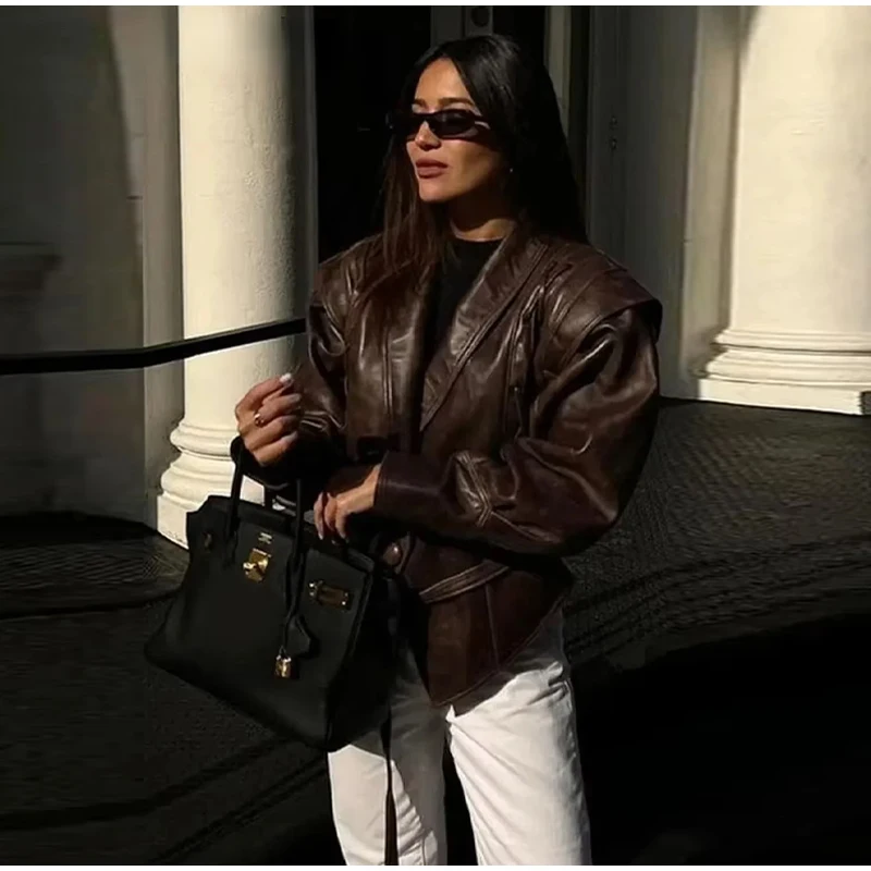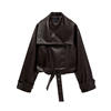 Vintage Street Pu Faux Leather Jacket for Women With Belt V Neck Button Long Sleeve Motorcycle Coat 2025 Autumn Ladies Outerwear