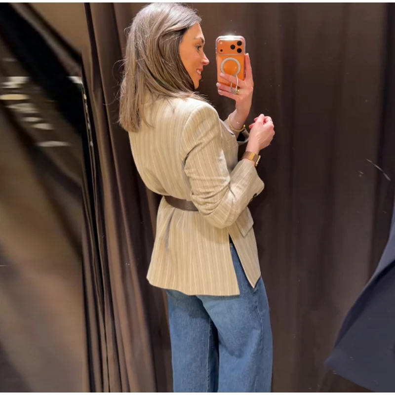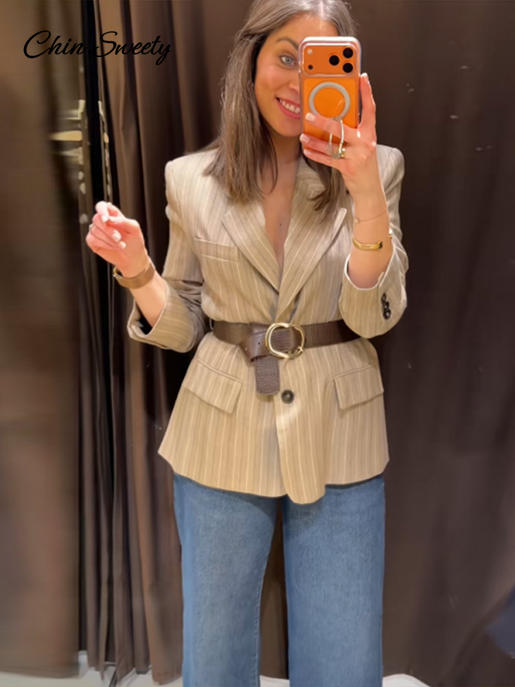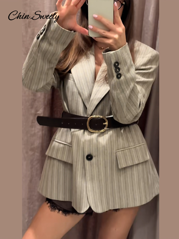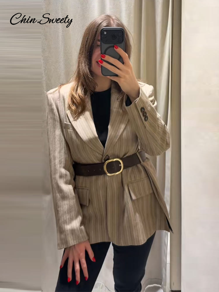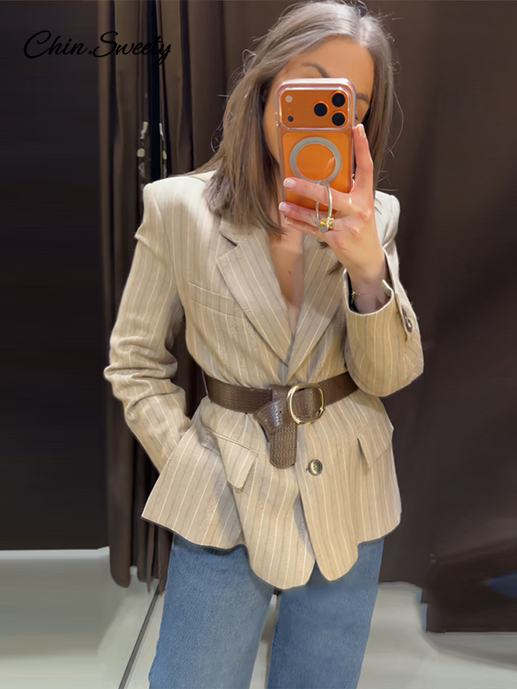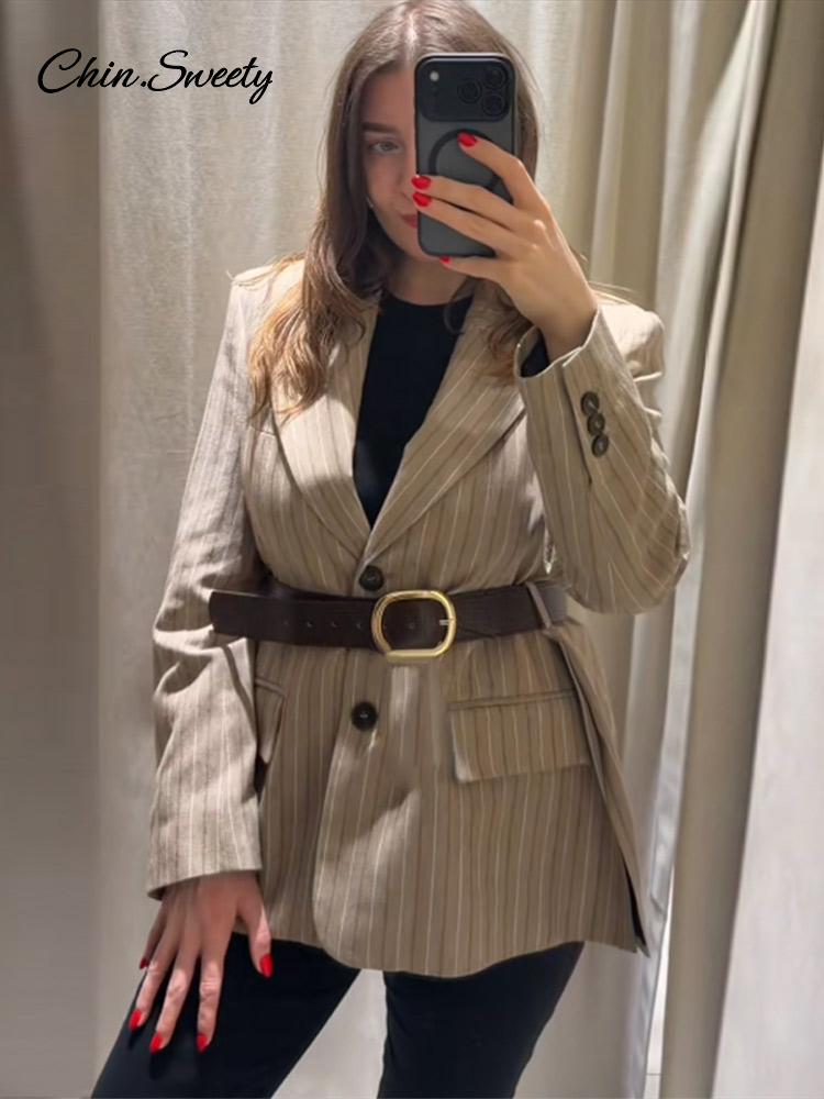 Vintage Stripe Belt Suit Women Lapel Single Breasted Full Sleeve Waist Cinching Blazer Jacket Lady New Elegant Fashion Outwear