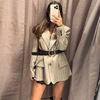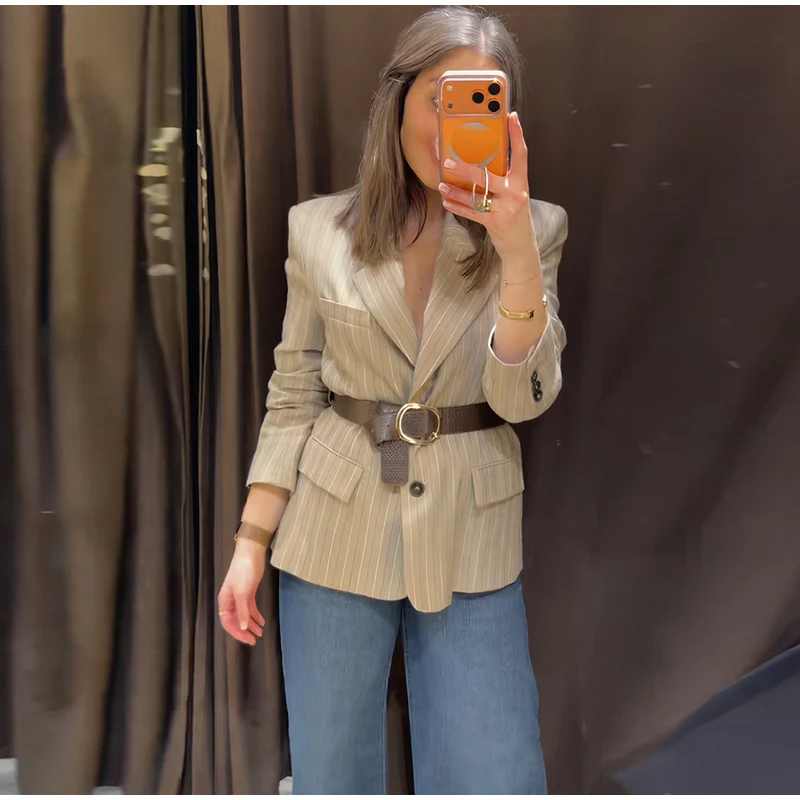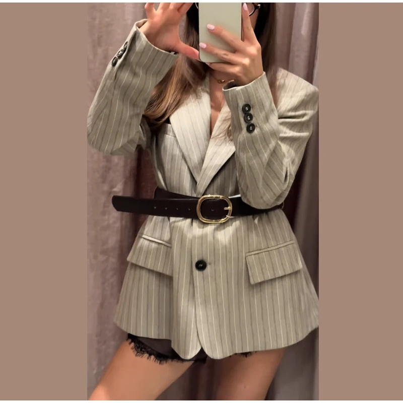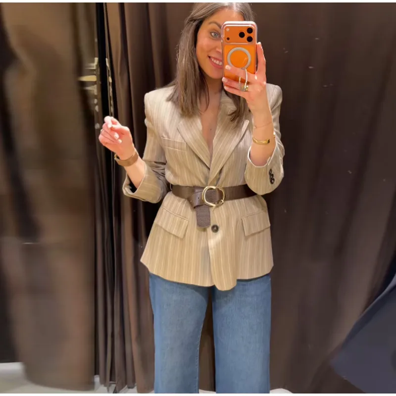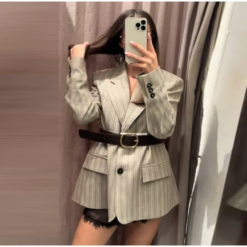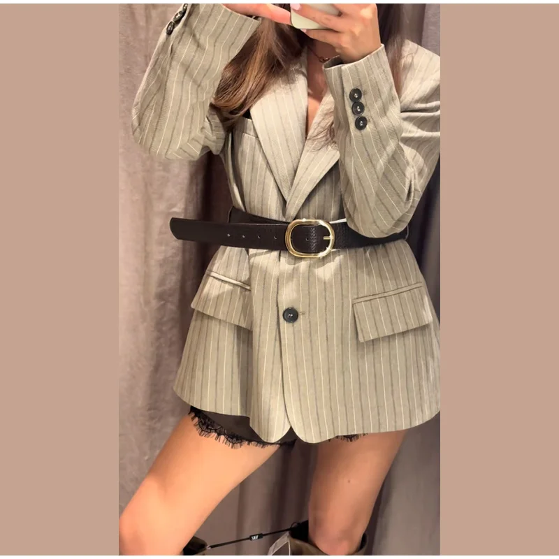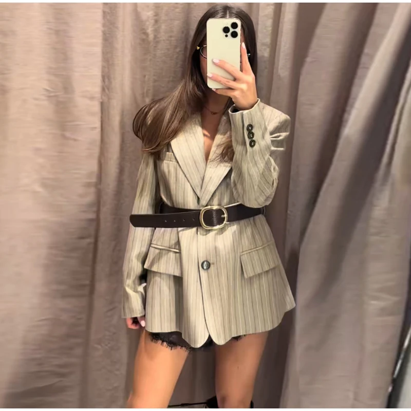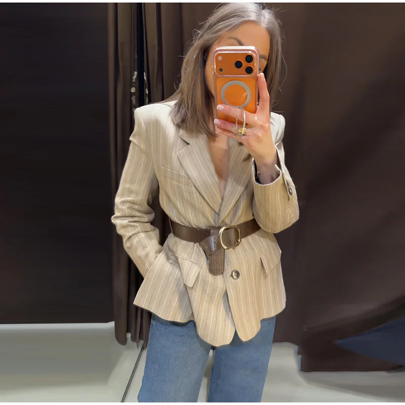 Vintage Stripe Belt Suit Women Lapel Single Breasted Full Sleeve Waist Cinching Blazer Jacket Lady New Elegant Fashion Outwear