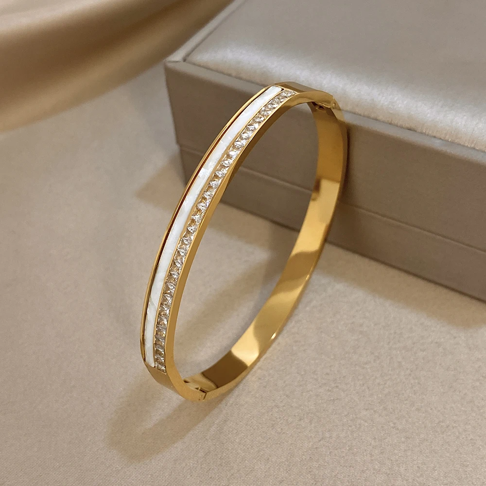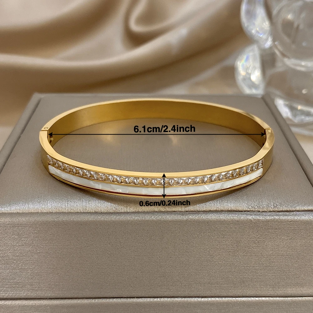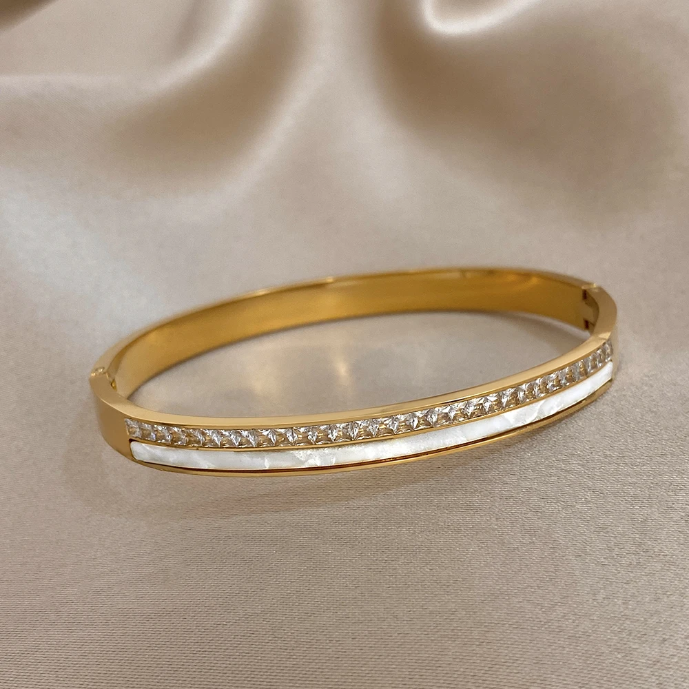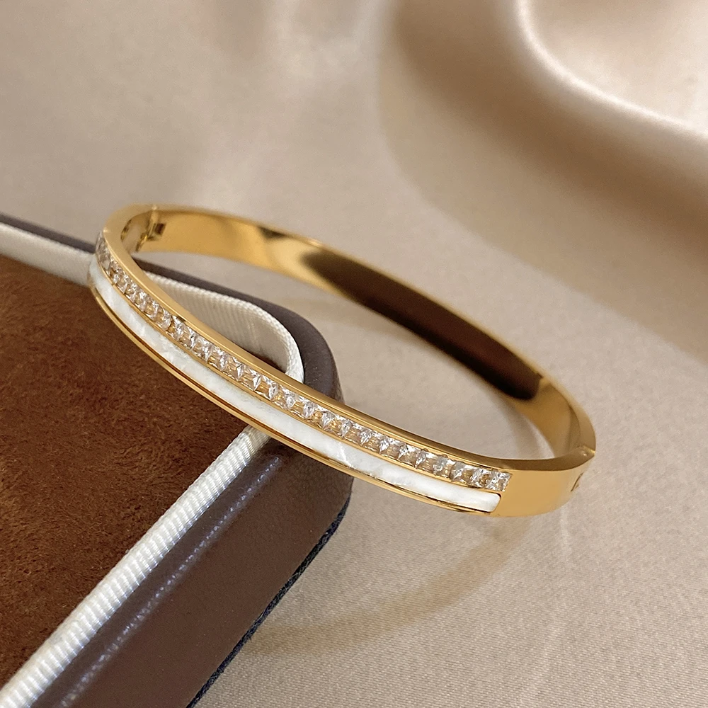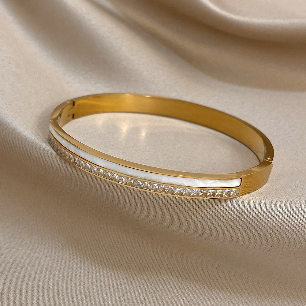 Vintage Zircon Shell Patchwork Cuff Bangle Bracelets for Women Chic Gold Plated Stainless Steel Wrist Bracelet Party Jewelry