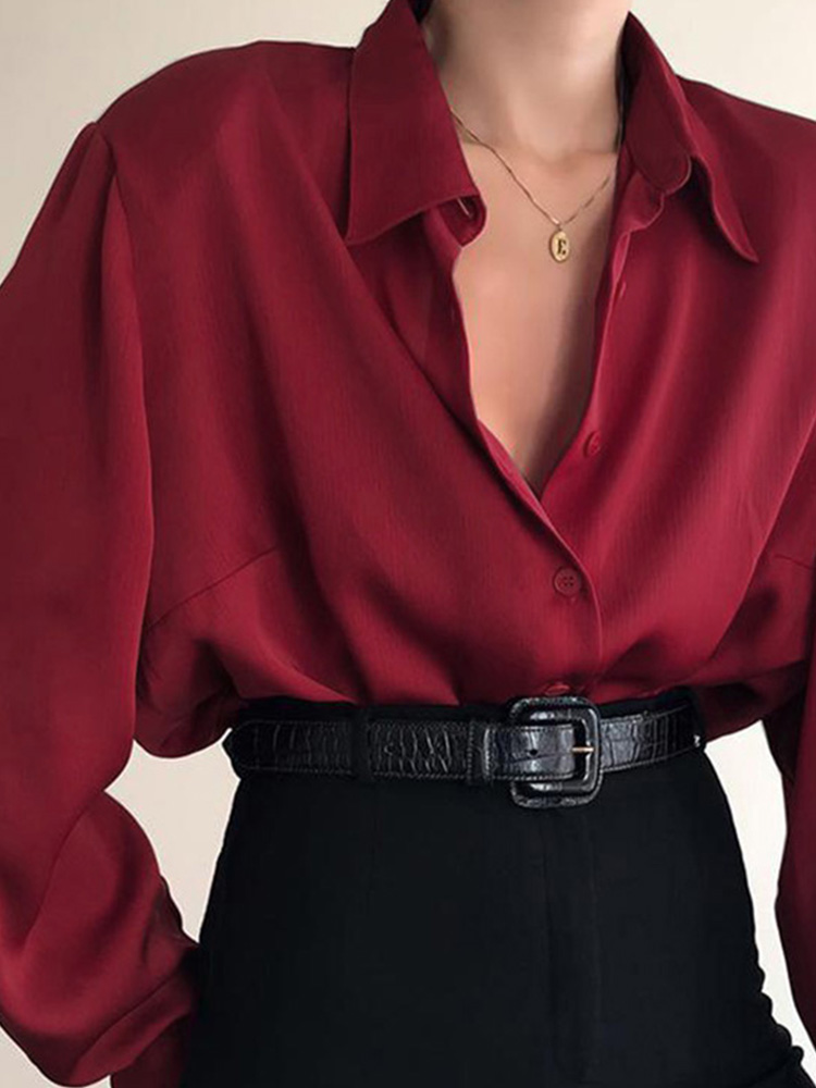Women Button Blouses Turn Down Collar Shirts Office Lady Long Sleeve Casual Blouse Loose OL Shirt Baggy Tops Red/Wine Red /Black