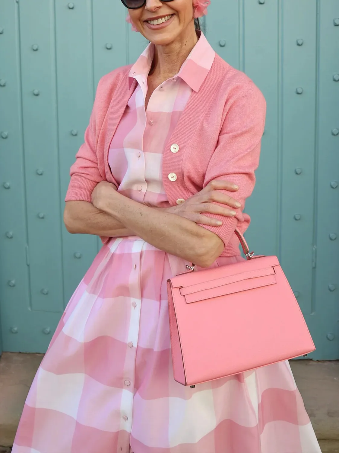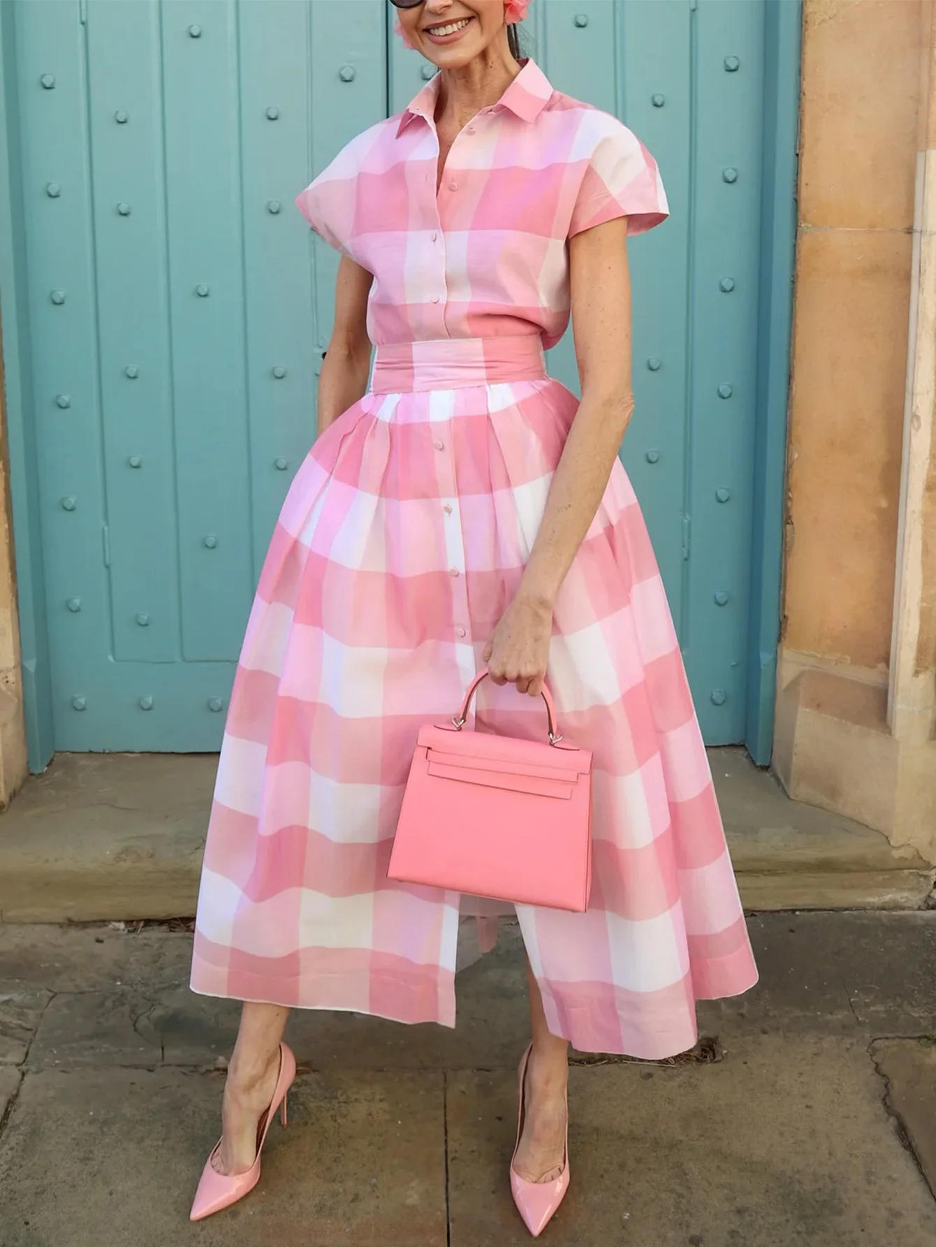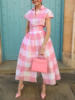 Women Dress 2025 Tonval Turn Down Collar with Bow Buttons Vintage Long Dresses Pink and White Gingham Print Elegant Swing Dress