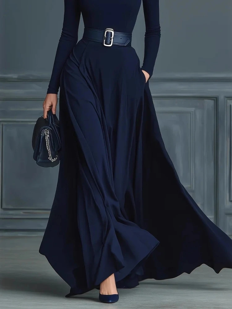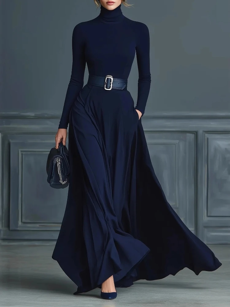 Women Elegant Solid Color Turtleneck Maxi Dress Solid With Pockets Long Skirt Dresses Long Sleeve Office Party Long Dresses