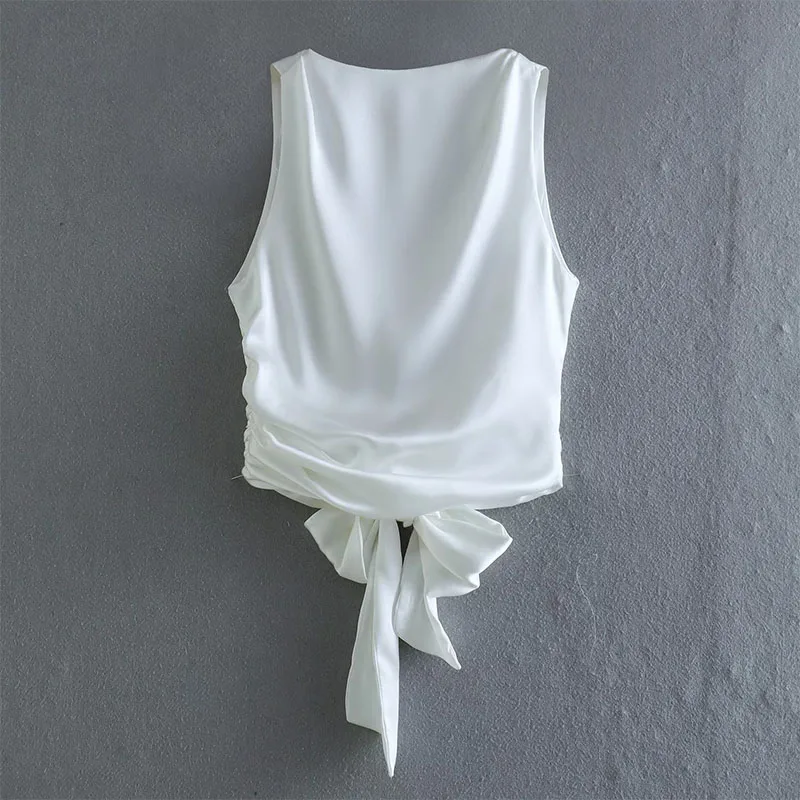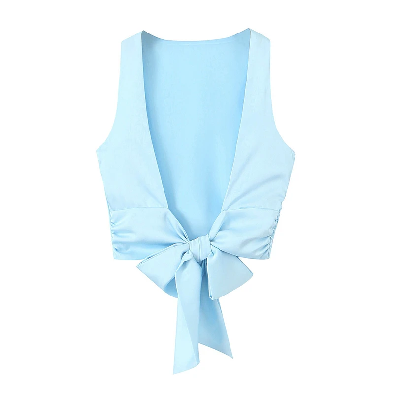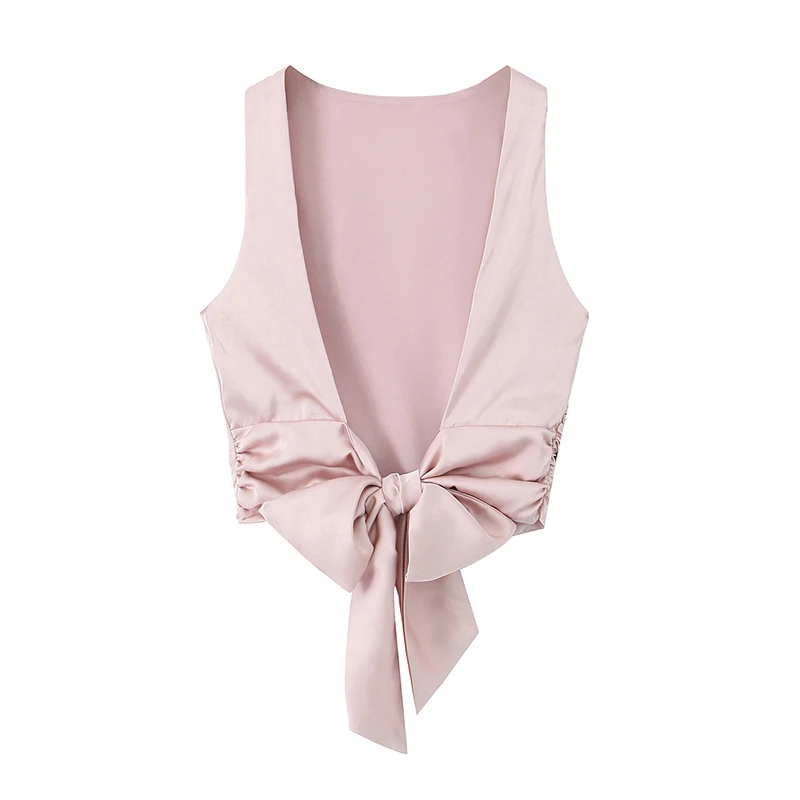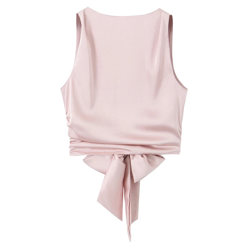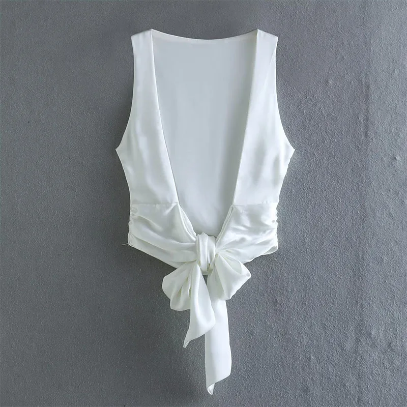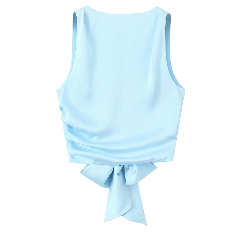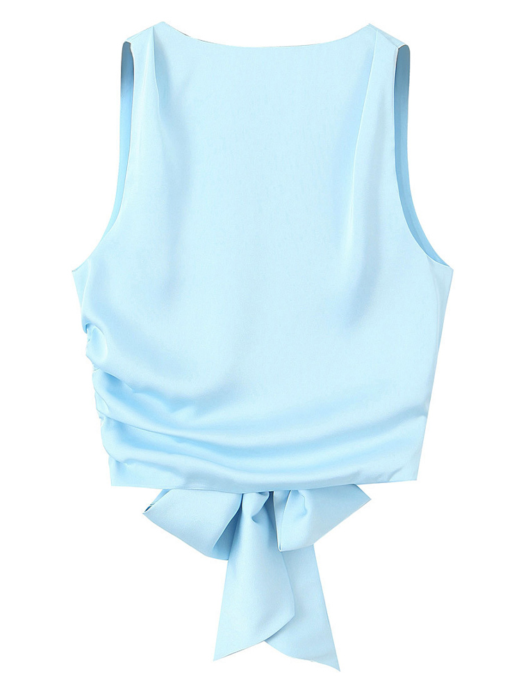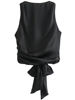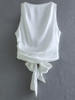 Women Fashion With Bow Solid Pleated Backless Cropped Tank Tops Vintage O-Neck Sleeveless Female Chic Lady Tops