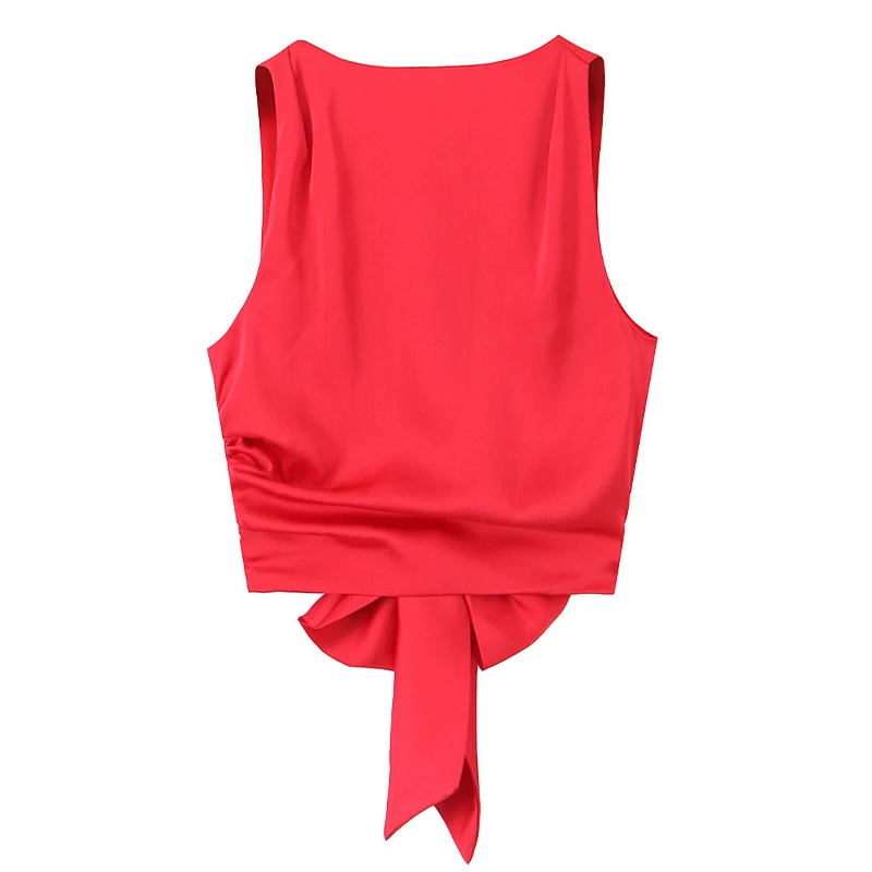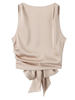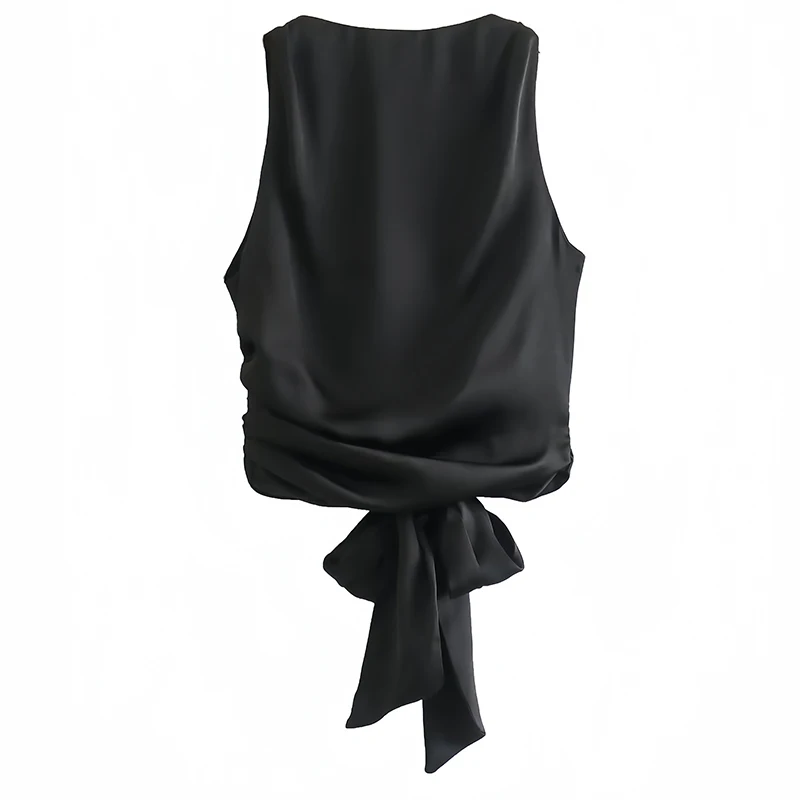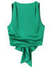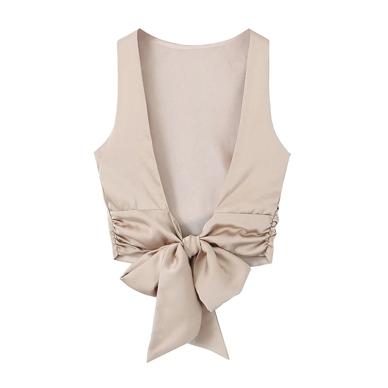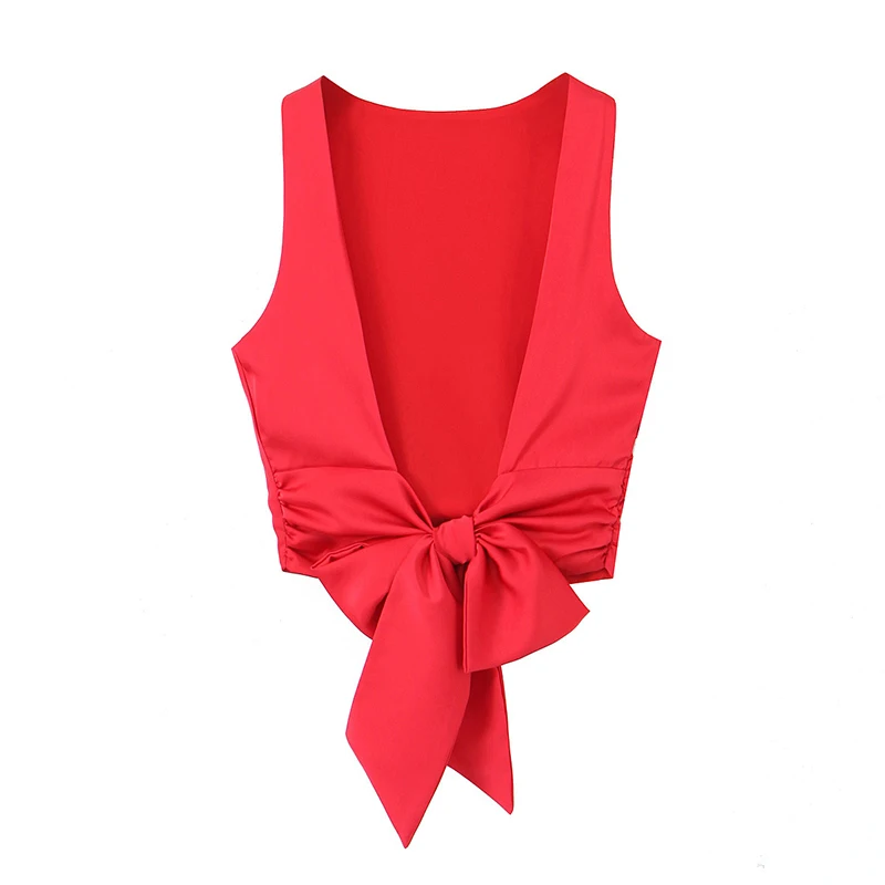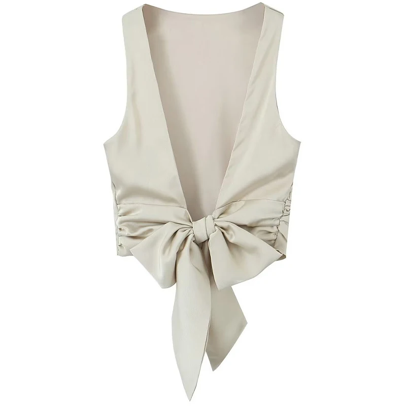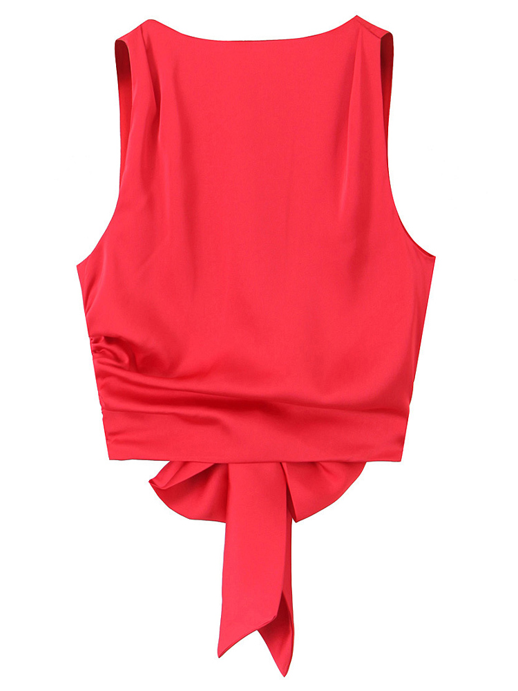 Women Fashion With Bow Solid Pleated Backless Cropped Tank Tops Vintage O-Neck Sleeveless Female Chic Lady Tops