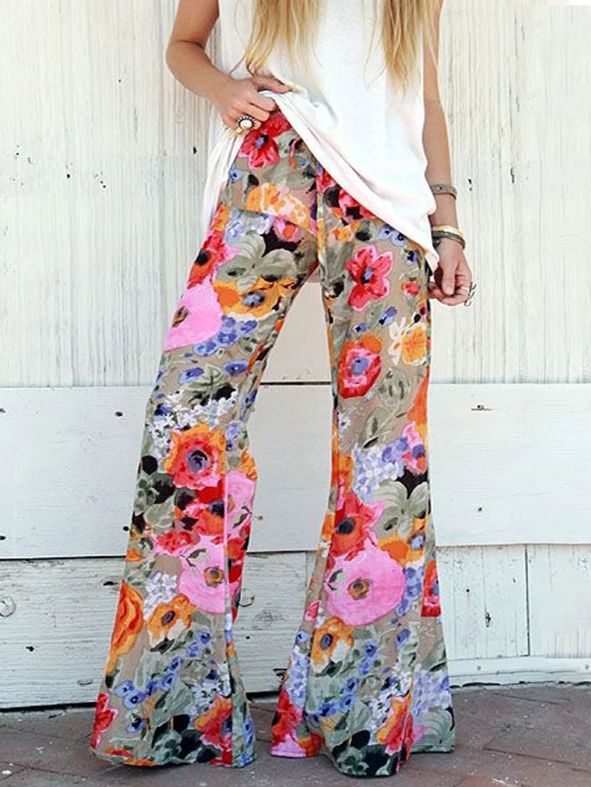 Women Holiday Long Pants Fashion Wide Leg Trouser 2024 Spring Summer Elastic Waisted Pantalons Bohemian Floral Printed Pants