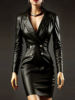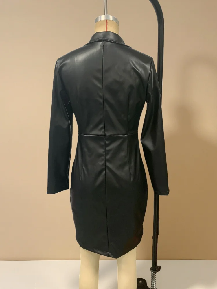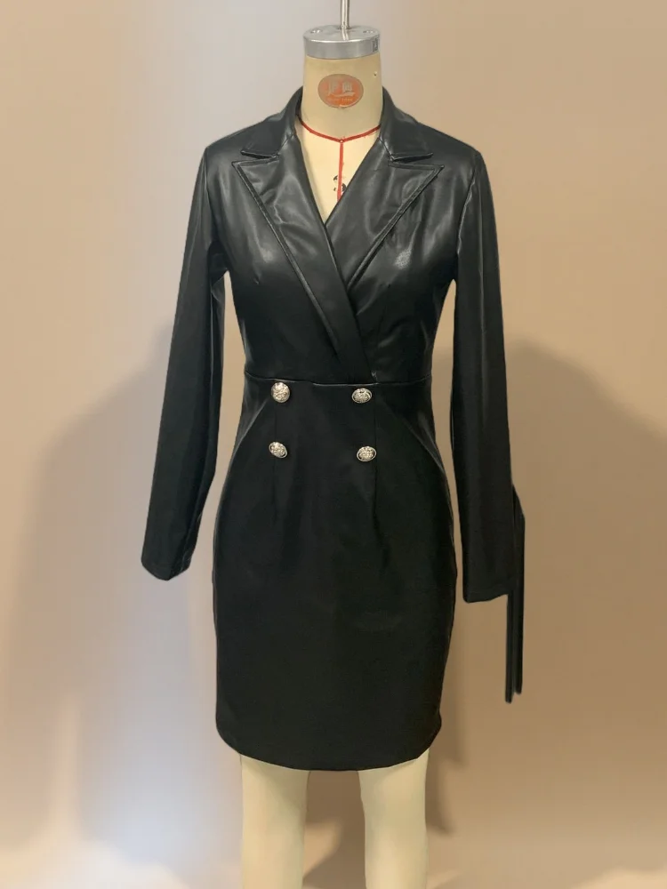 Women PU Leather Dress Lapel Collar Double Button Long Sleeve Chic Vintage Pockets Slim Elegant Office Lady Mini Dresses