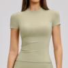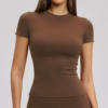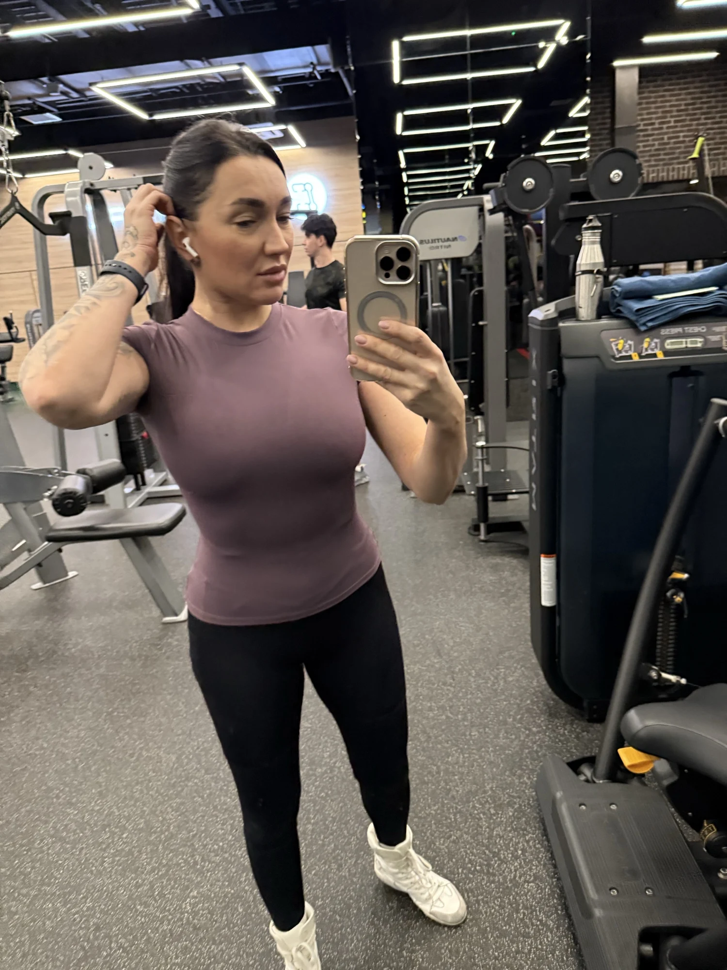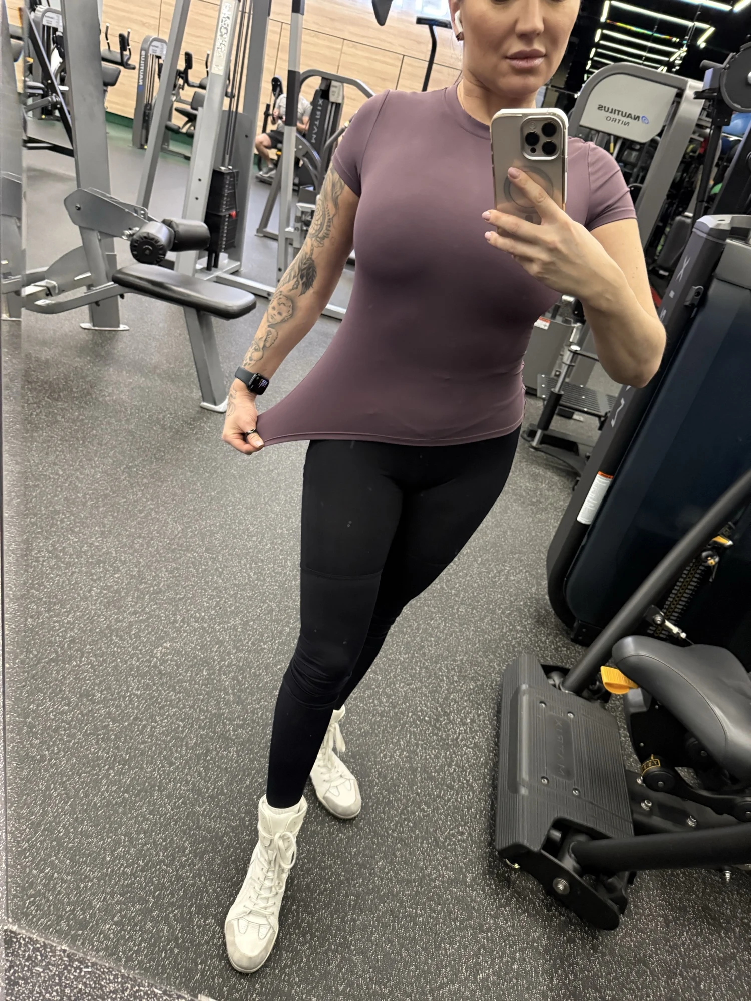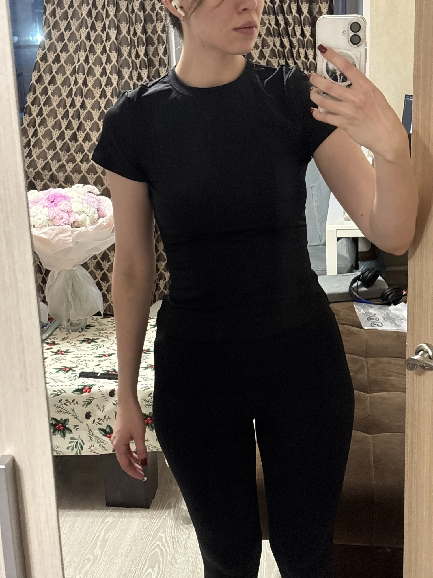 Super t-shirt! Perfect for fitness! The length is optimal, the back and stomach are not exposed, stretches beautifully, sewn with quality, everyone looks for some loose threads - there are none here. Not see-through. No smell. Could have taken a size larger, but it's fine as it is.