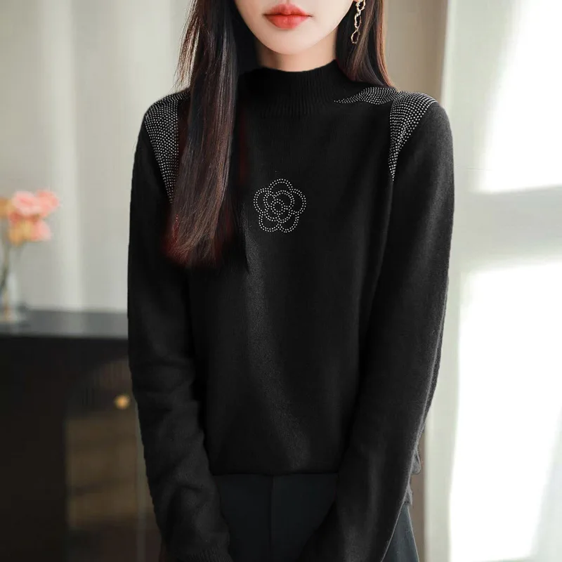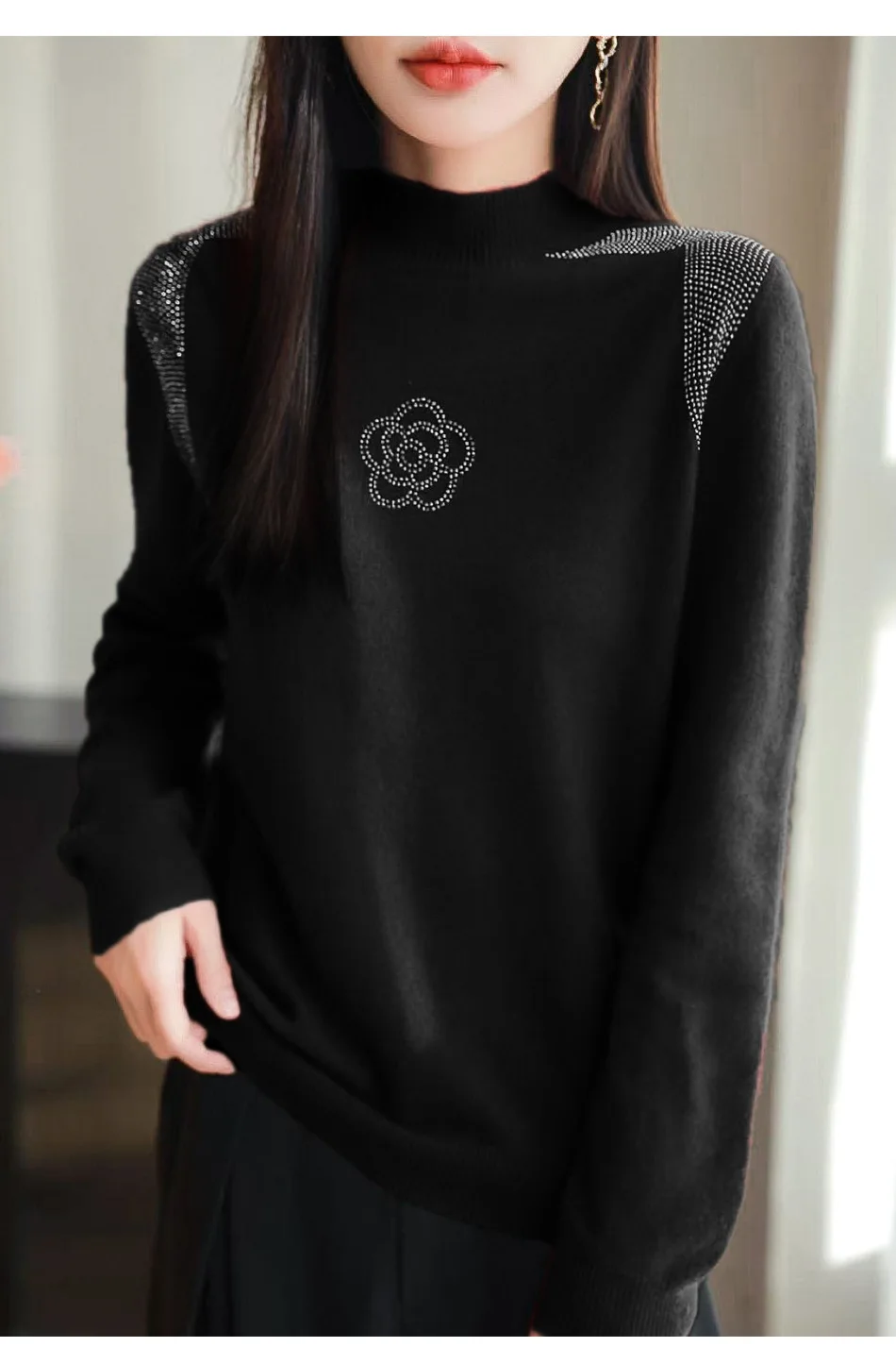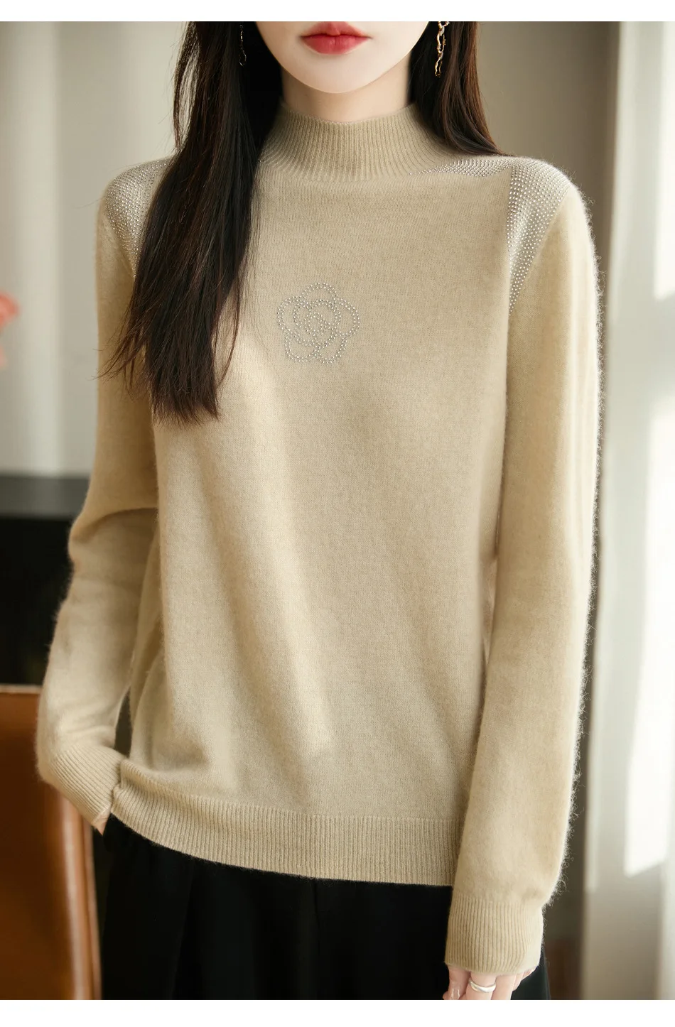 Women Sweater Autumn Winter Beading Long Sleeve Knitted Pullovers Mock Neck Warm Bottoming Shirts Loose Korean Fashion Jumpers