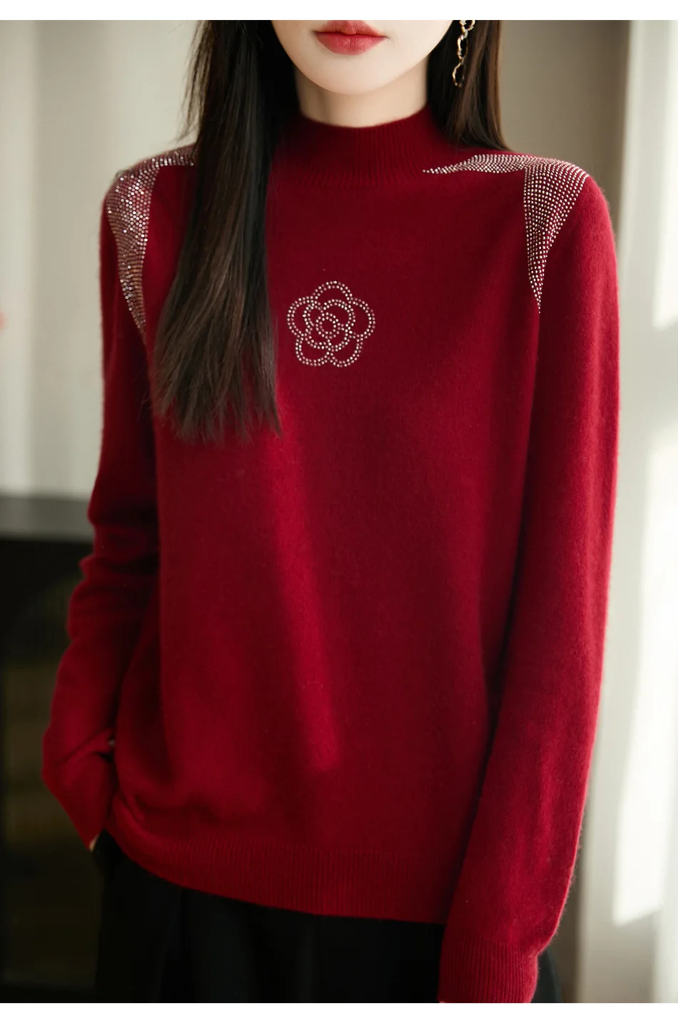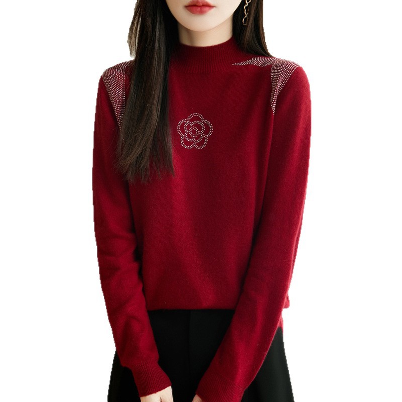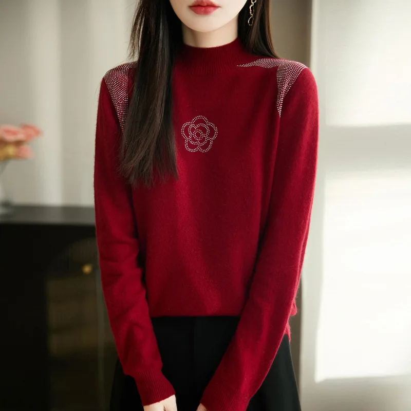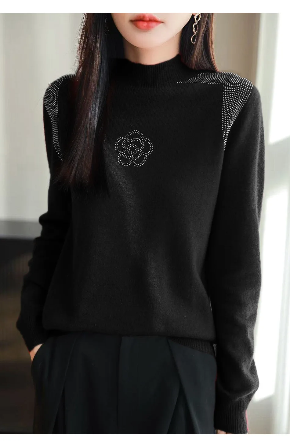 Women Sweater Autumn Winter Beading Long Sleeve Knitted Pullovers Mock Neck Warm Bottoming Shirts Loose Korean Fashion Jumpers