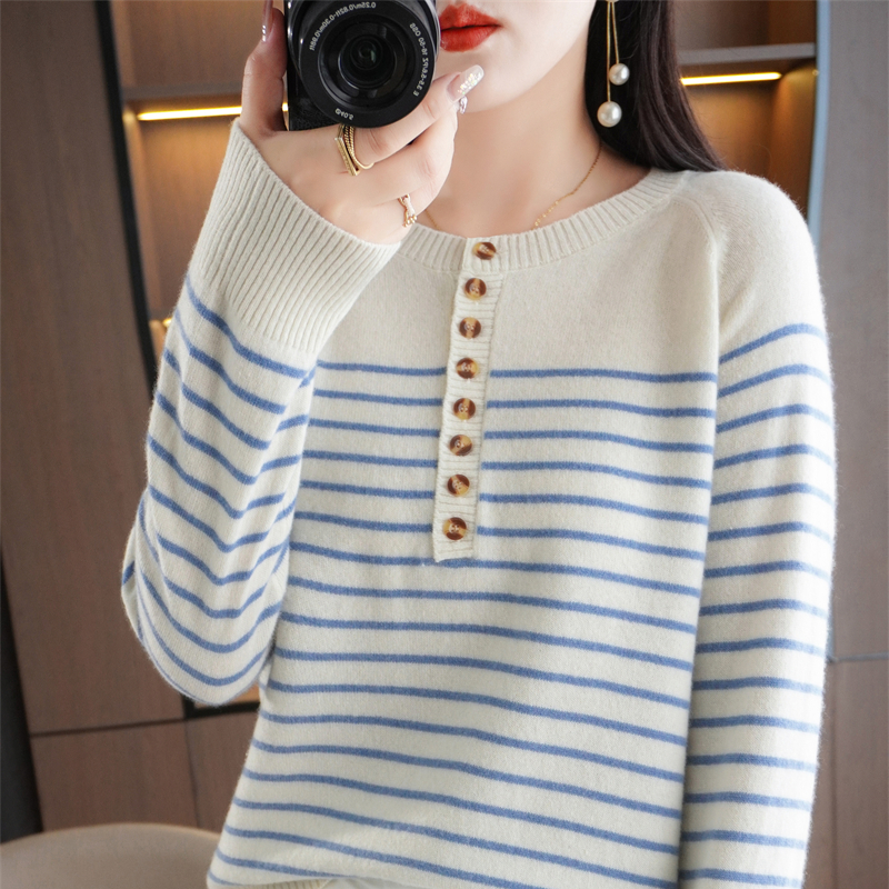 Women Sweater Autumn Winter O-neck Cotton Warm Loose Striped Buttons Long Sleeve Bottoming Shirt Casual Korean Pullovers Jumpers
