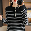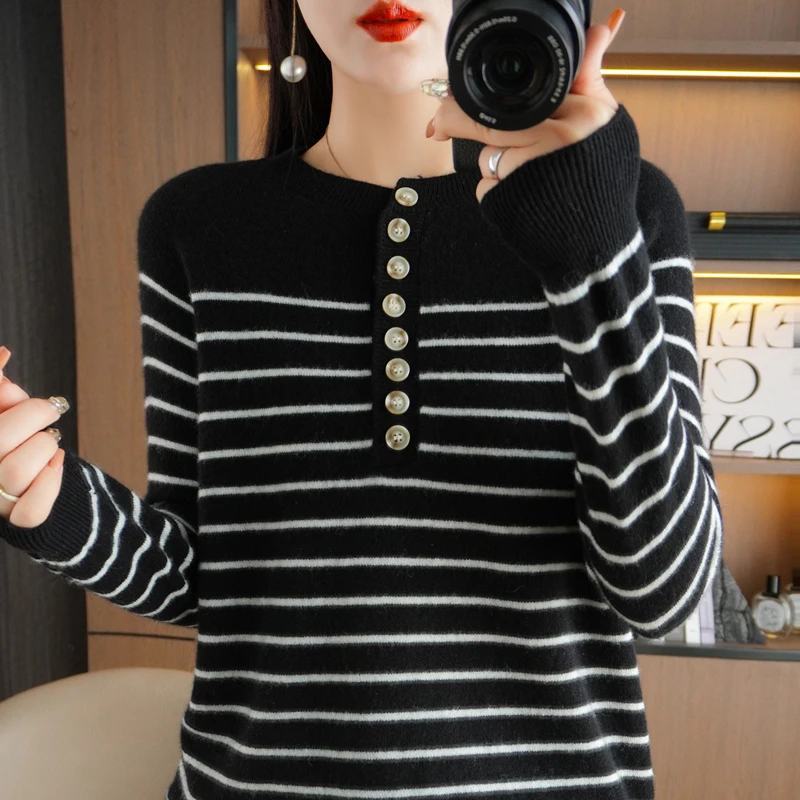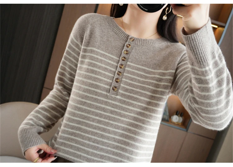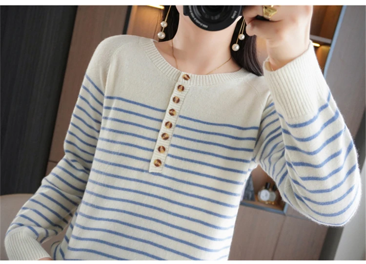 Women Sweater Autumn Winter O-neck Cotton Warm Loose Striped Buttons Long Sleeve Bottoming Shirt Casual Korean Pullovers Jumpers