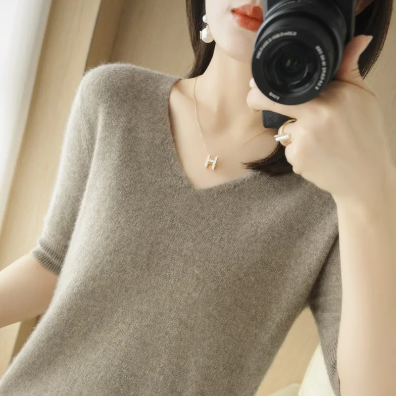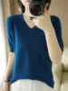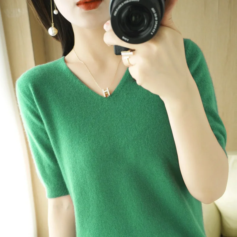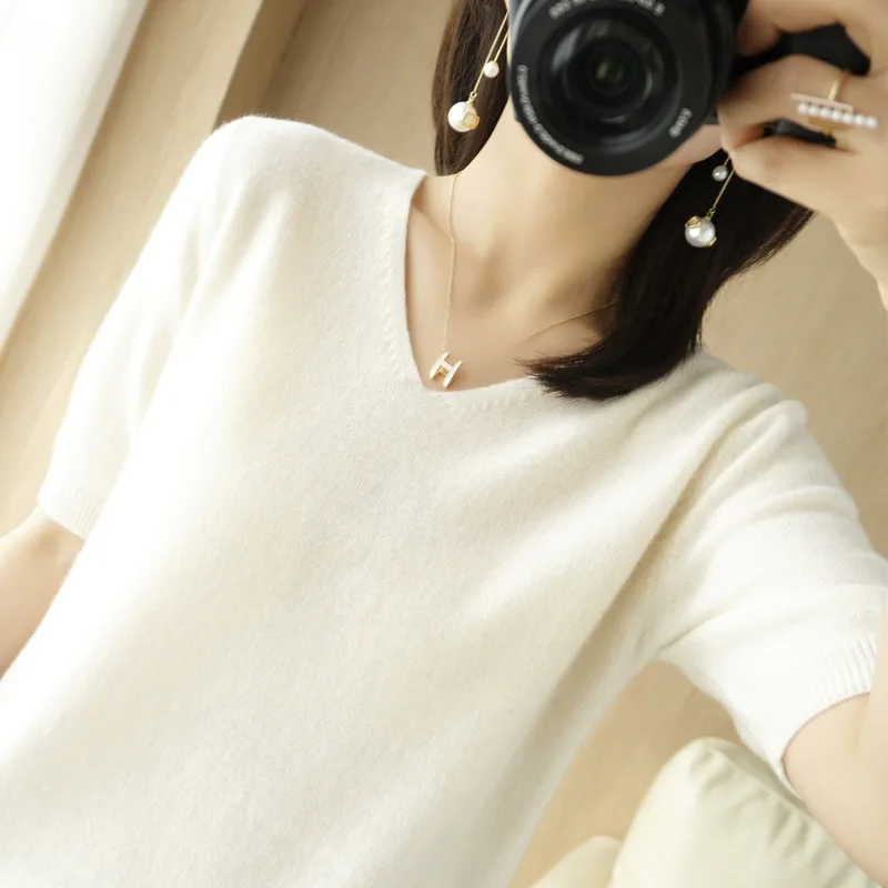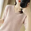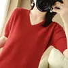Women Sweaters Spring Summer Short Sleeve V-neck Thin Pullovers Solid Korean Fashion Bottoming Shirt Soft Knitwear Jumpers