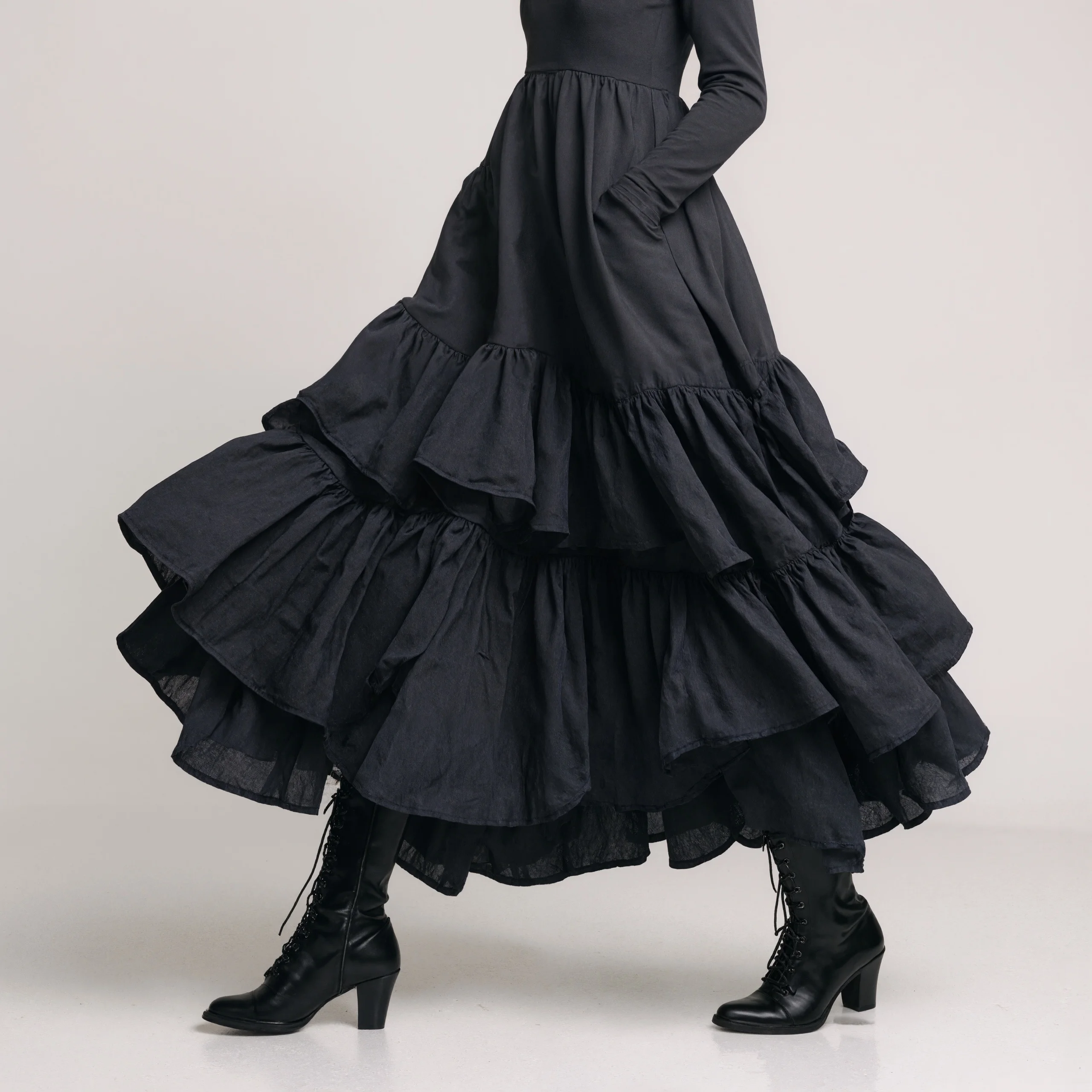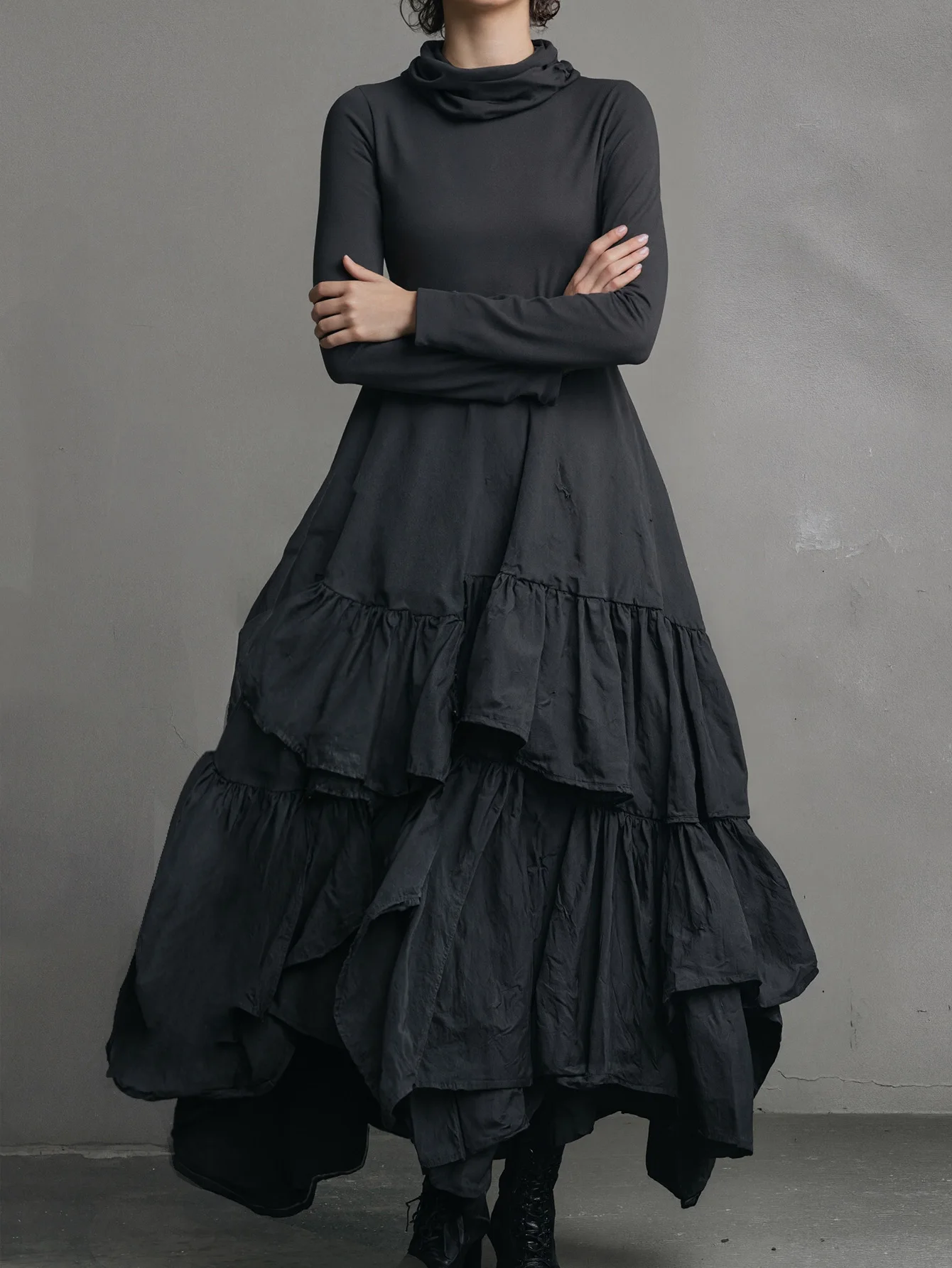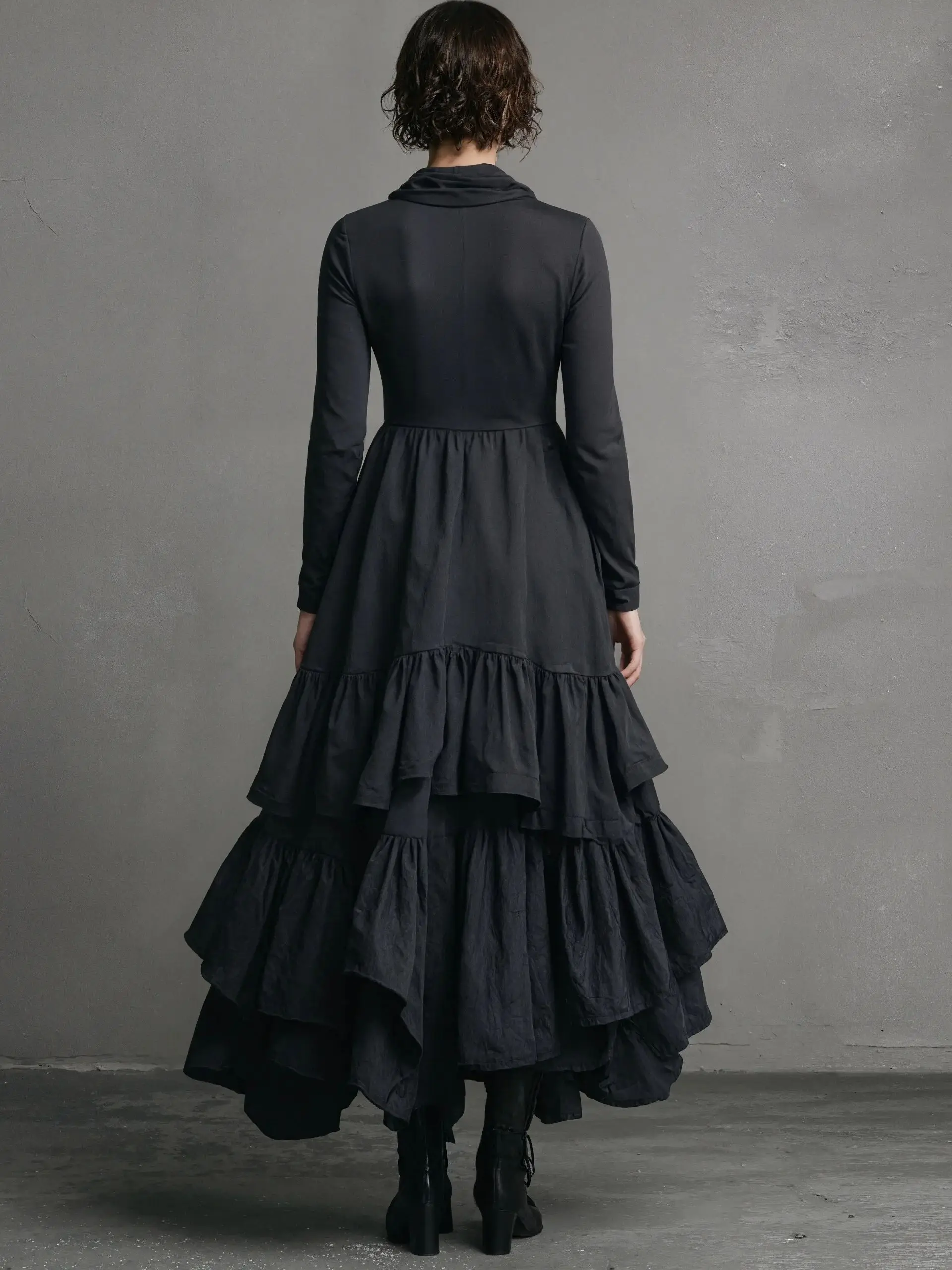 Women Vintage Dress Scarf Collar Splicing Tiered Ruffle Hem Long Sleeve Dress Autumn Winter Pocket Casual Party Dresses