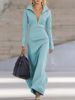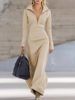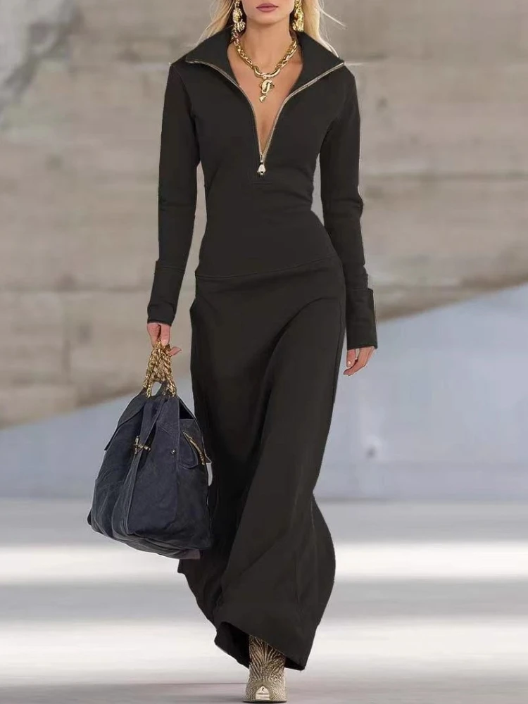 Women’s Elegant Solid Maxi Dress Simple Zipper POLO Neck Slim Waist Hem Swing Stretch Robe Retro Long Sleeves Shirt Dresses