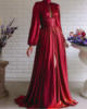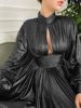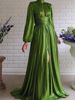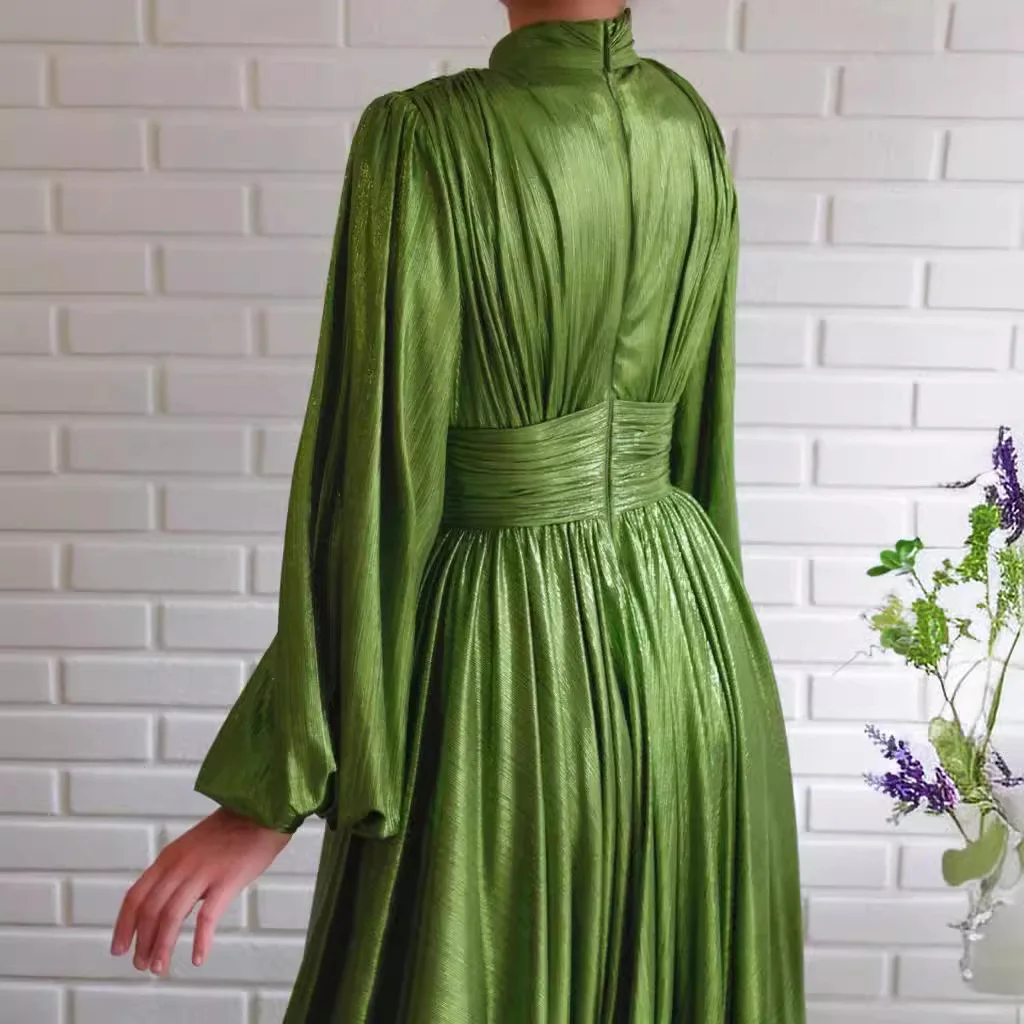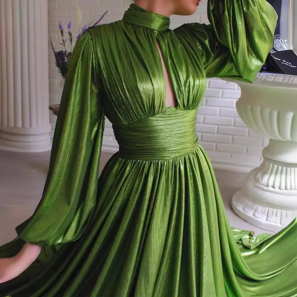 Women’s Evening Party Night Prom Dress Shiny Color Stand Neck Hollow Out Long Lantern Sleeve Pleated A Line Maxi Dress Female