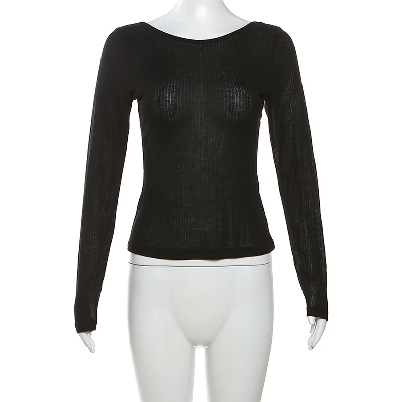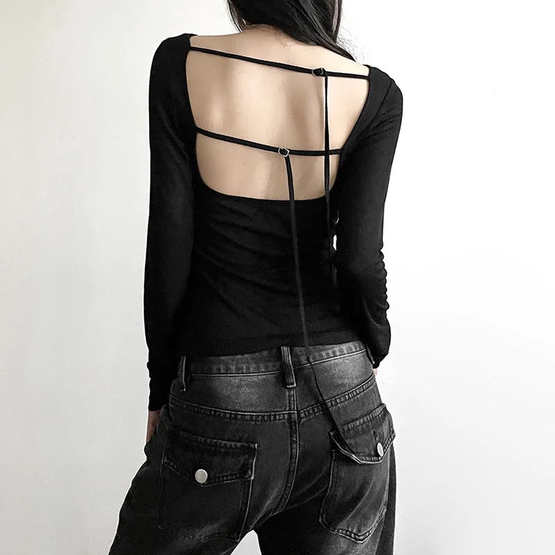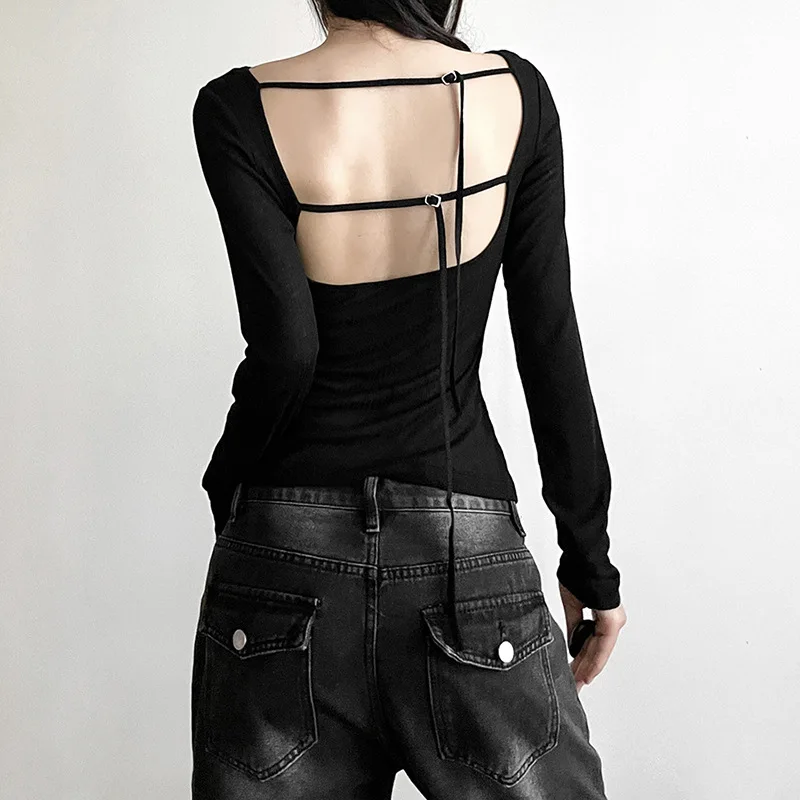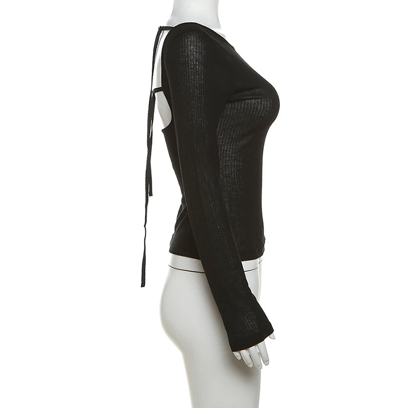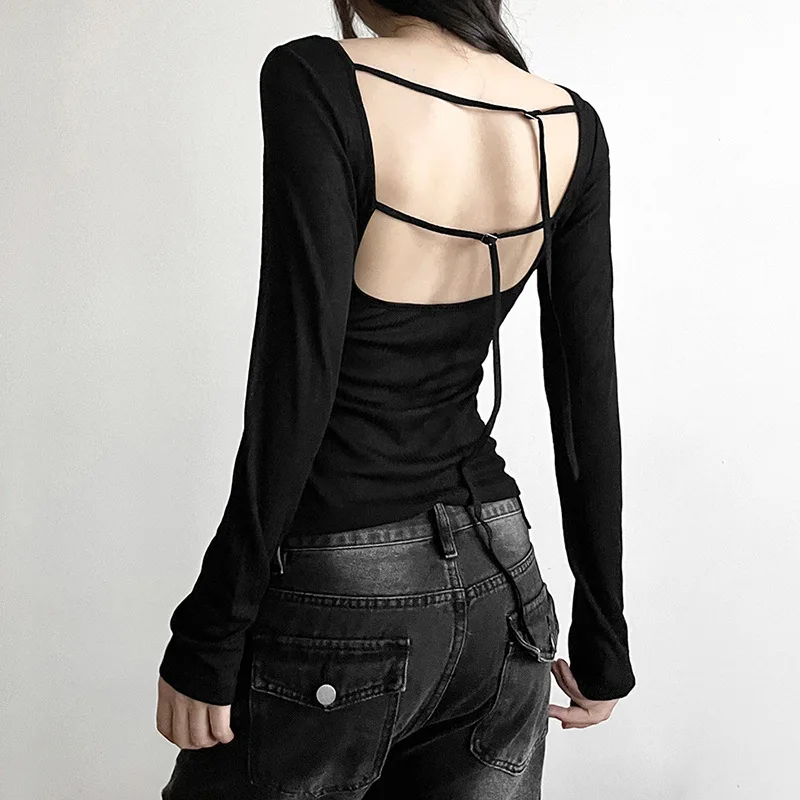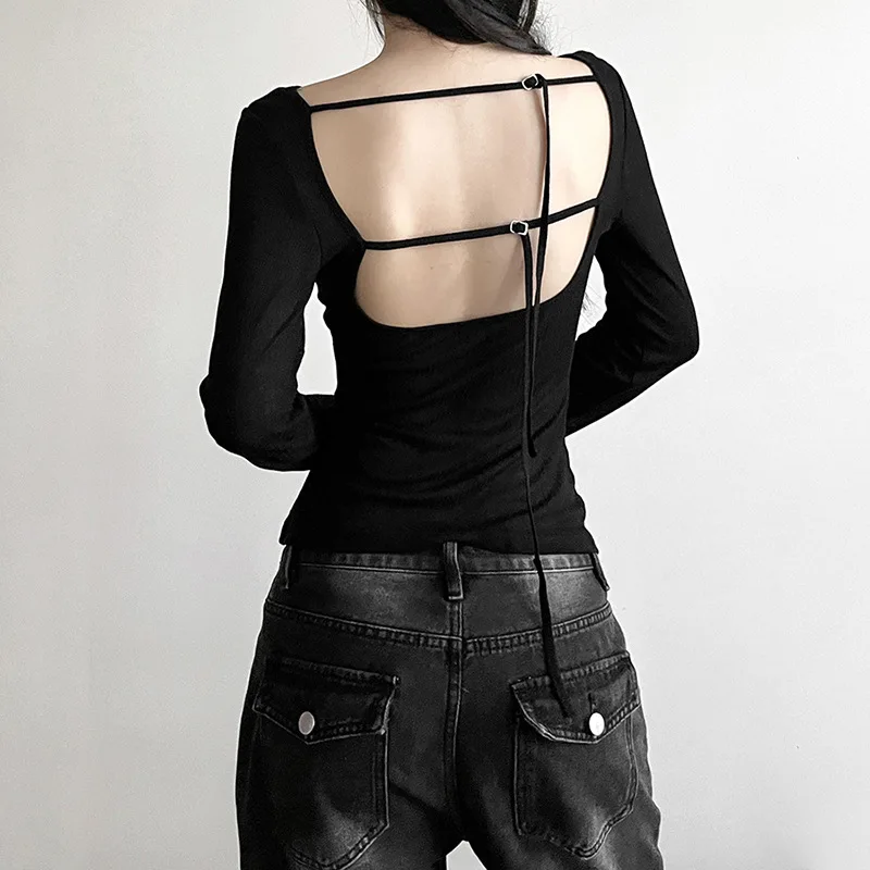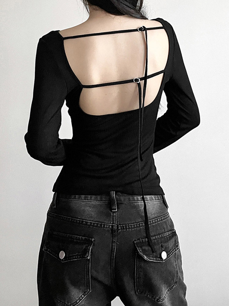 Women’s Long-Sleeved Slash Neck Backless T-Shirt Slim Fit Lace-Up Elastic Top Solid Color Autumn Fashion Crop Tee