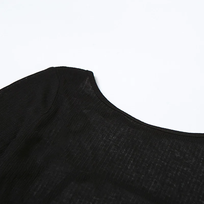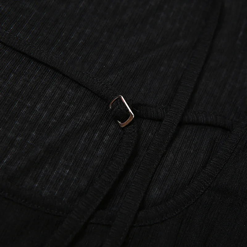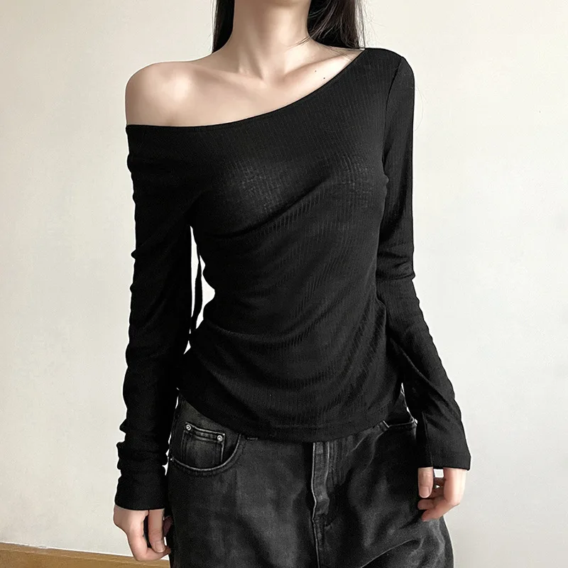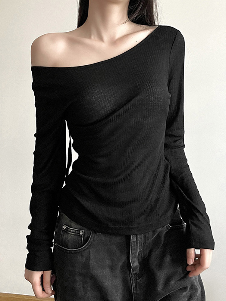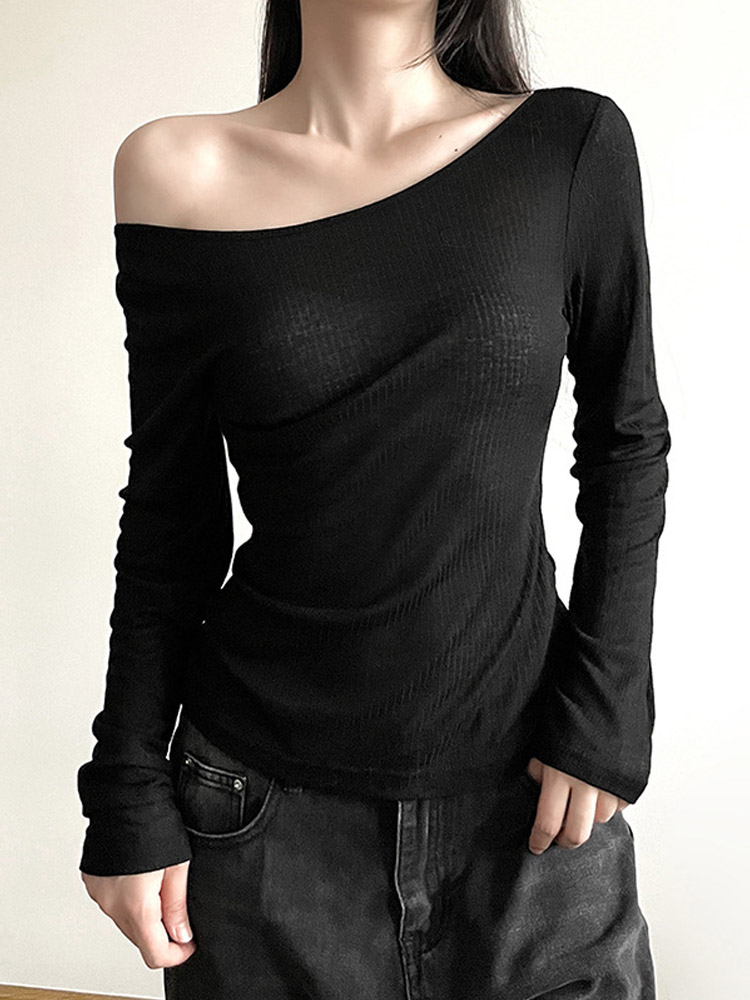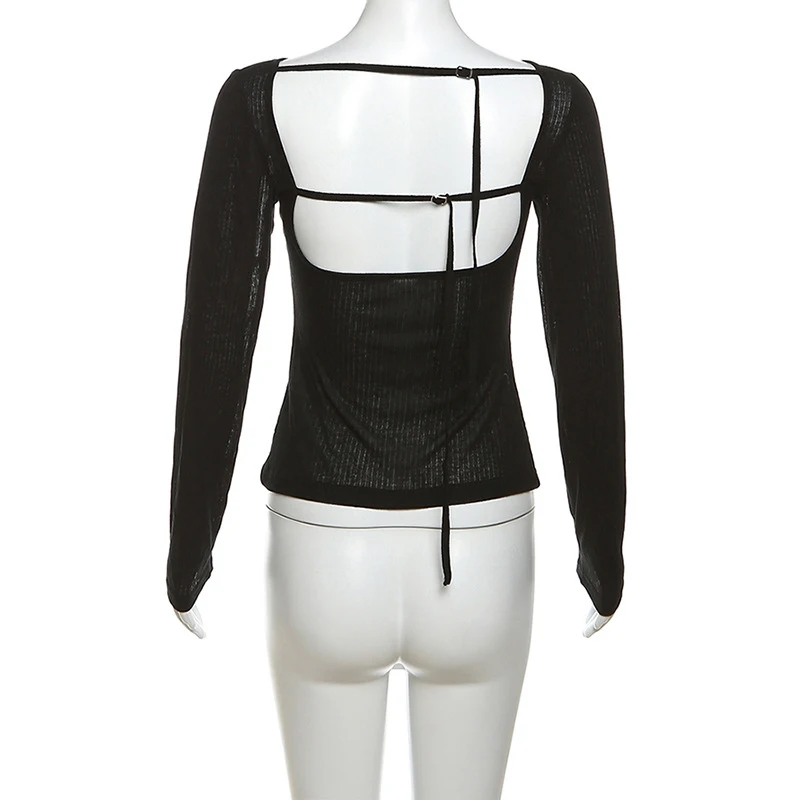 Women’s Long-Sleeved Slash Neck Backless T-Shirt Slim Fit Lace-Up Elastic Top Solid Color Autumn Fashion Crop Tee