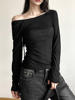 Women’s Long-Sleeved Slash Neck Backless T-Shirt Slim Fit Lace-Up Elastic Top Solid Color Autumn Fashion Crop Tee