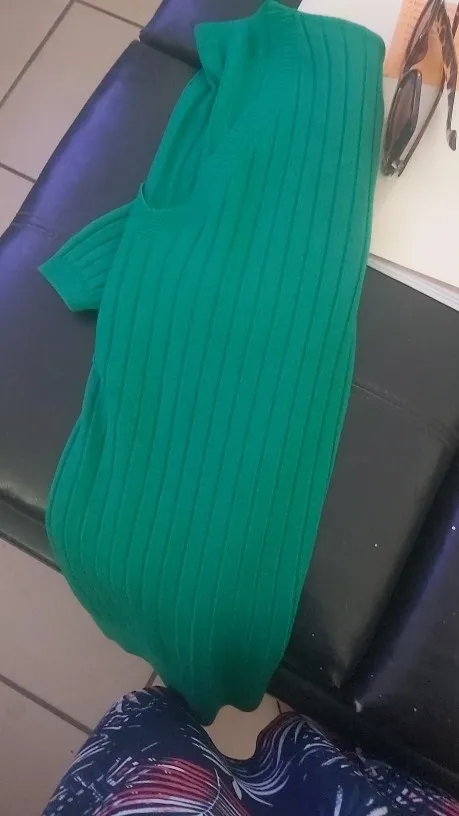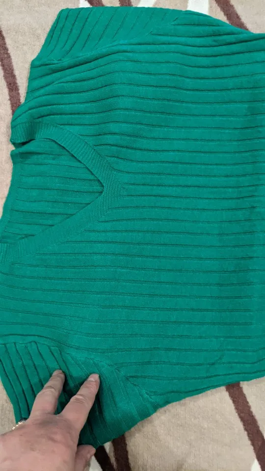 the color is greener than in the photo. The sleeves are much shorter and the overall length is a bit short for me, size OG 104 fits well, it's a bit loose. I liked the fabric.