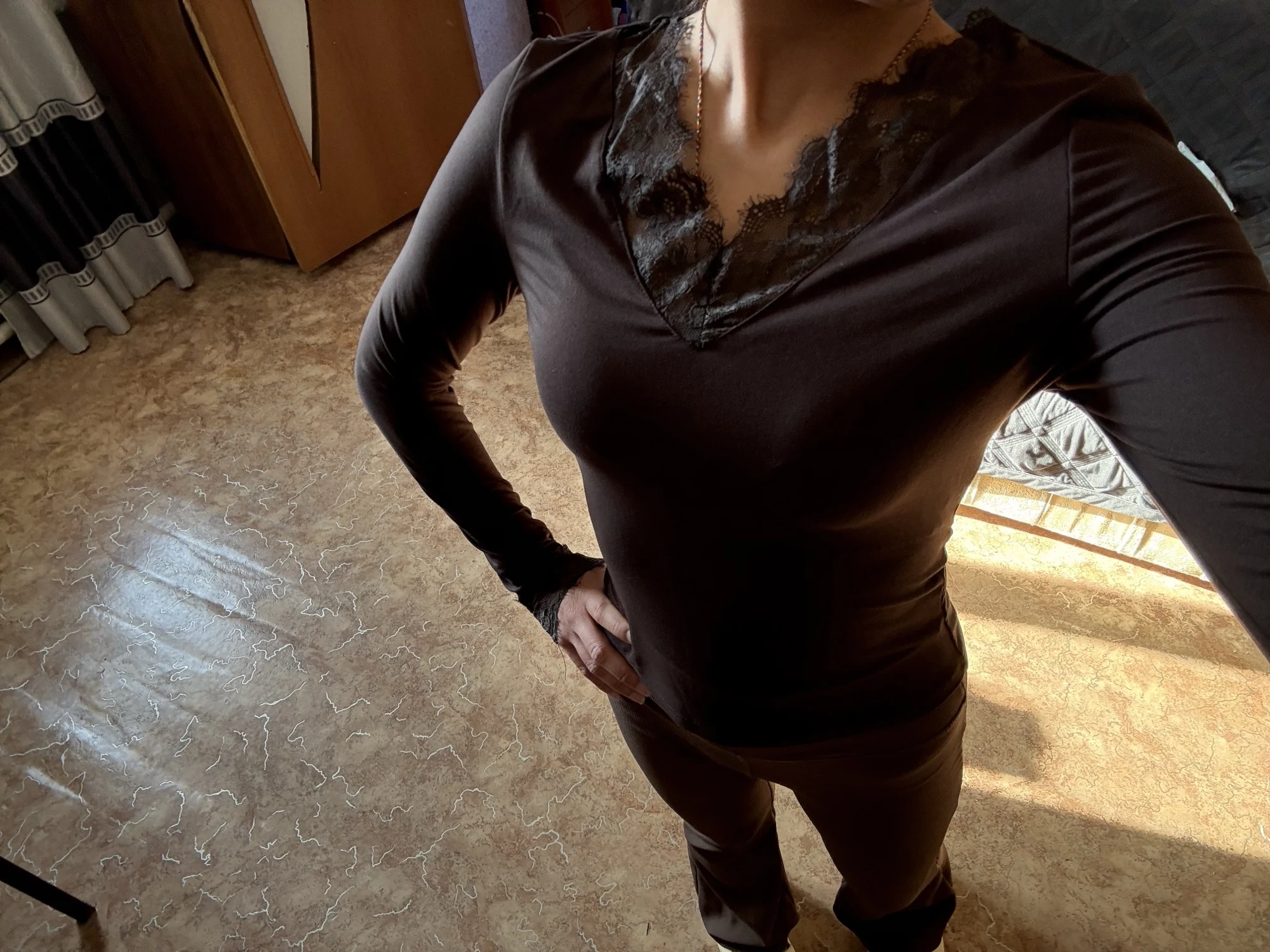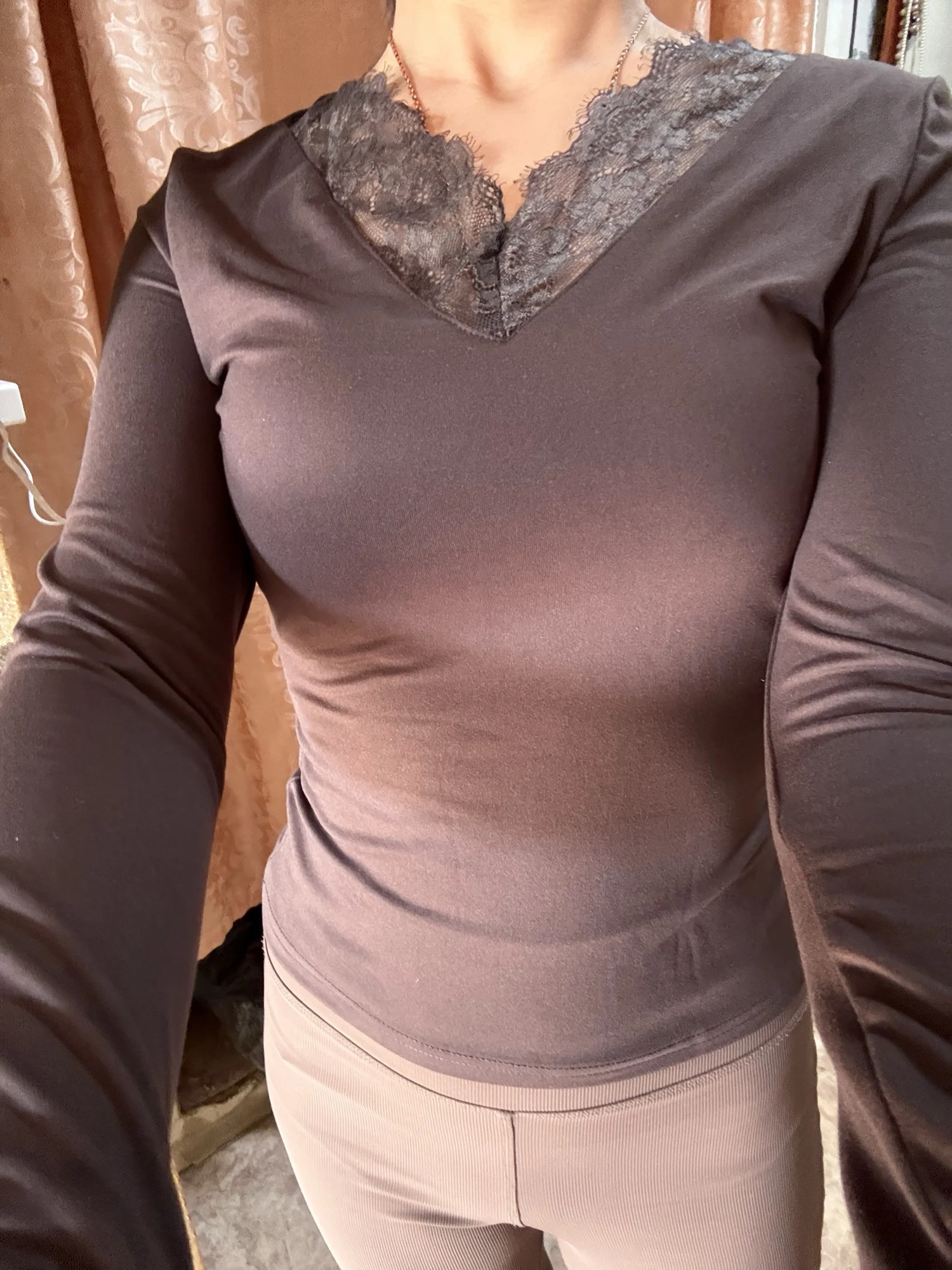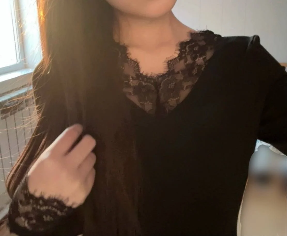 Excellent long-sleeve shirt, very pleasant material, feels like velvet, lace doesn't fray. I took size M for 42–44, it fits well in principle, but I would have been better off taking a size larger.