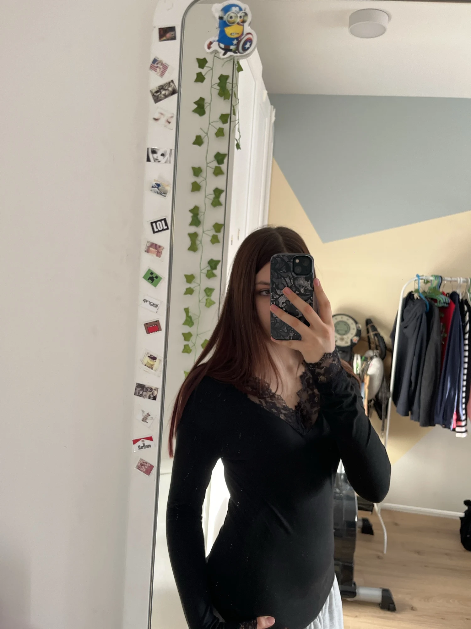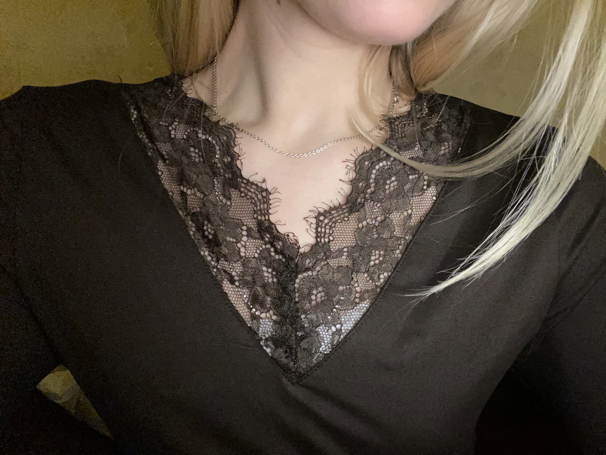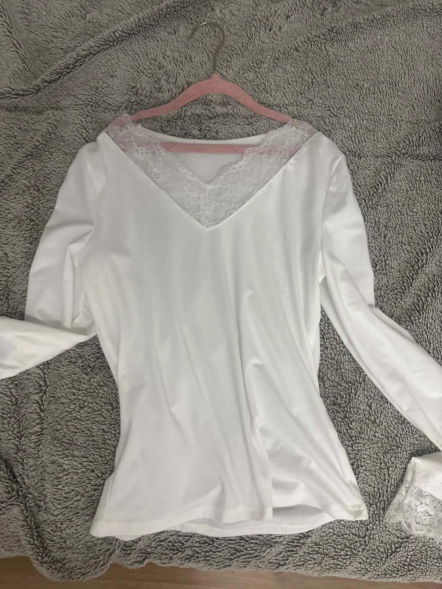 Excellent long-sleeve shirt, very pleasant material, feels like velvet, lace doesn't fray. I took size M for 42–44, it fits well in principle, but I would have been better off taking a size larger.