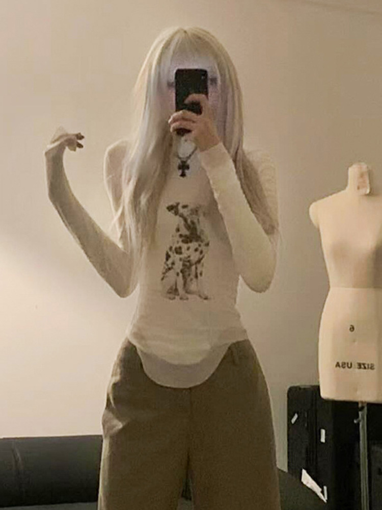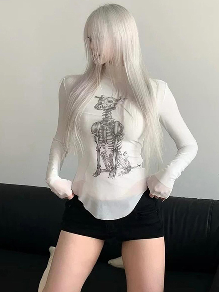 Y2K Sexy White Lace Mesh See Through Long Sleeve T-Shirt for Women Fashion Goth Dog Skull Print Half High Collar Slim Crop Tops