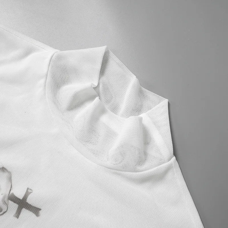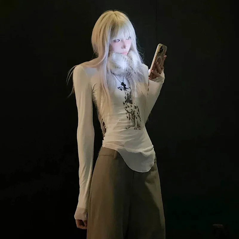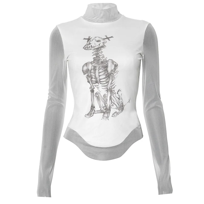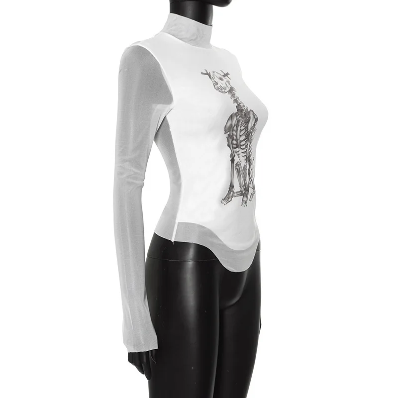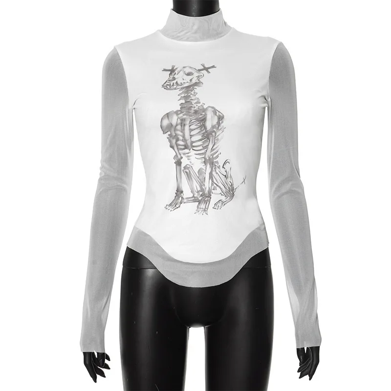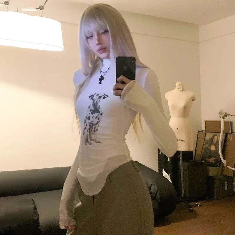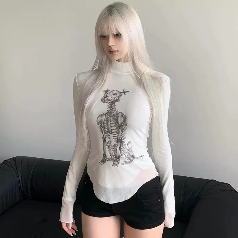 Y2K Sexy White Lace Mesh See Through Long Sleeve T-Shirt for Women Fashion Goth Dog Skull Print Half High Collar Slim Crop Tops